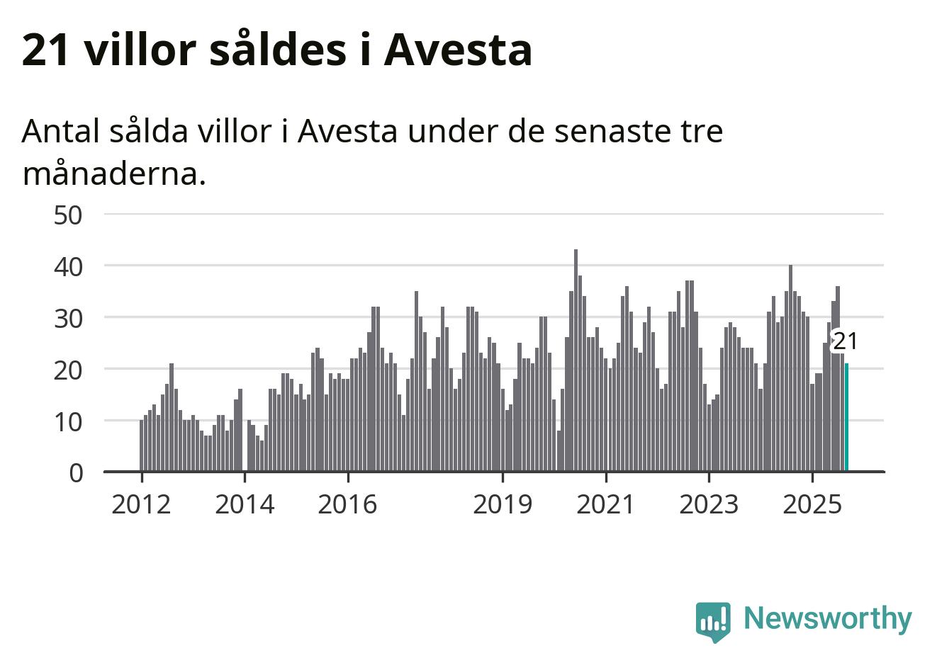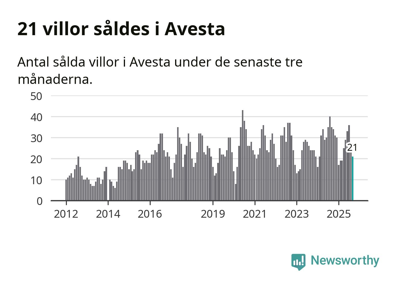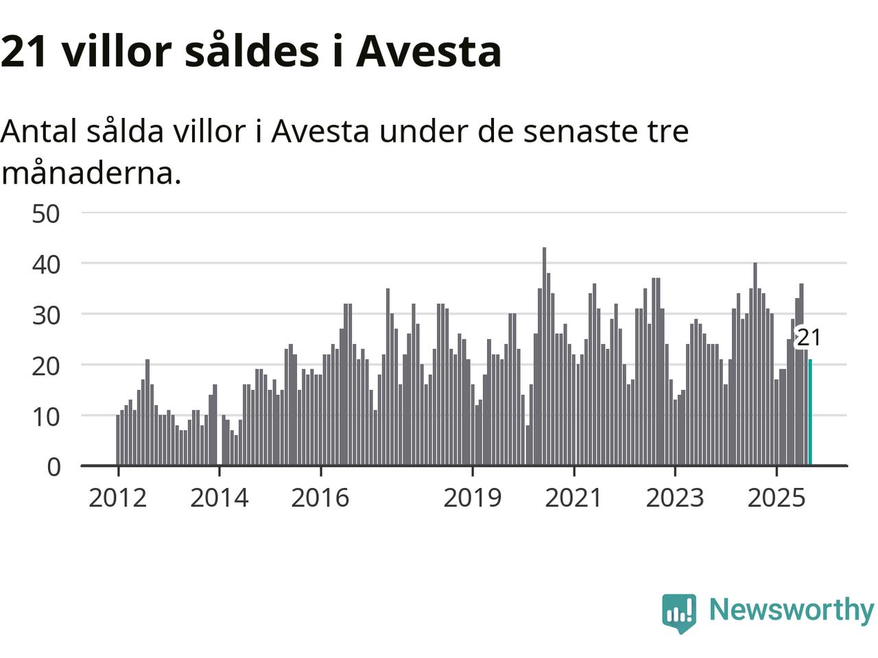 Mellan juli och september såldes 21 villor i Avesta kommun. Det är relativt få sett till aktiviteten på bostadsmarknaden i kommunen under de senaste tolv månaderna, samt det historiska snittet för den här tiden på året.