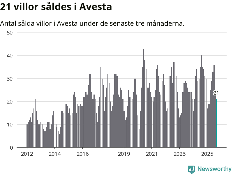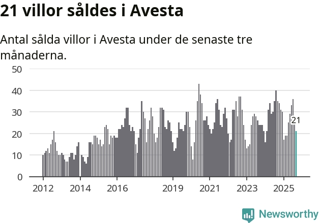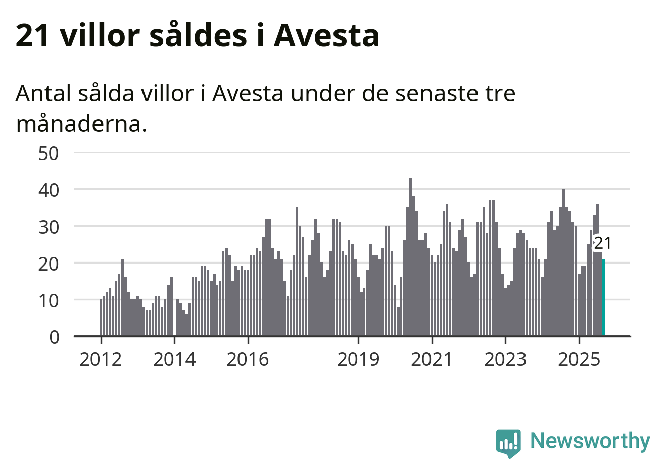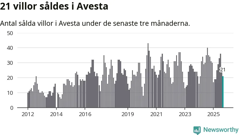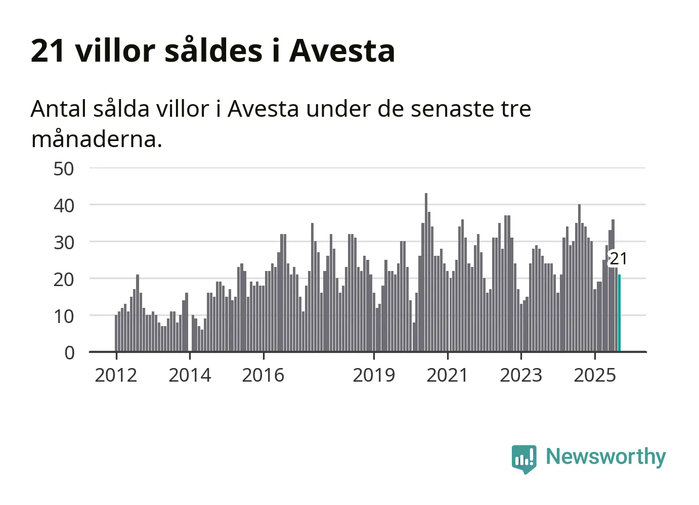Mellan juli och september såldes 21 villor i Avesta kommun. Det är relativt få sett till aktiviteten på bostadsmarknaden i kommunen under de senaste tolv månaderna, samt det historiska snittet för den här tiden på året.