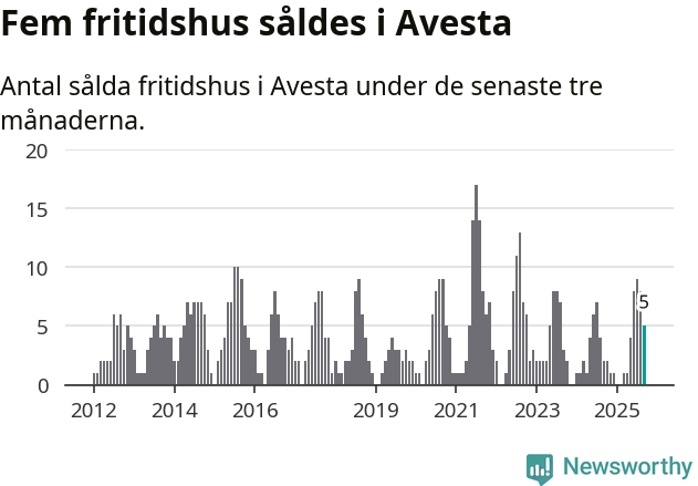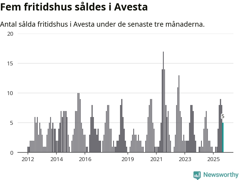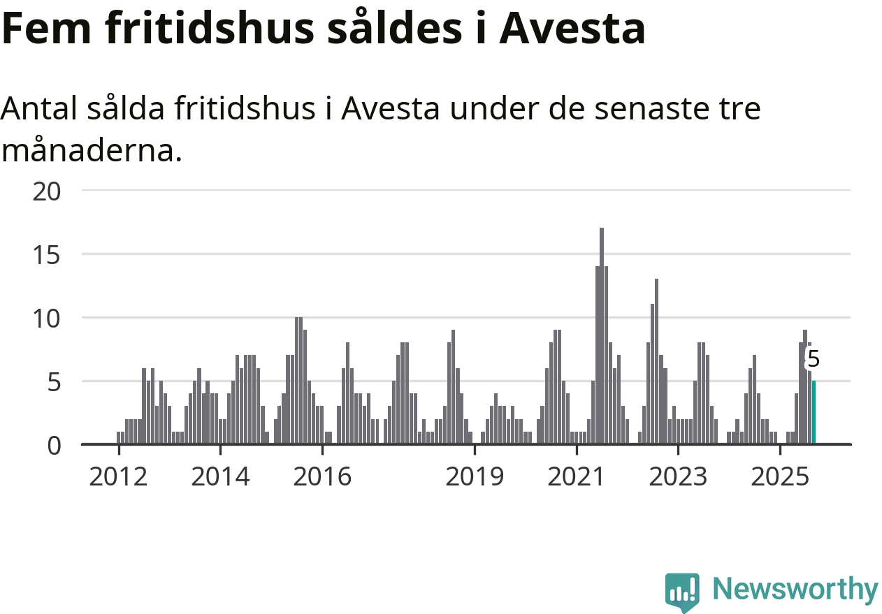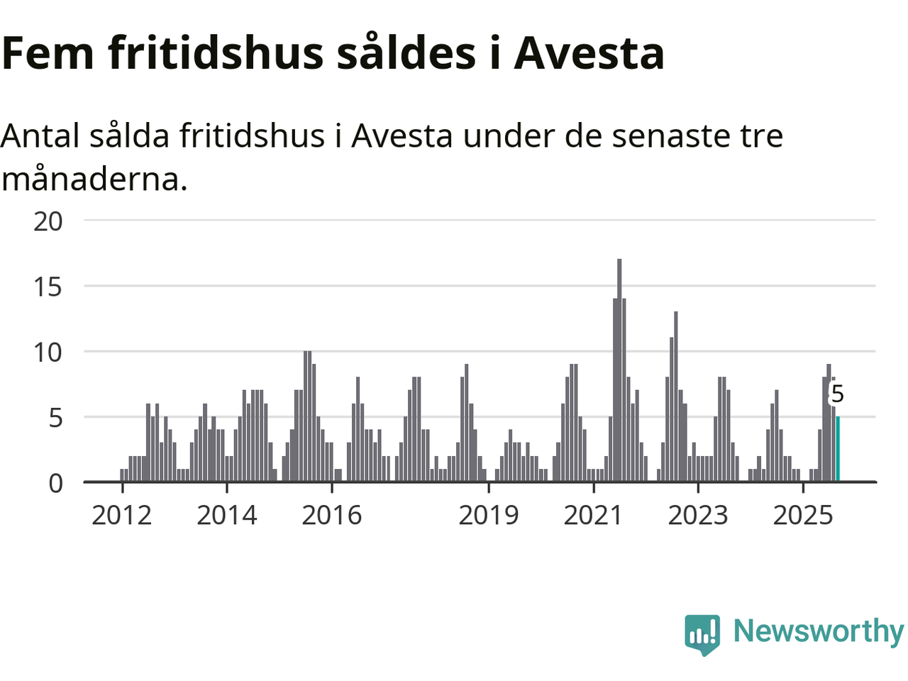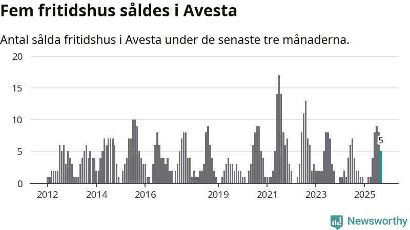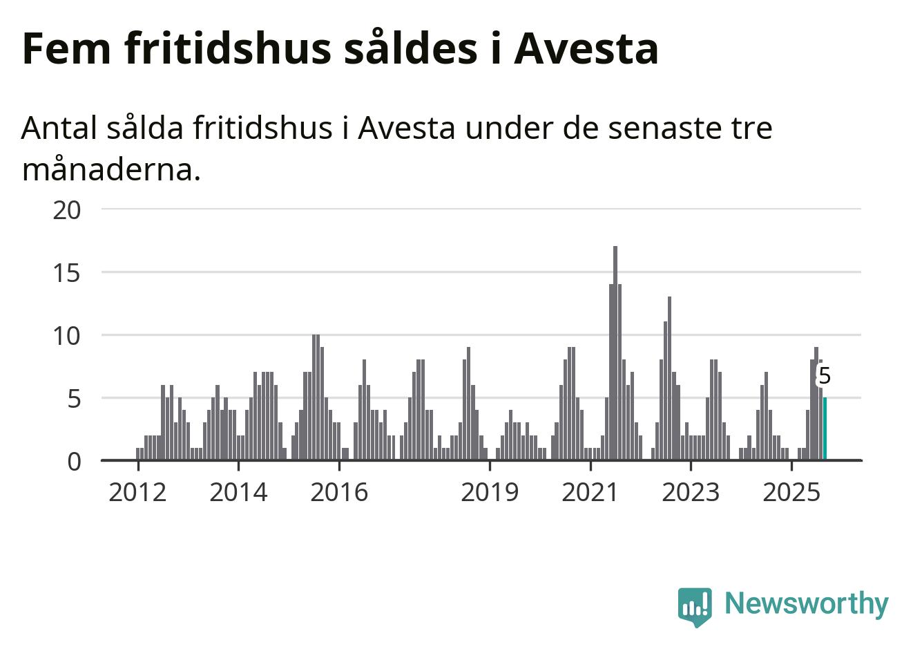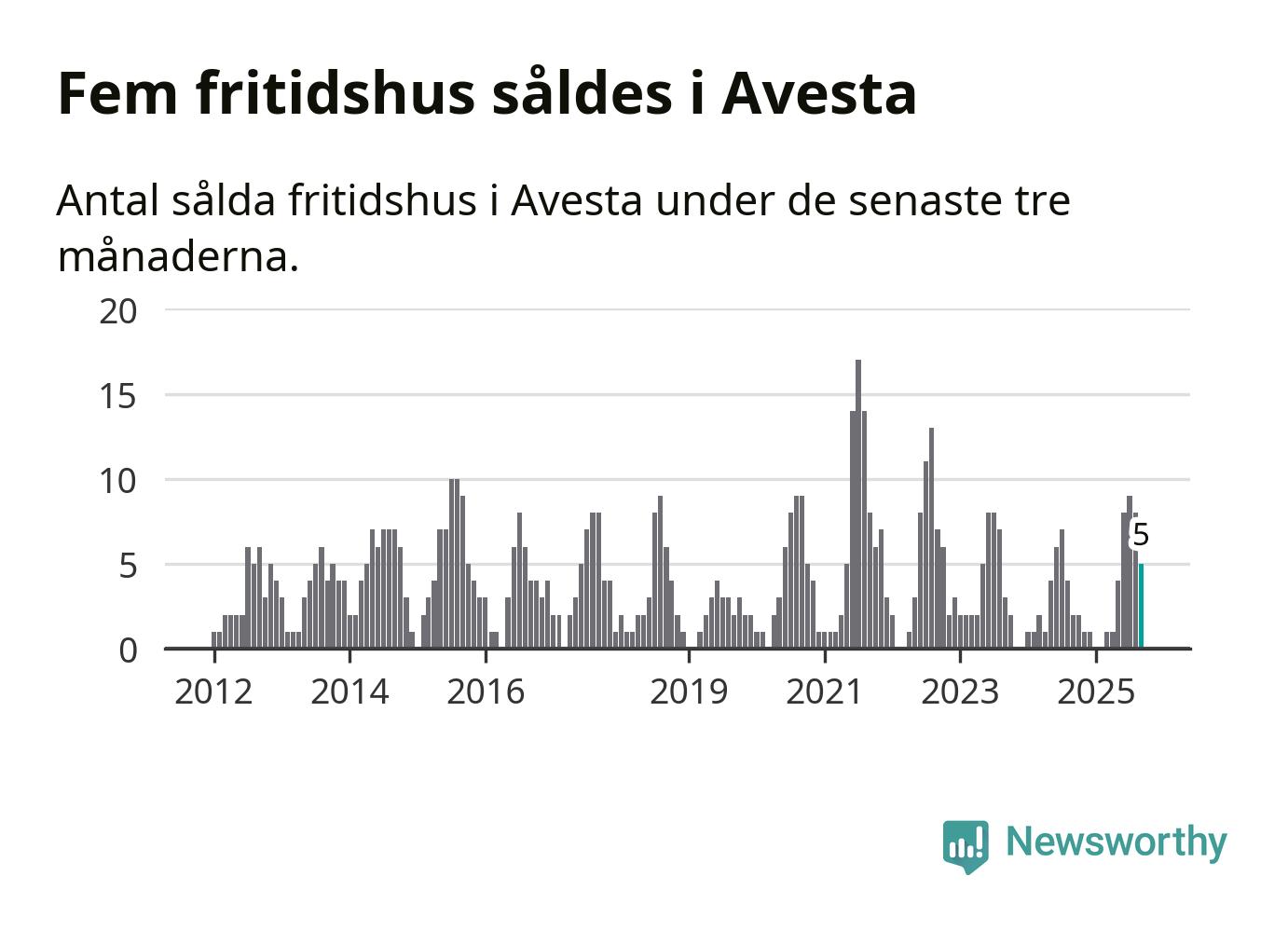 Mellan juli och september gjordes sammanlagt fem affärer med fritidshus i Avesta kommun. Det kan jämföras med två vid motsvarande tid i fjol.