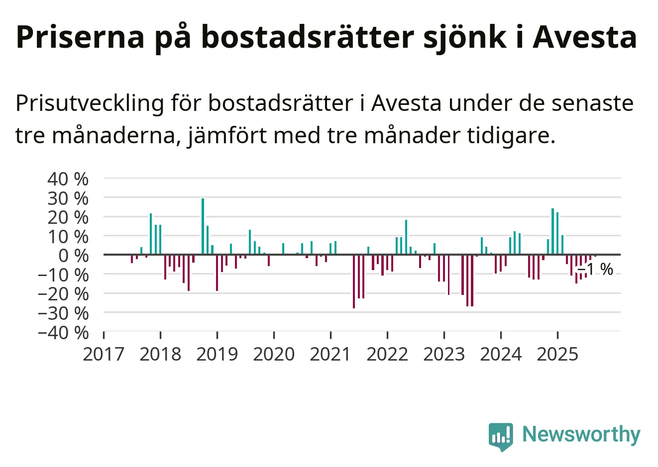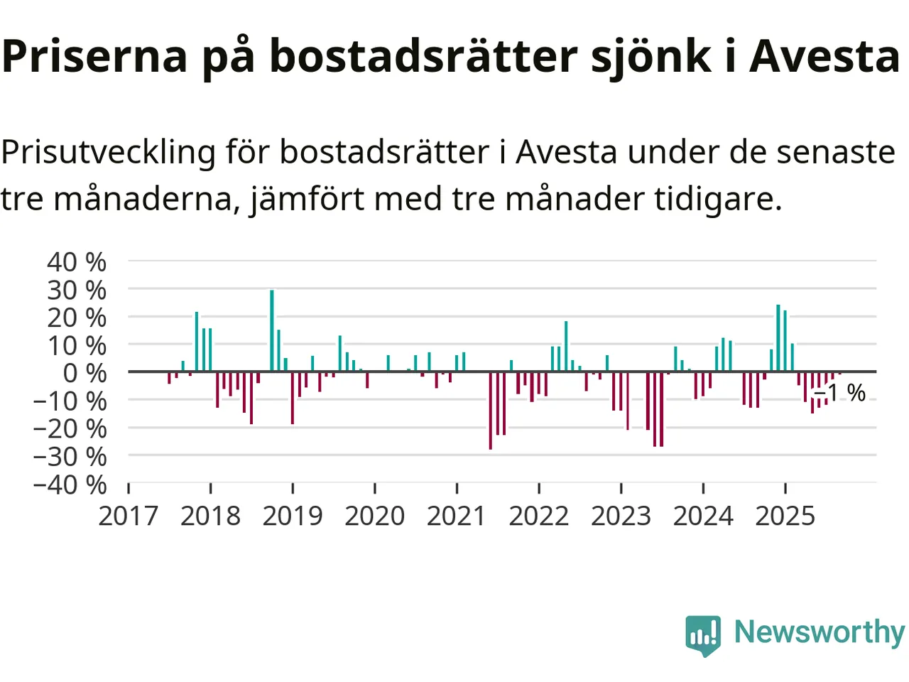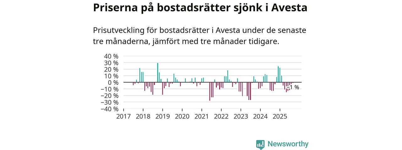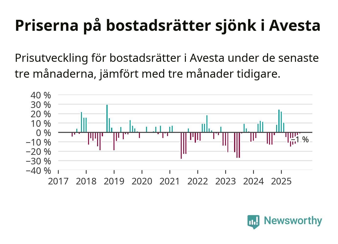 Priserna på bostadsrätter har gått ner i Avesta kommun. Medelpriset på försäljningarna under de senaste tre månaderna visar på en nedgång med 1 procent.
