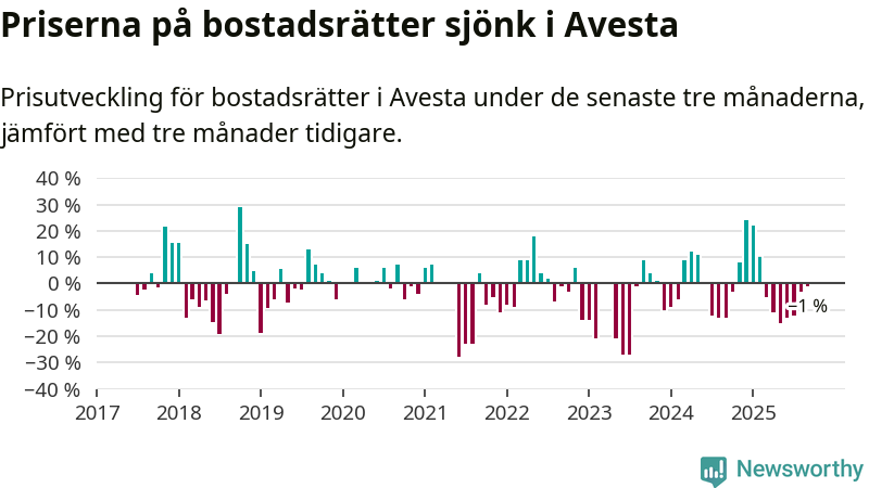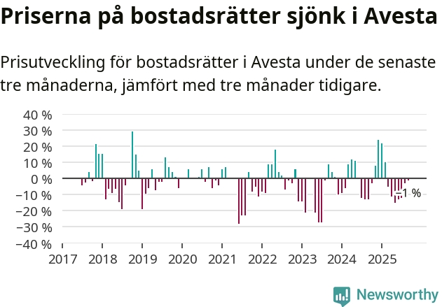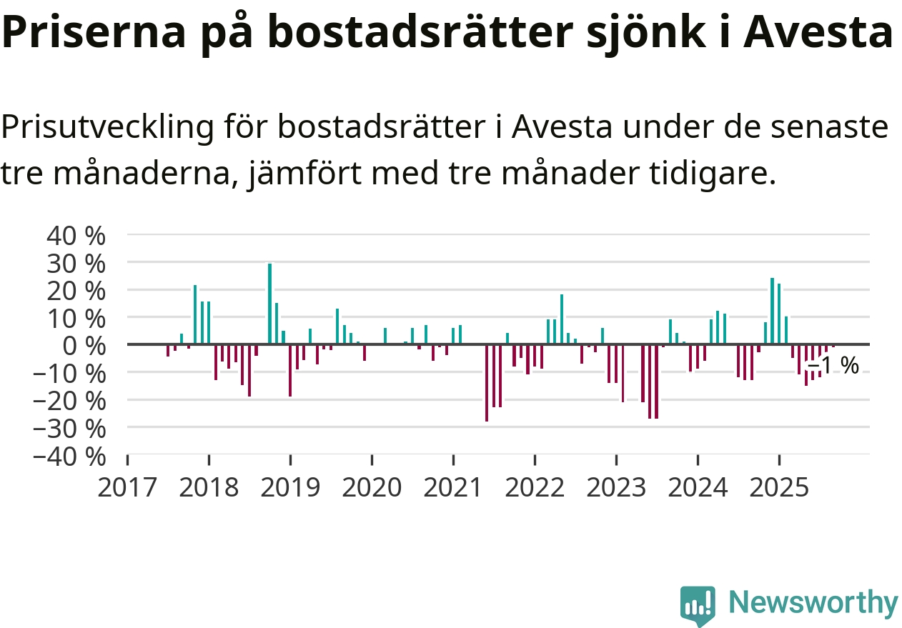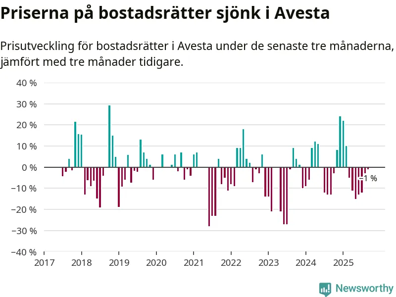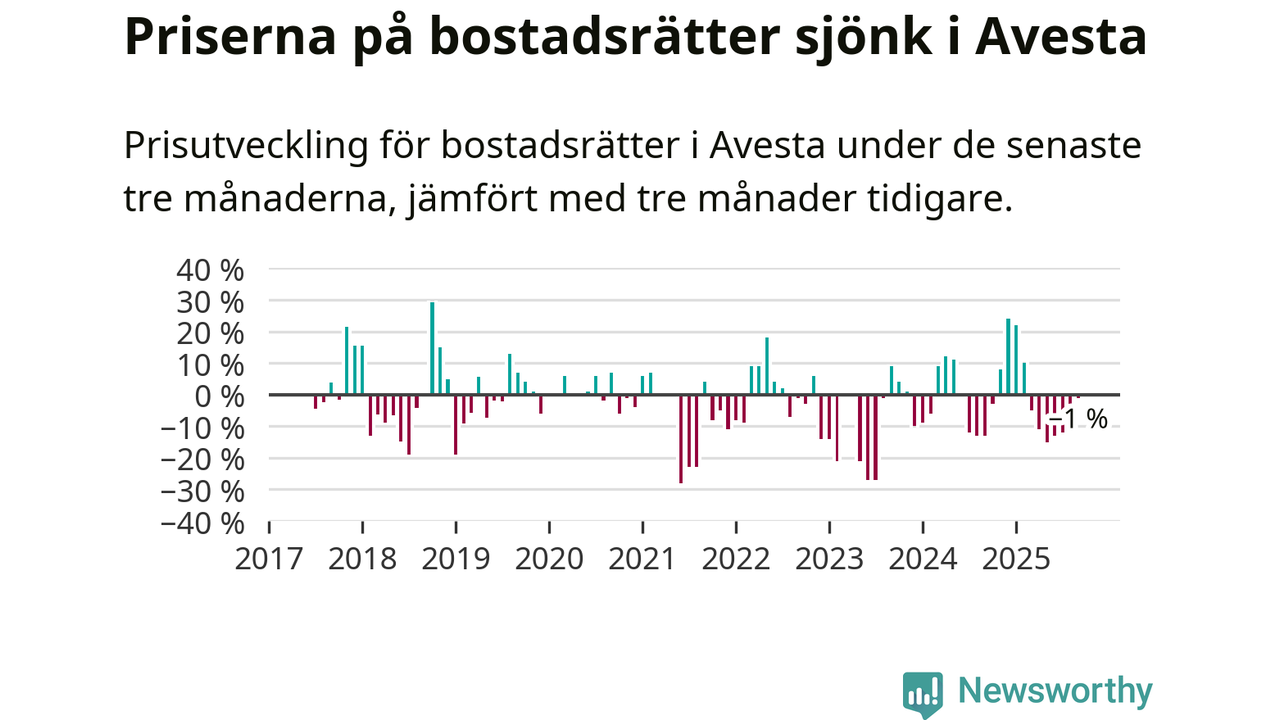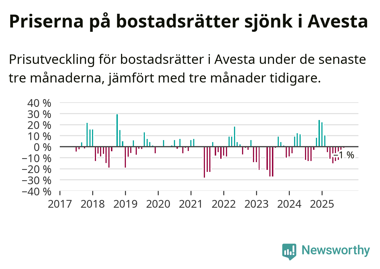 Priserna på bostadsrätter har gått ner i Avesta kommun. Medelpriset på försäljningarna under de senaste tre månaderna visar på en nedgång med 1 procent.