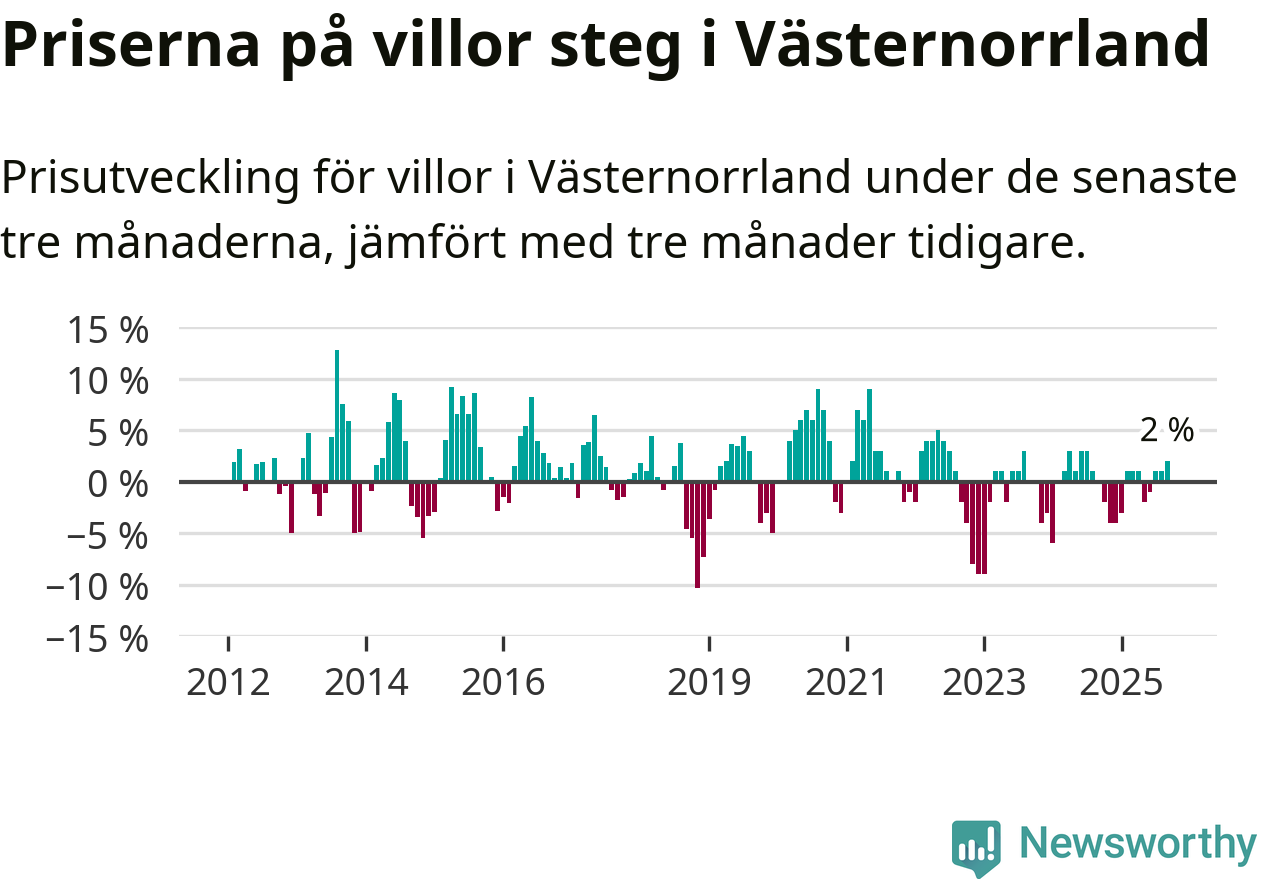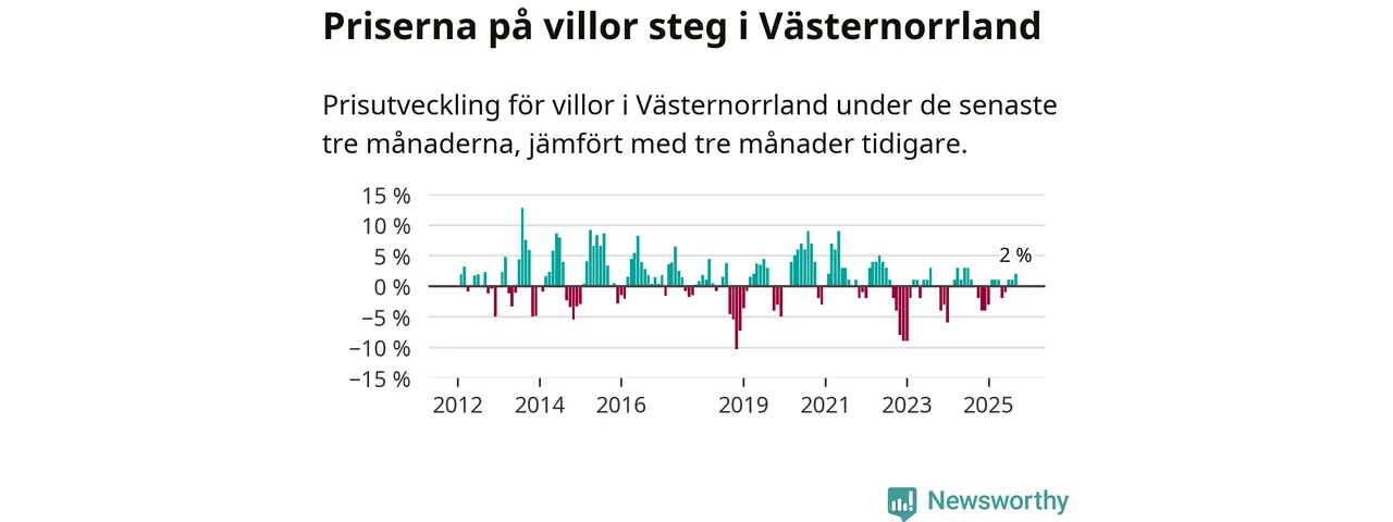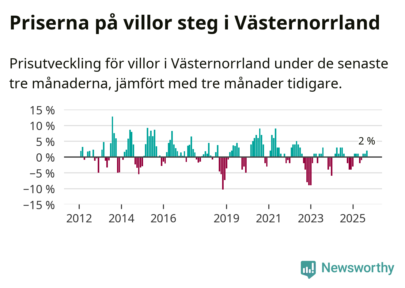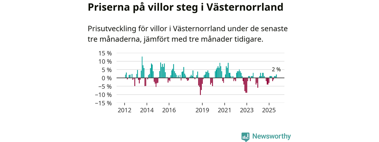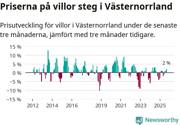 Villapriserna har gått upp i Västernorrlands län. Medelpriset på försäljningarna under de senaste tre månaderna visar på en uppgång med 2 procent.