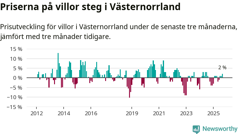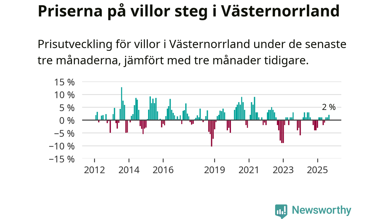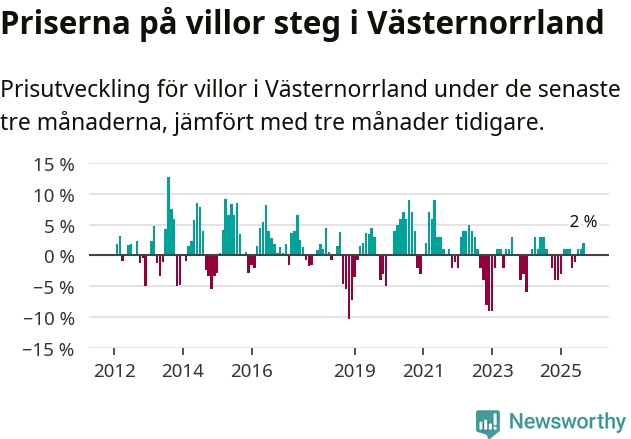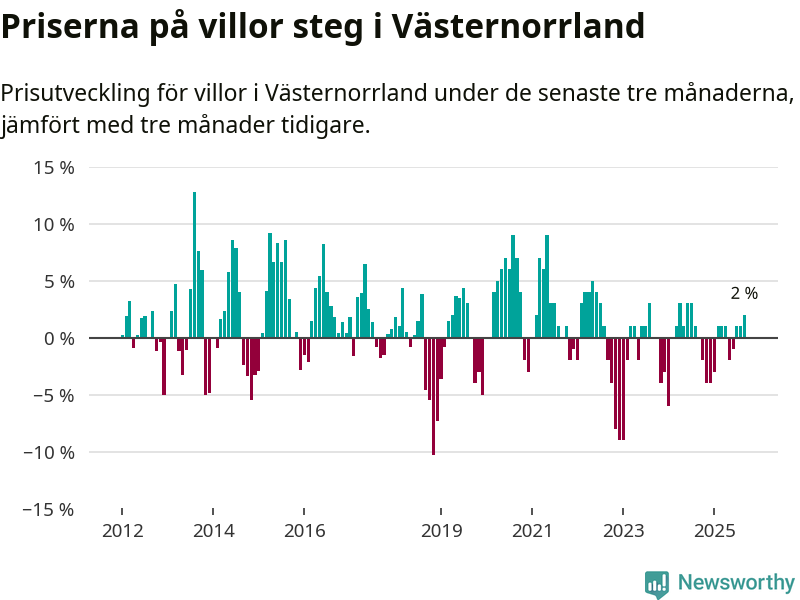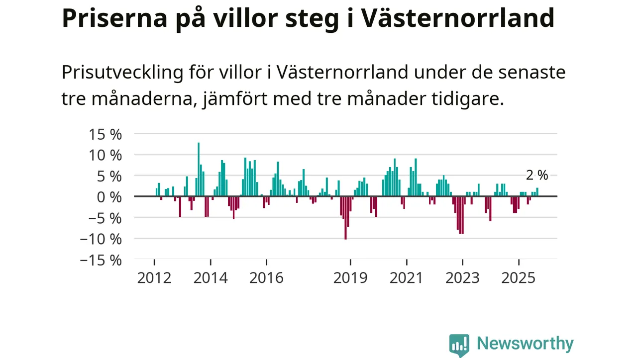 Villapriserna har gått upp i Västernorrlands län. Medelpriset på försäljningarna under de senaste tre månaderna visar på en uppgång med 2 procent.