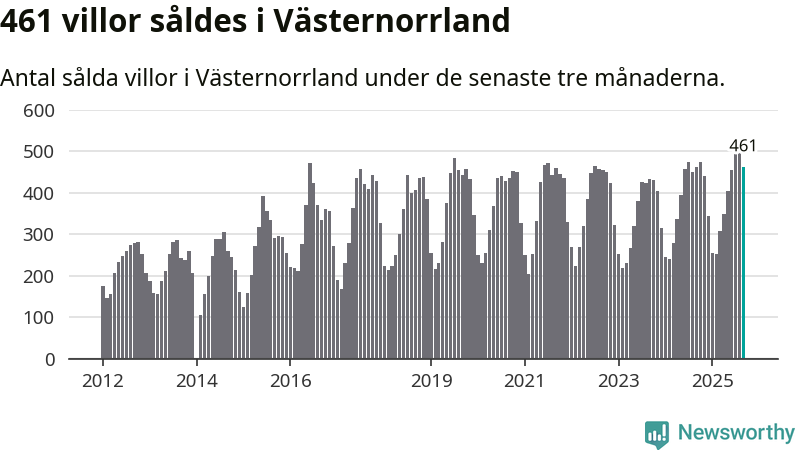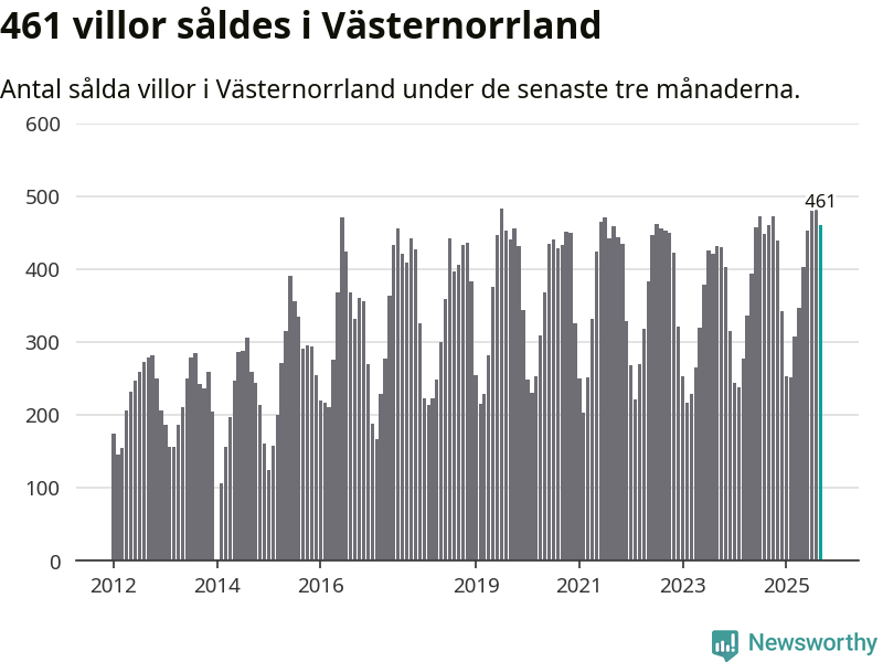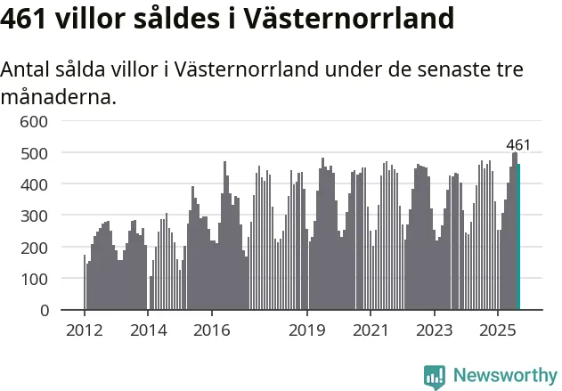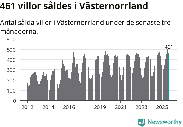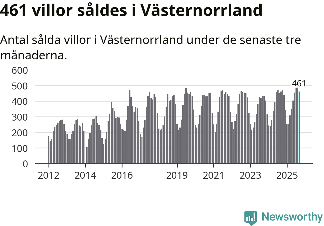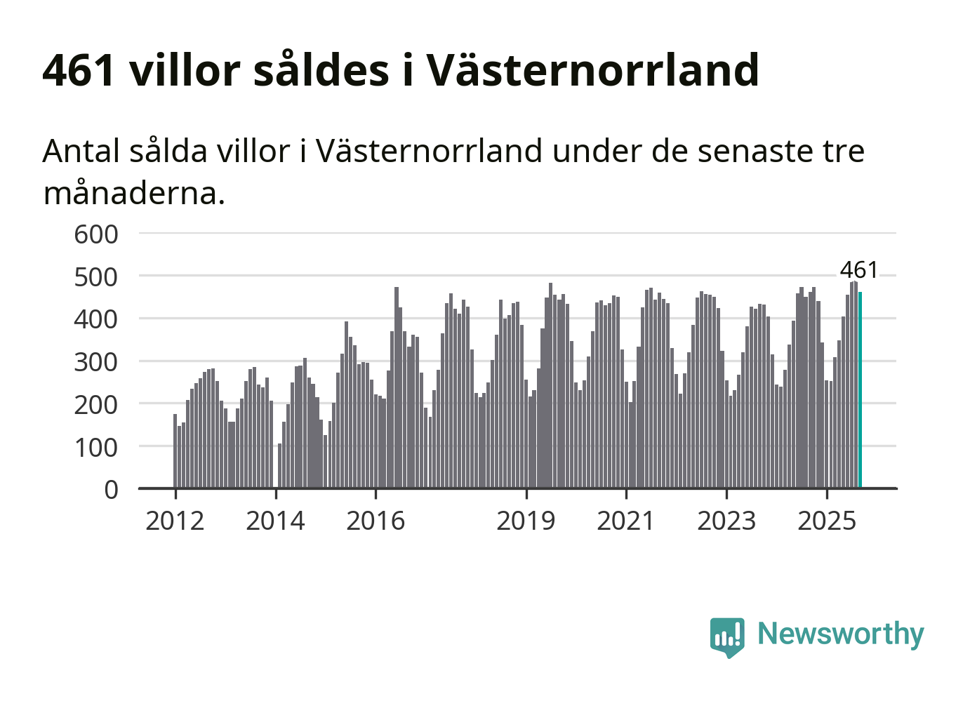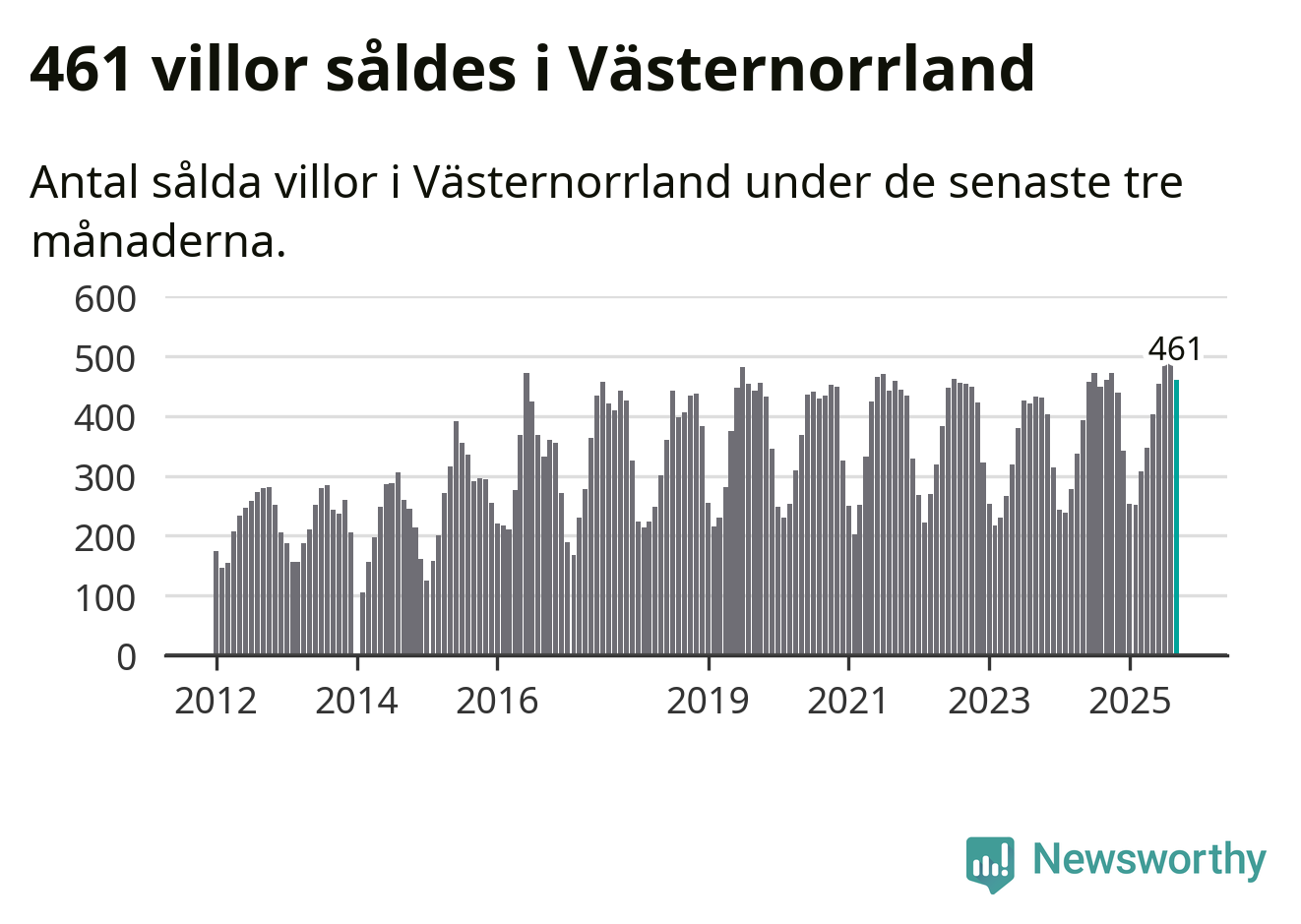 Sammanlagt såldes 461 villor i Västernorrlands län mellan juli och september till ett genomsnittligt pris på 1,9 miljoner kronor. I fjol gjordes 461 affärer vid den här tiden på året.
