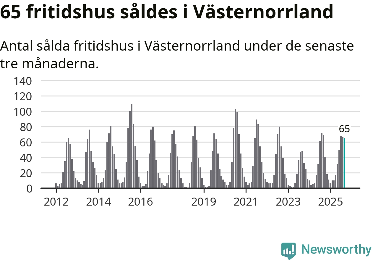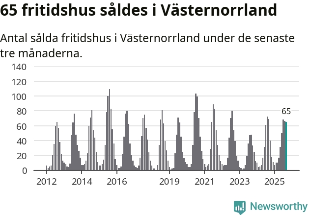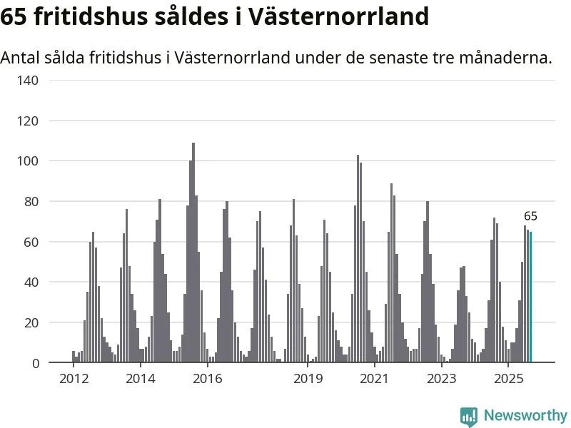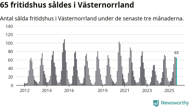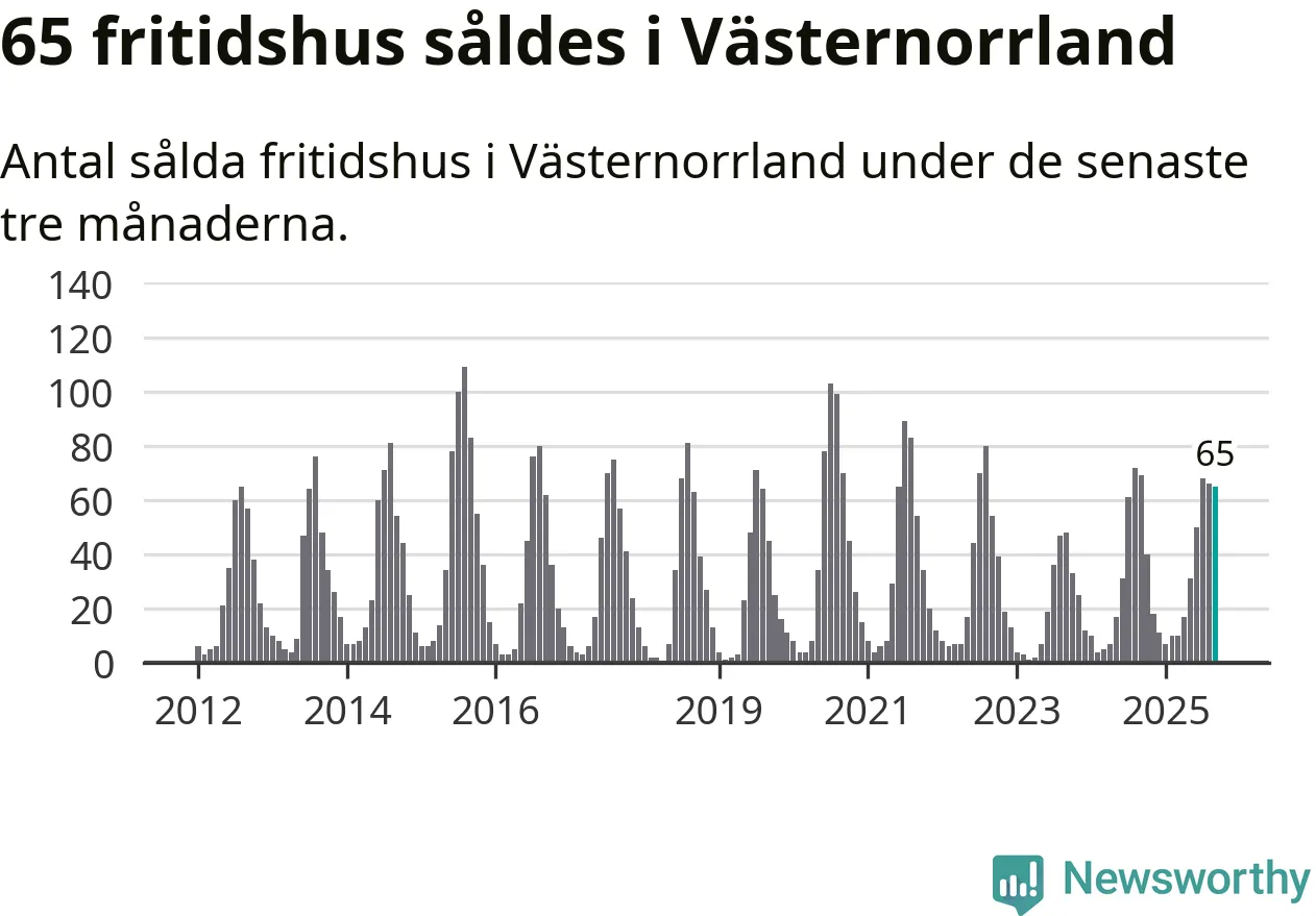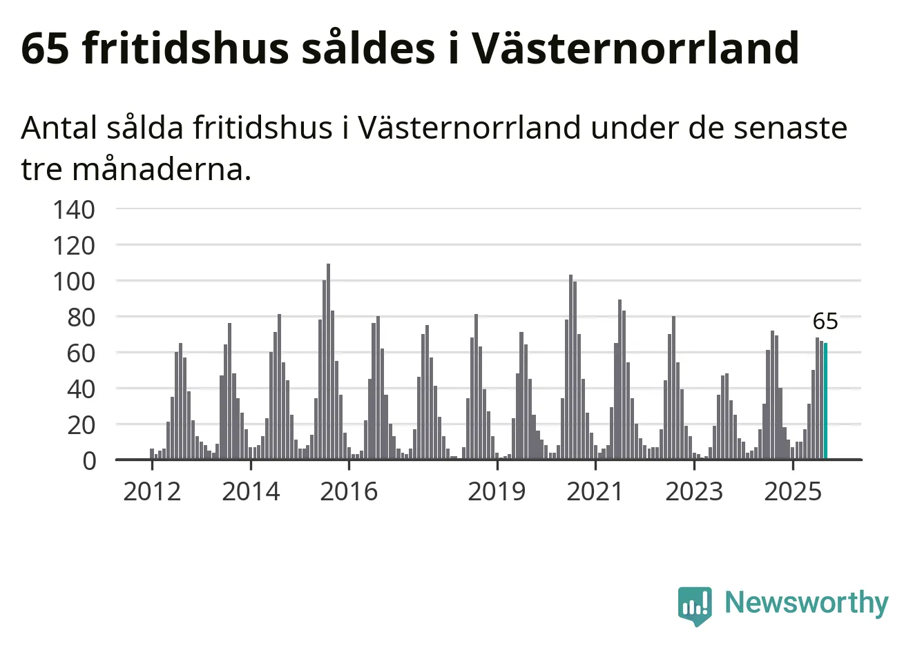 Sammanlagt såldes 65 fritidshus i Västernorrlands län mellan juli och september till ett genomsnittligt pris på 1,4 miljoner kronor. I fjol gjordes 69 affärer vid den här tiden på året.