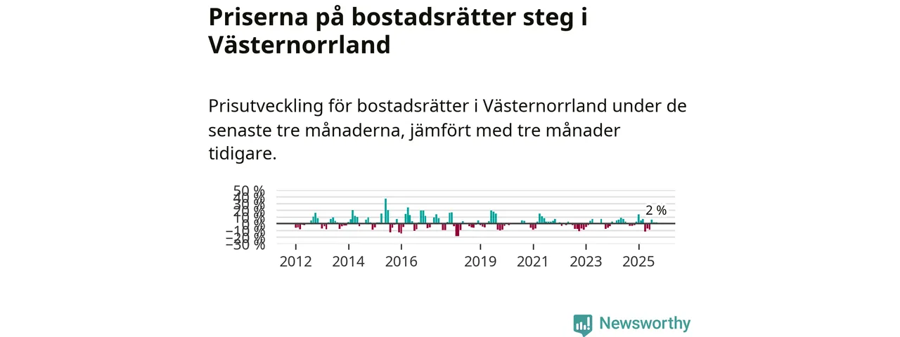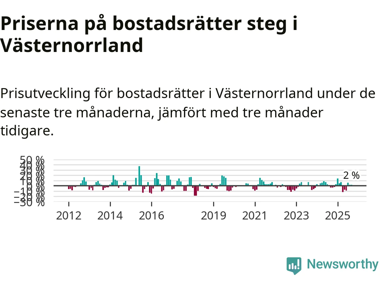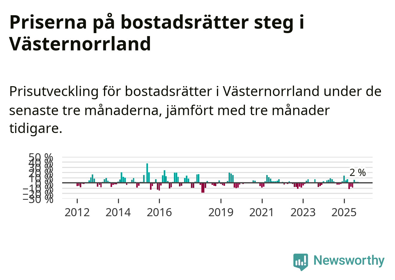 Priserna på bostadsrätter har gått upp i Västernorrlands län. Medelpriset på försäljningarna under de senaste tre månaderna visar på en uppgång med 2 procent.