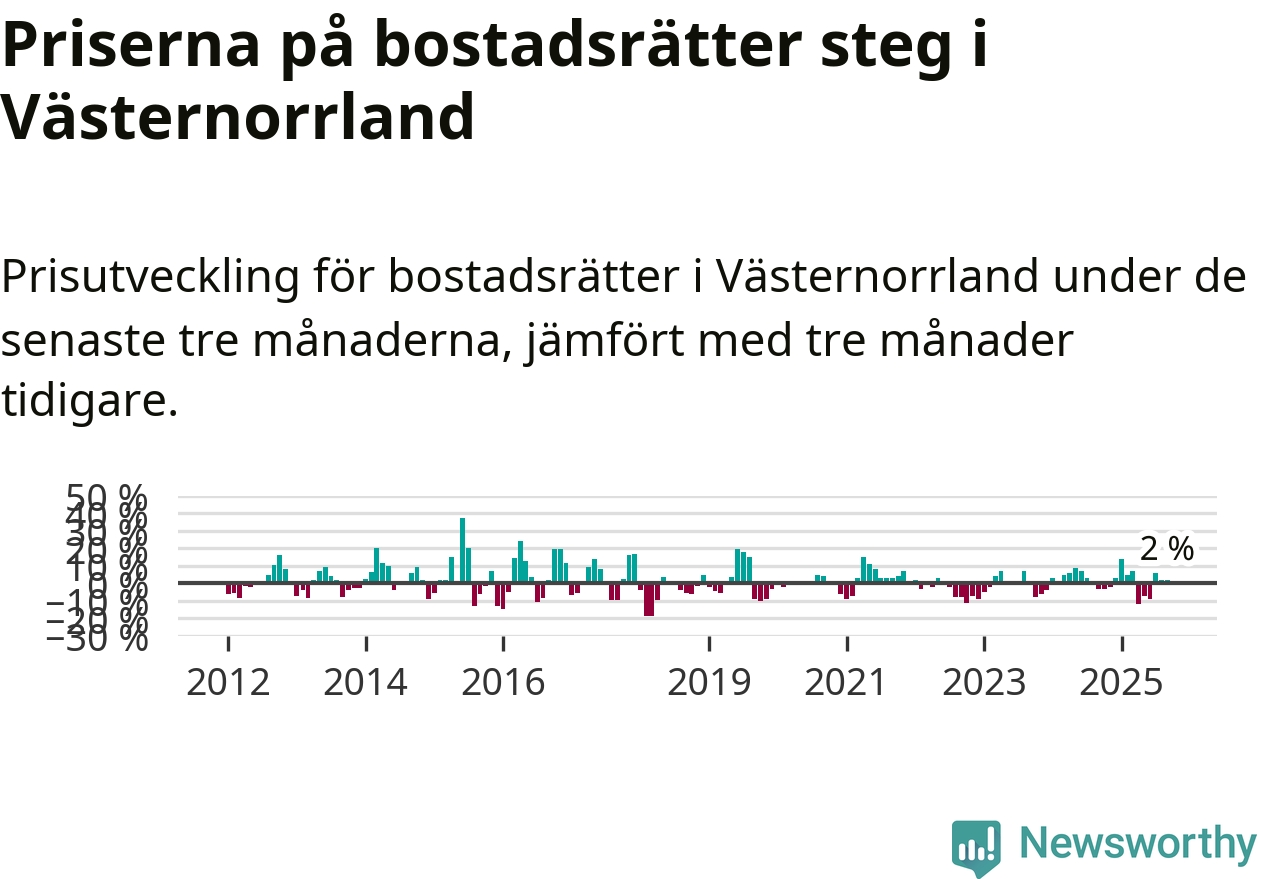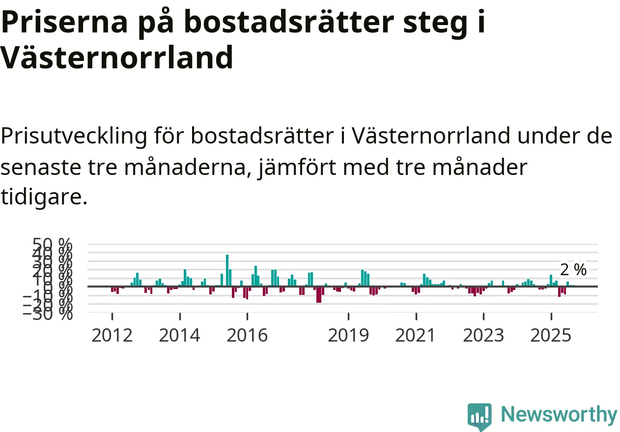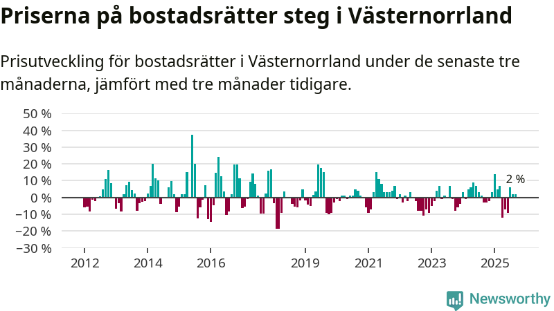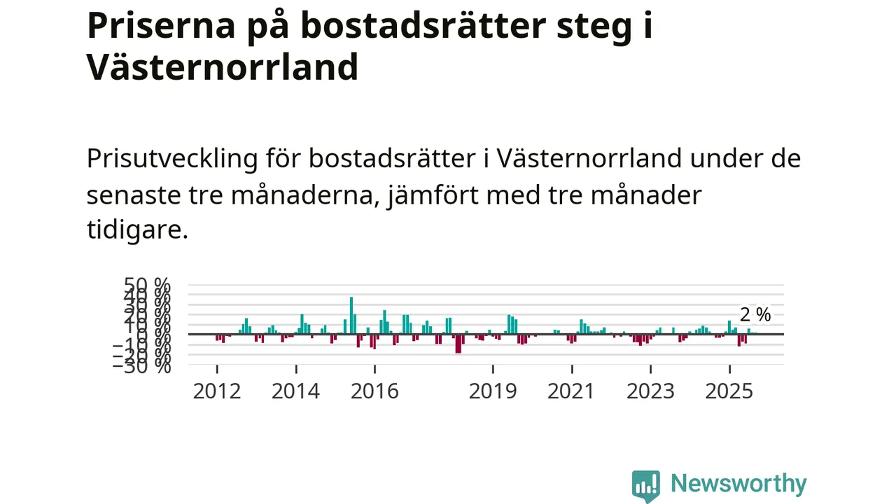 Priserna på bostadsrätter har gått upp i Västernorrlands län. Medelpriset på försäljningarna under de senaste tre månaderna visar på en uppgång med 2 procent.