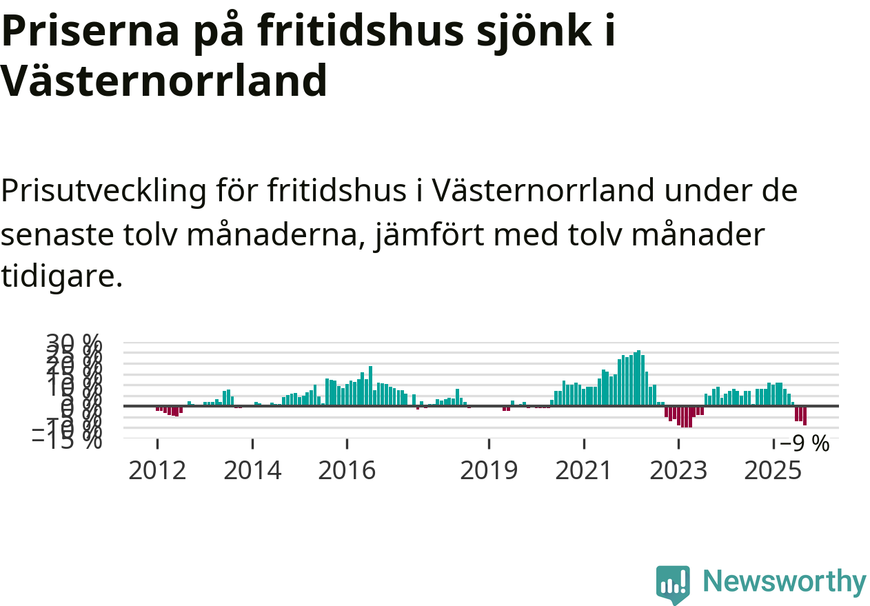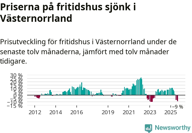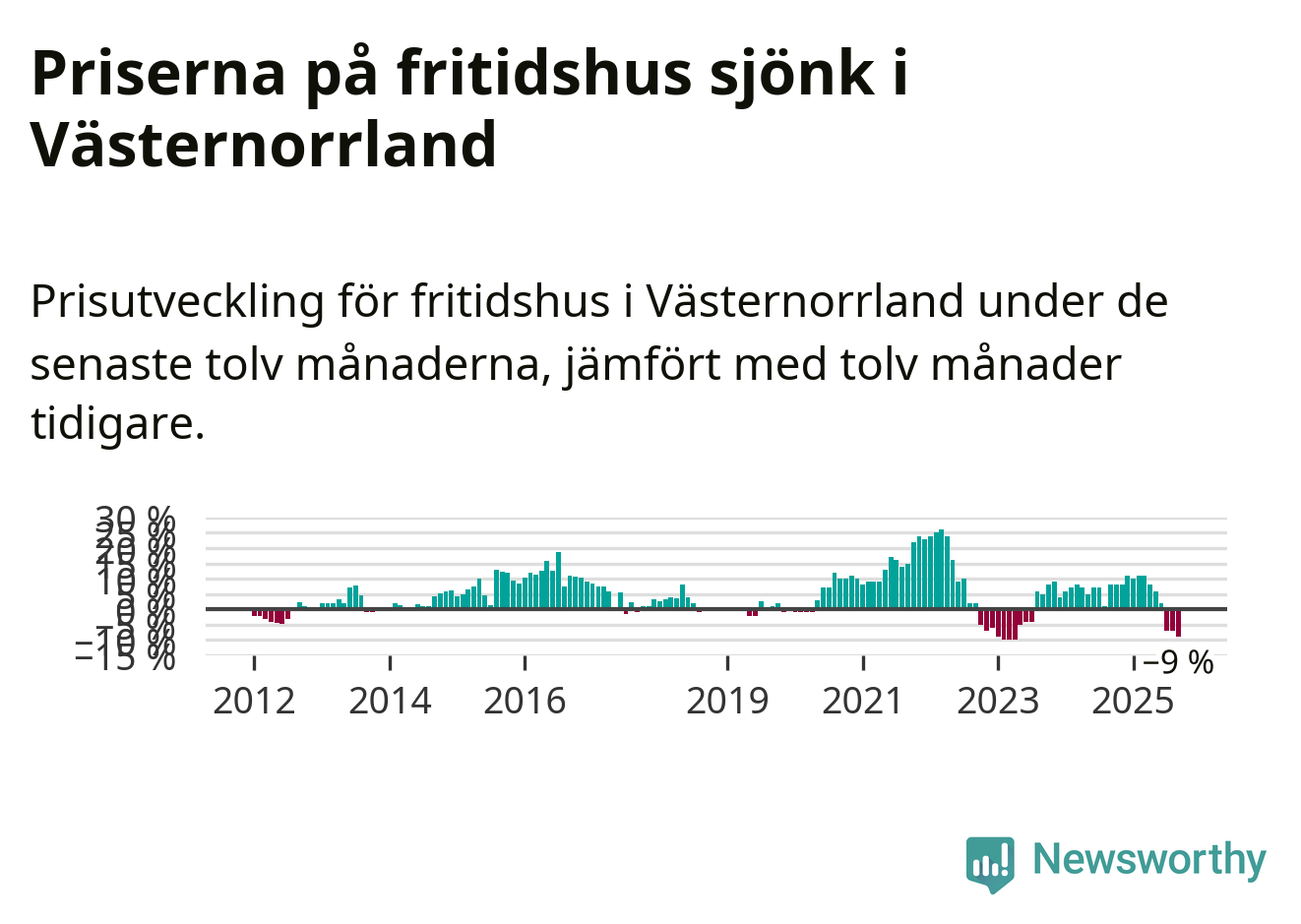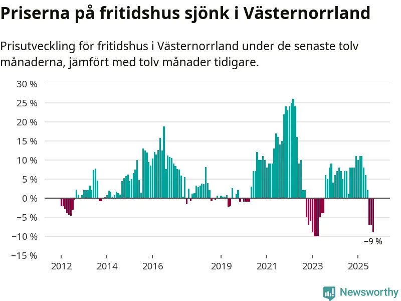 Priserna på fritidshus sjönk mellan oktober 2024 och september med 9 procent i Västernorrlands län. Det är en betydande nedgång jämfört med det gångna året då priserna i snitt ökat med 4 procent.