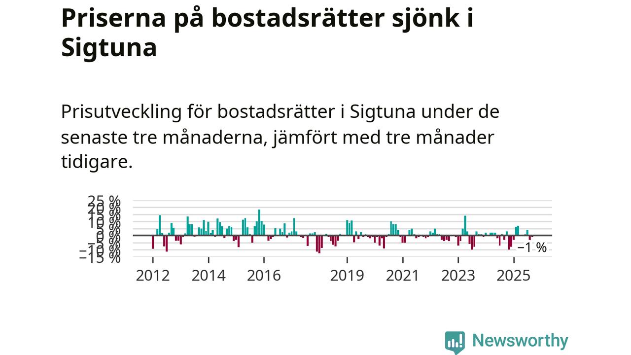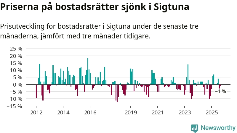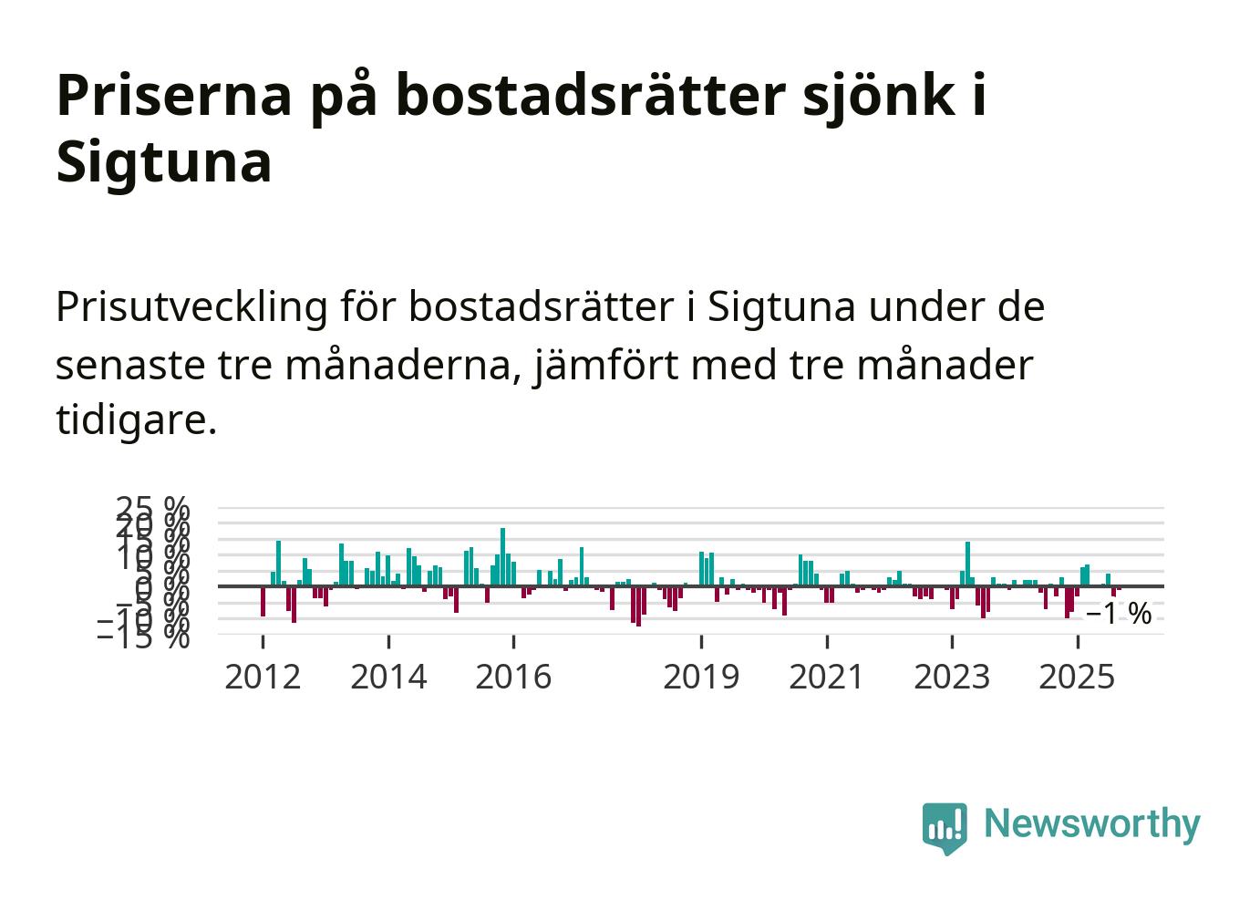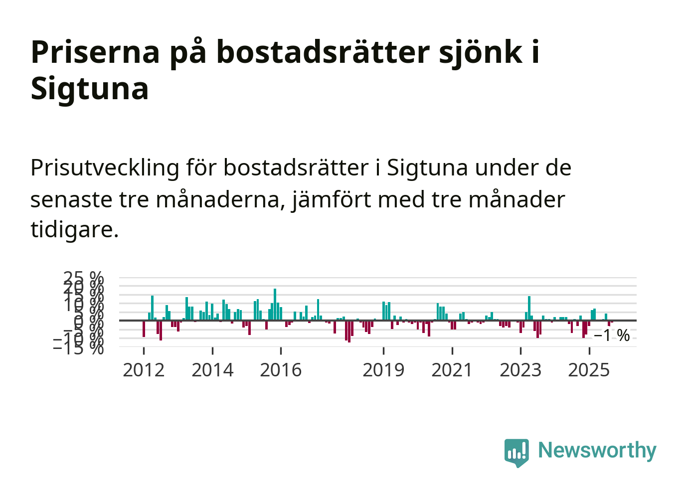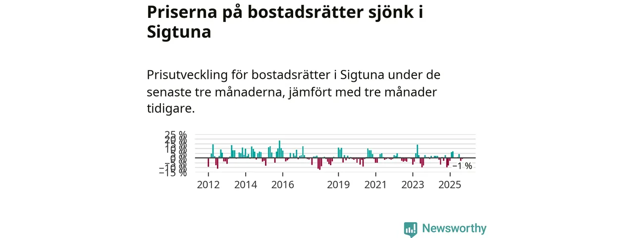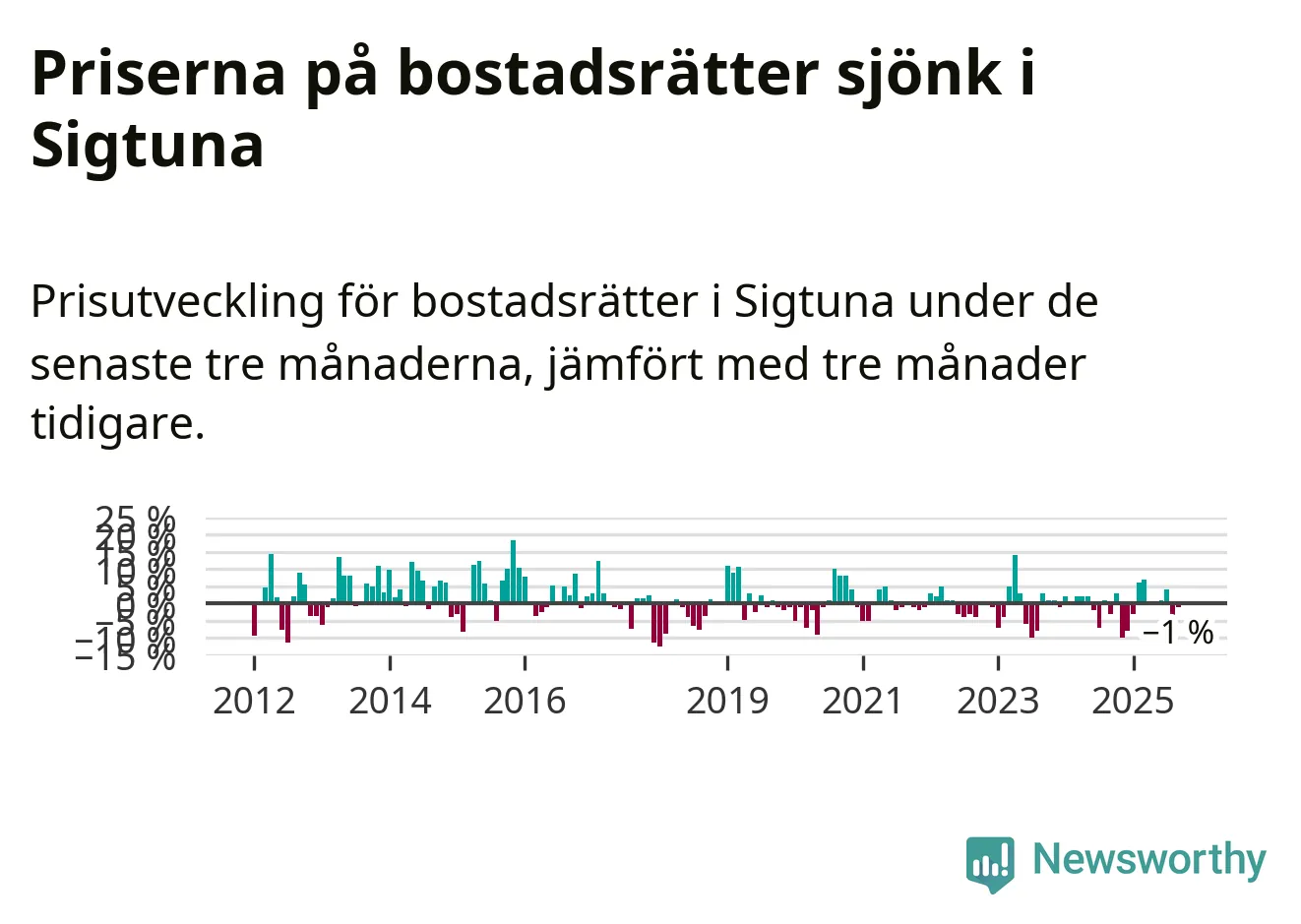 Priserna på bostadsrätter har gått ner i Sigtuna kommun. Medelpriset på försäljningarna under de senaste tre månaderna visar på en nedgång med 1 procent.