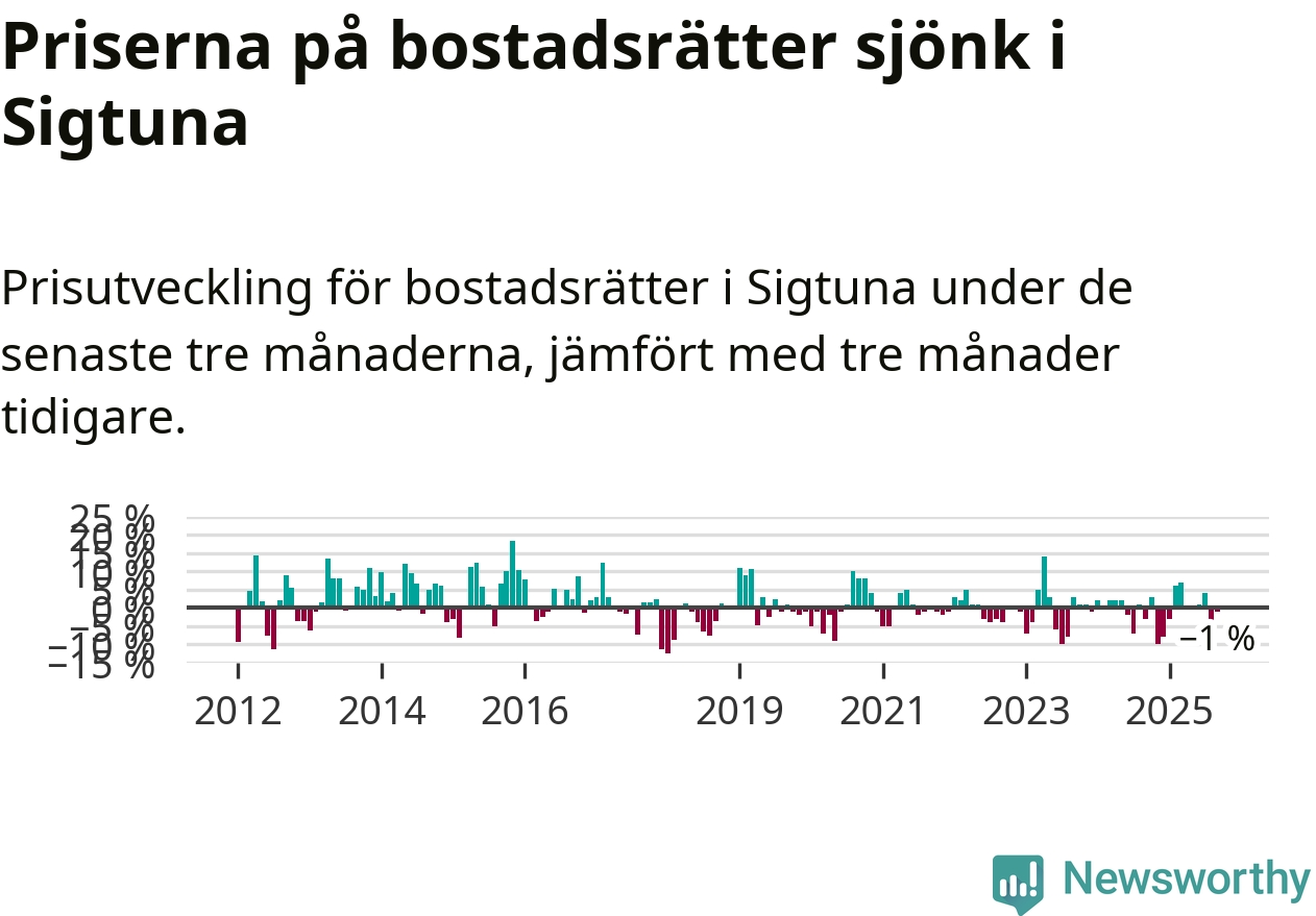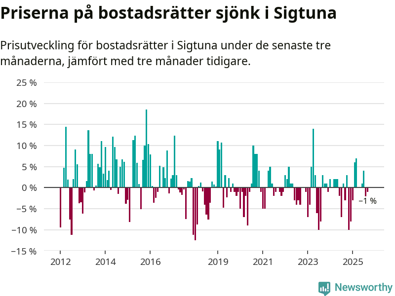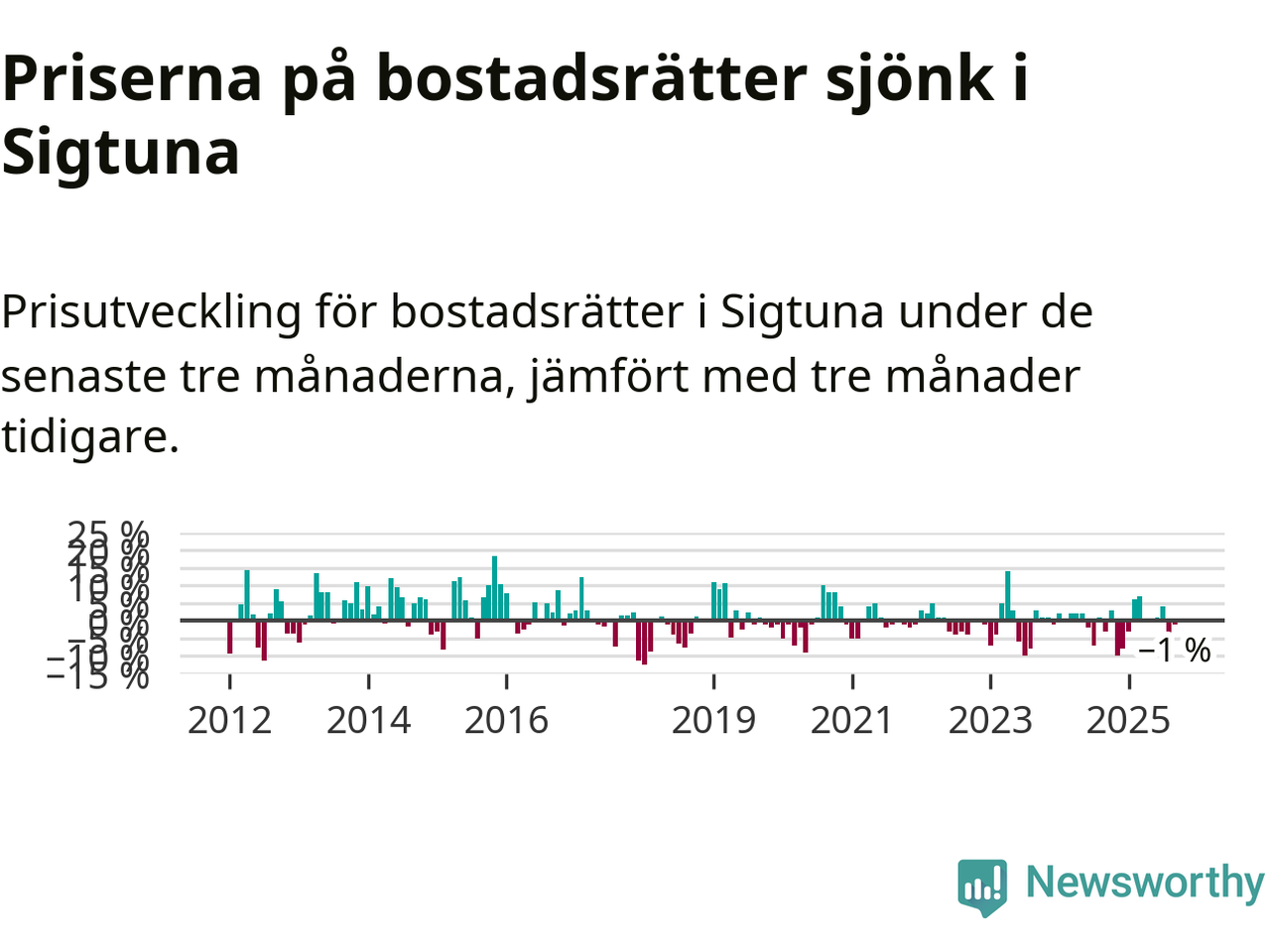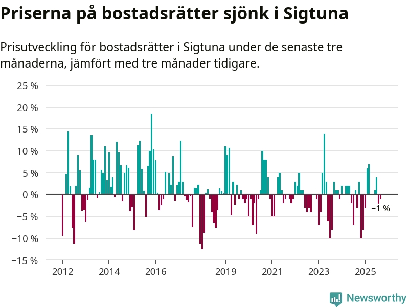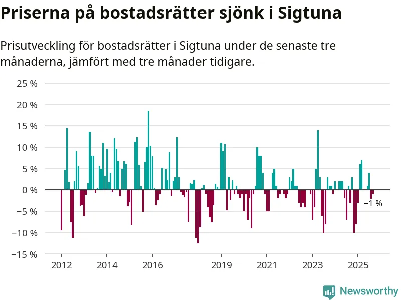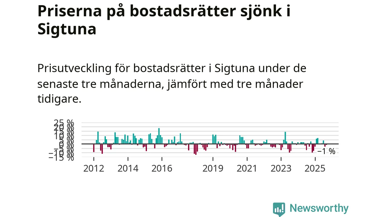 Priserna på bostadsrätter har gått ner i Sigtuna kommun. Medelpriset på försäljningarna under de senaste tre månaderna visar på en nedgång med 1 procent.