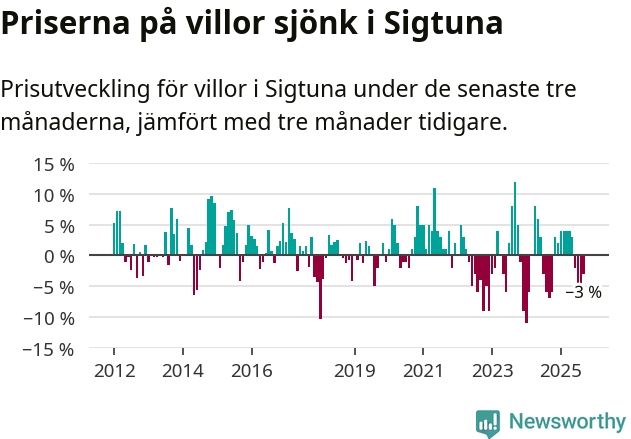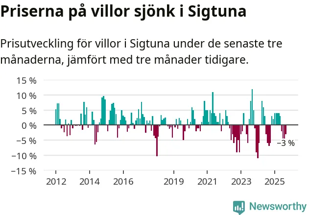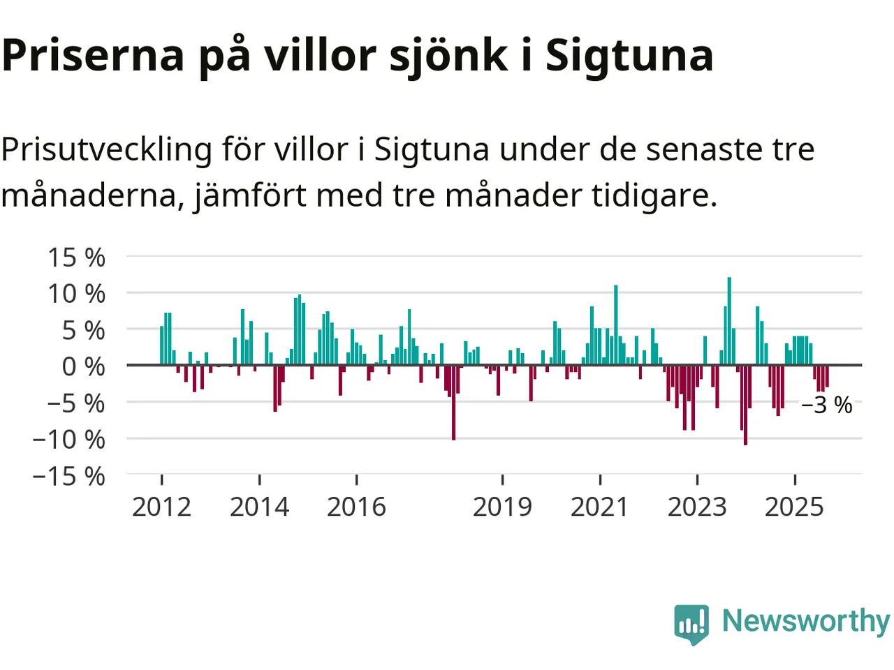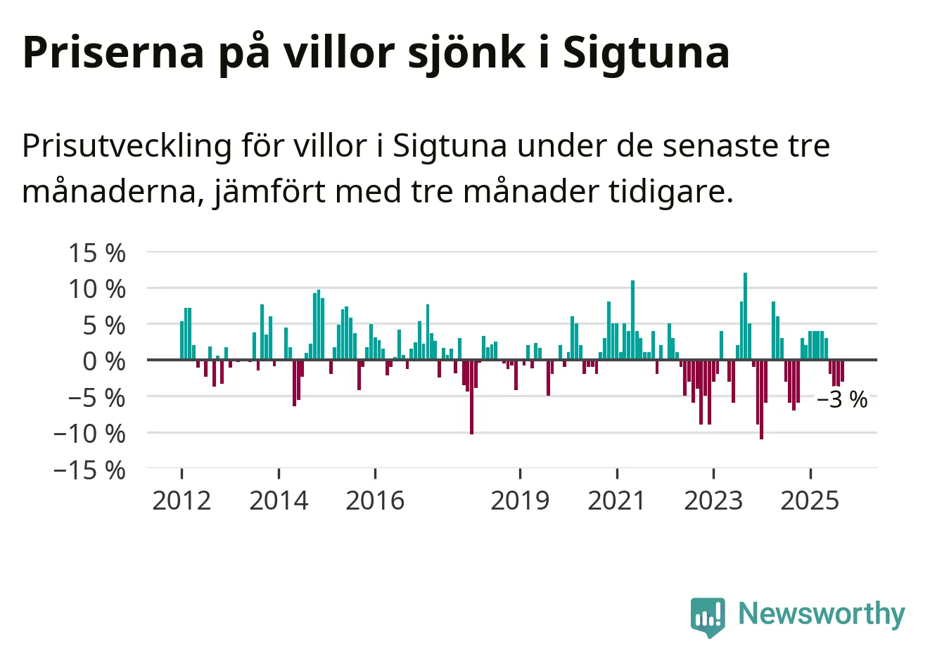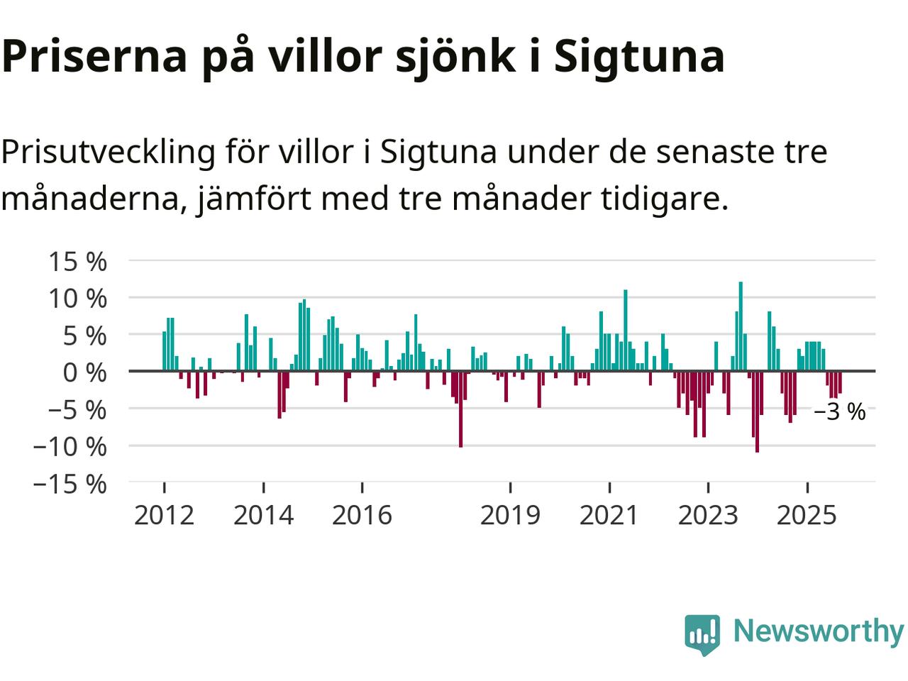 Villapriserna har gått ner i Sigtuna kommun. Medelpriset på försäljningarna under de senaste tre månaderna visar på en nedgång med 3 procent.
