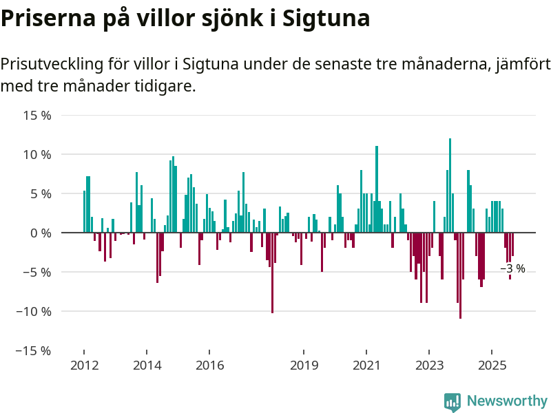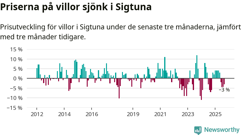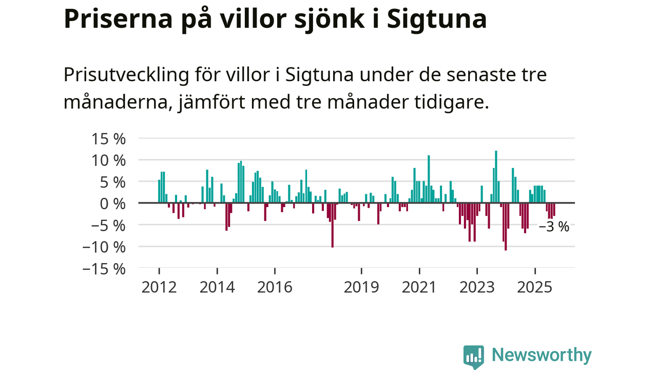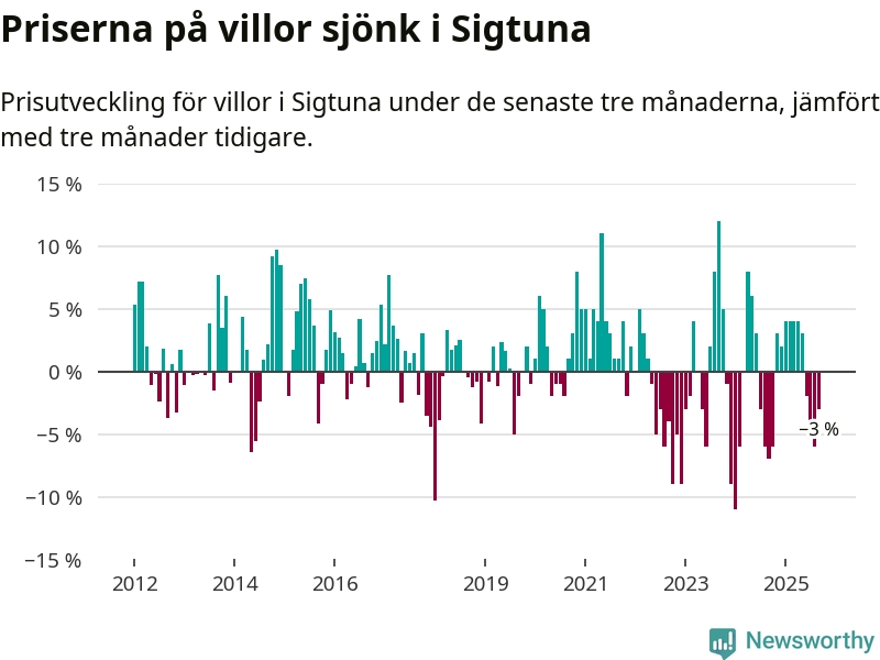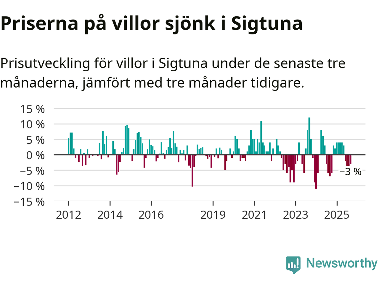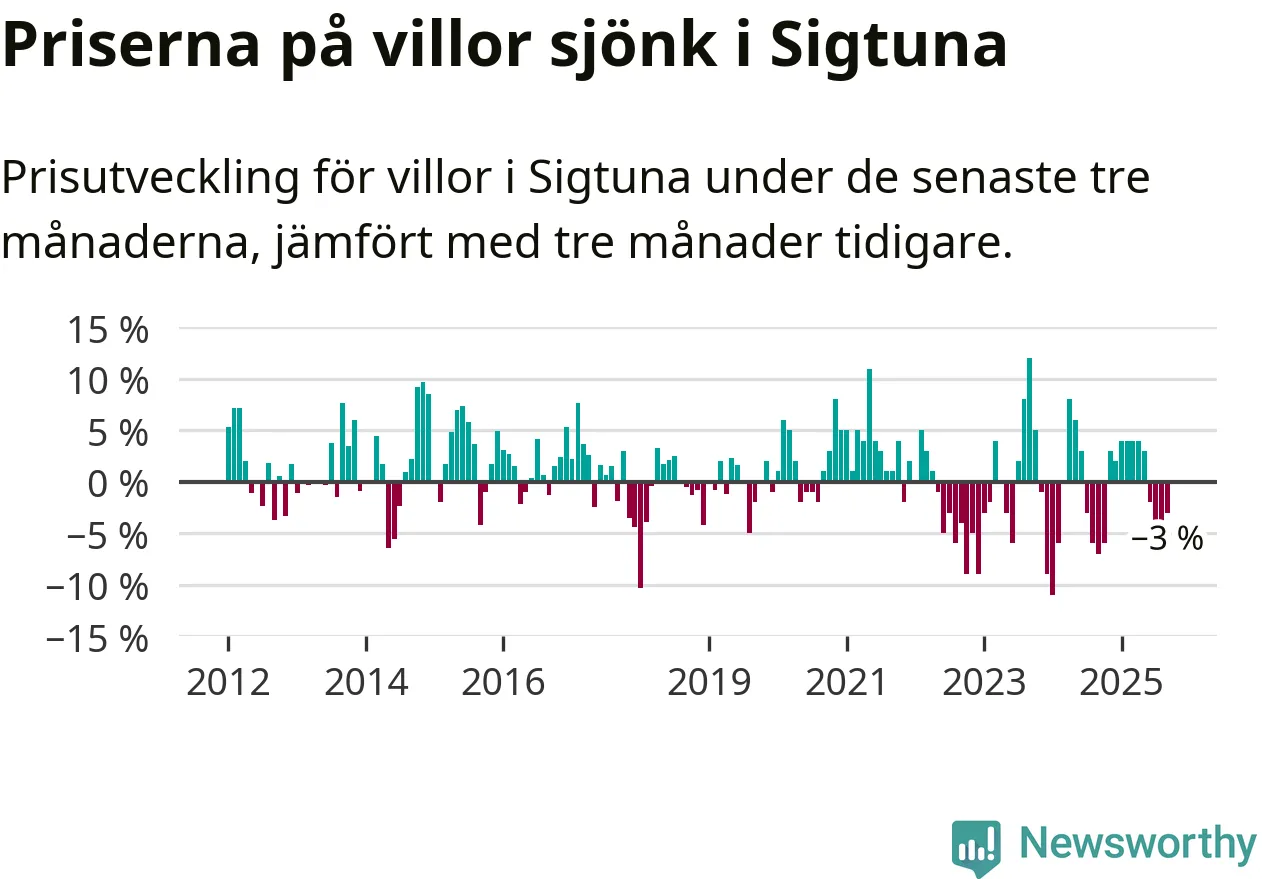 Villapriserna har gått ner i Sigtuna kommun. Medelpriset på försäljningarna under de senaste tre månaderna visar på en nedgång med 3 procent.