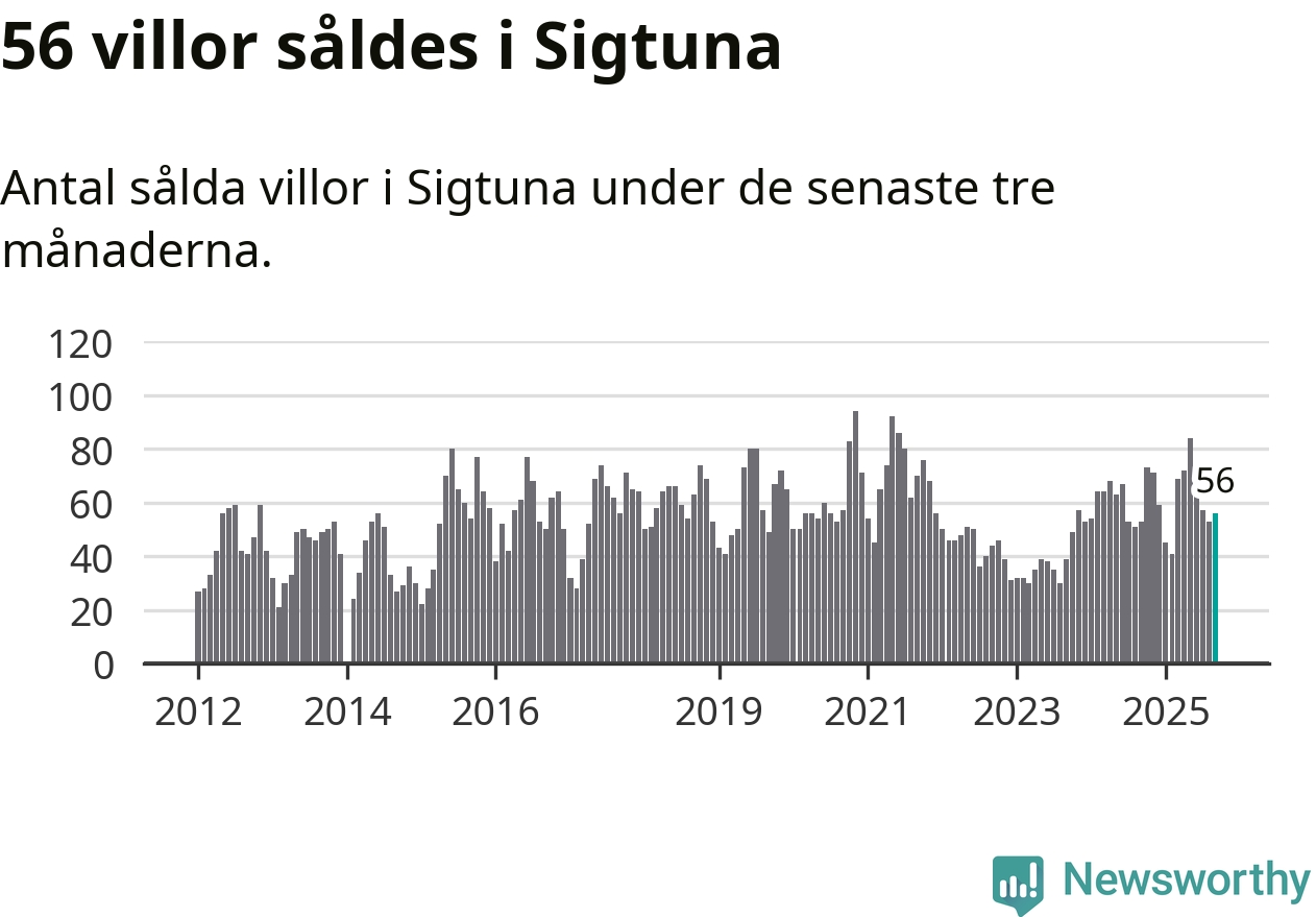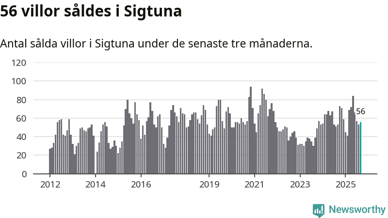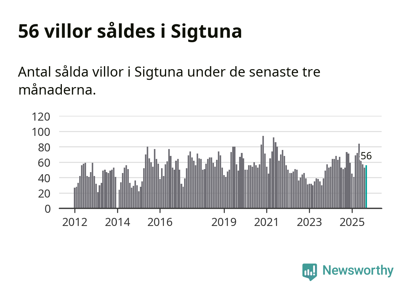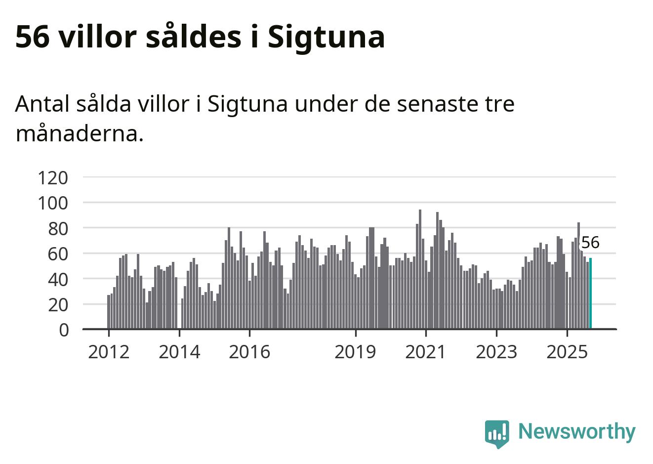 Sammanlagt såldes 56 villor i Sigtuna kommun mellan juli och september till ett genomsnittligt pris på 5,1 miljoner kronor. I fjol gjordes 53 affärer vid den här tiden på året.