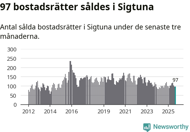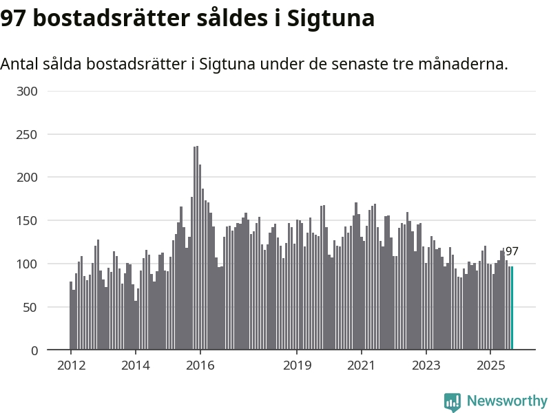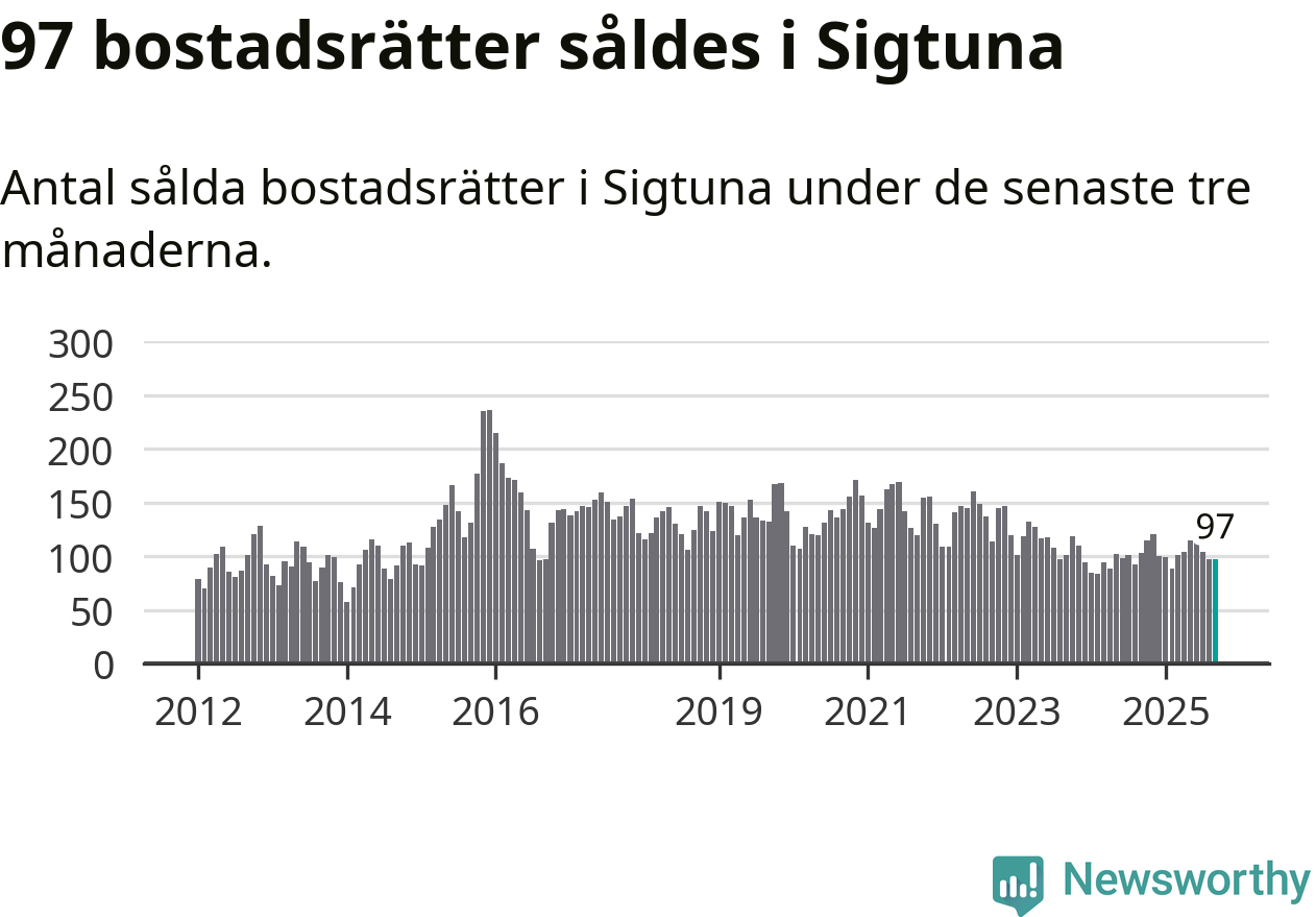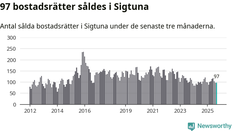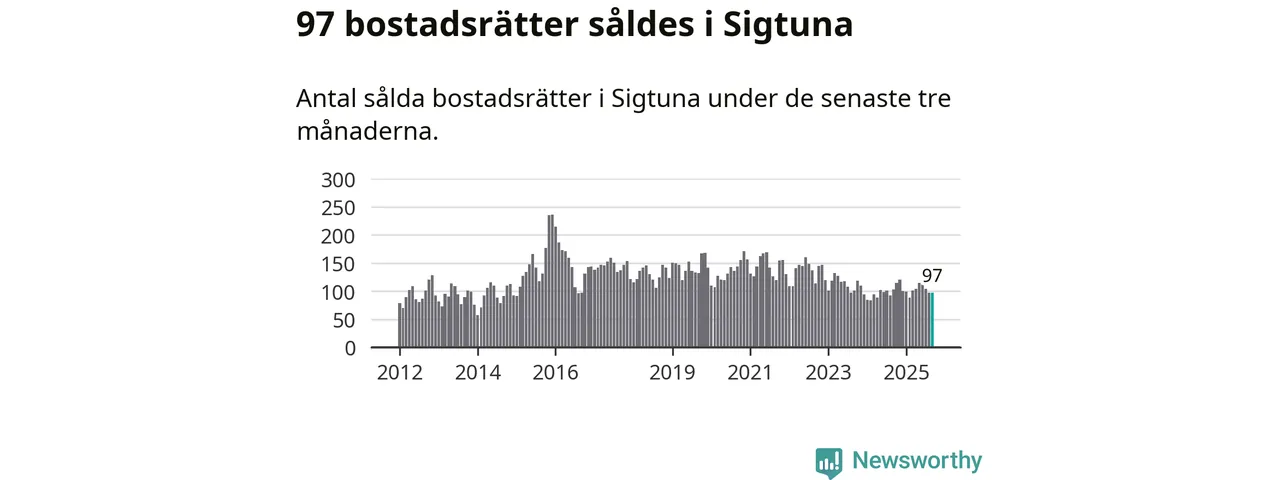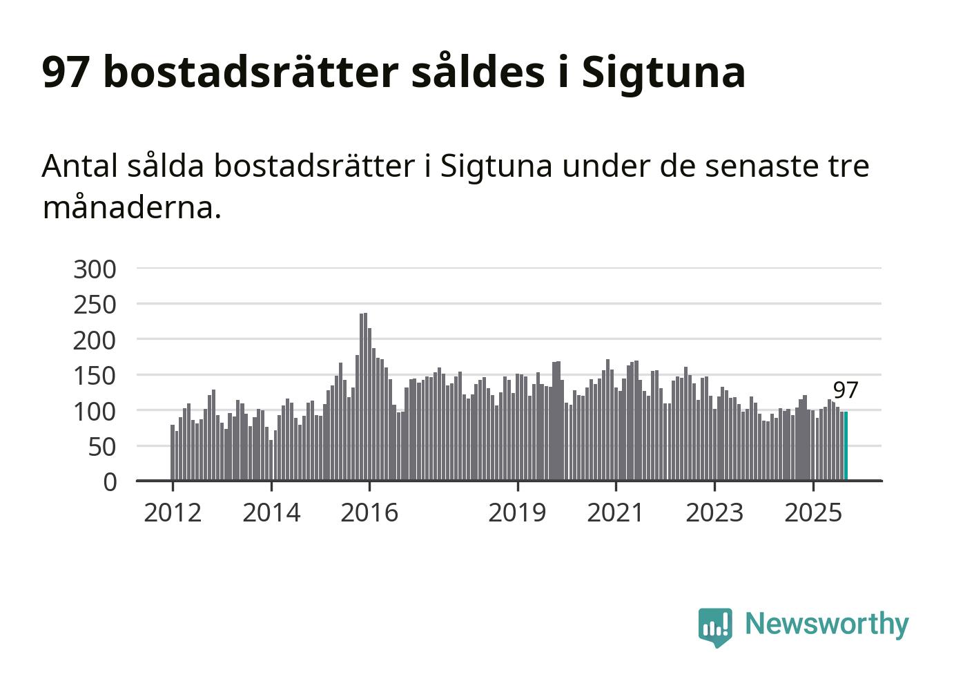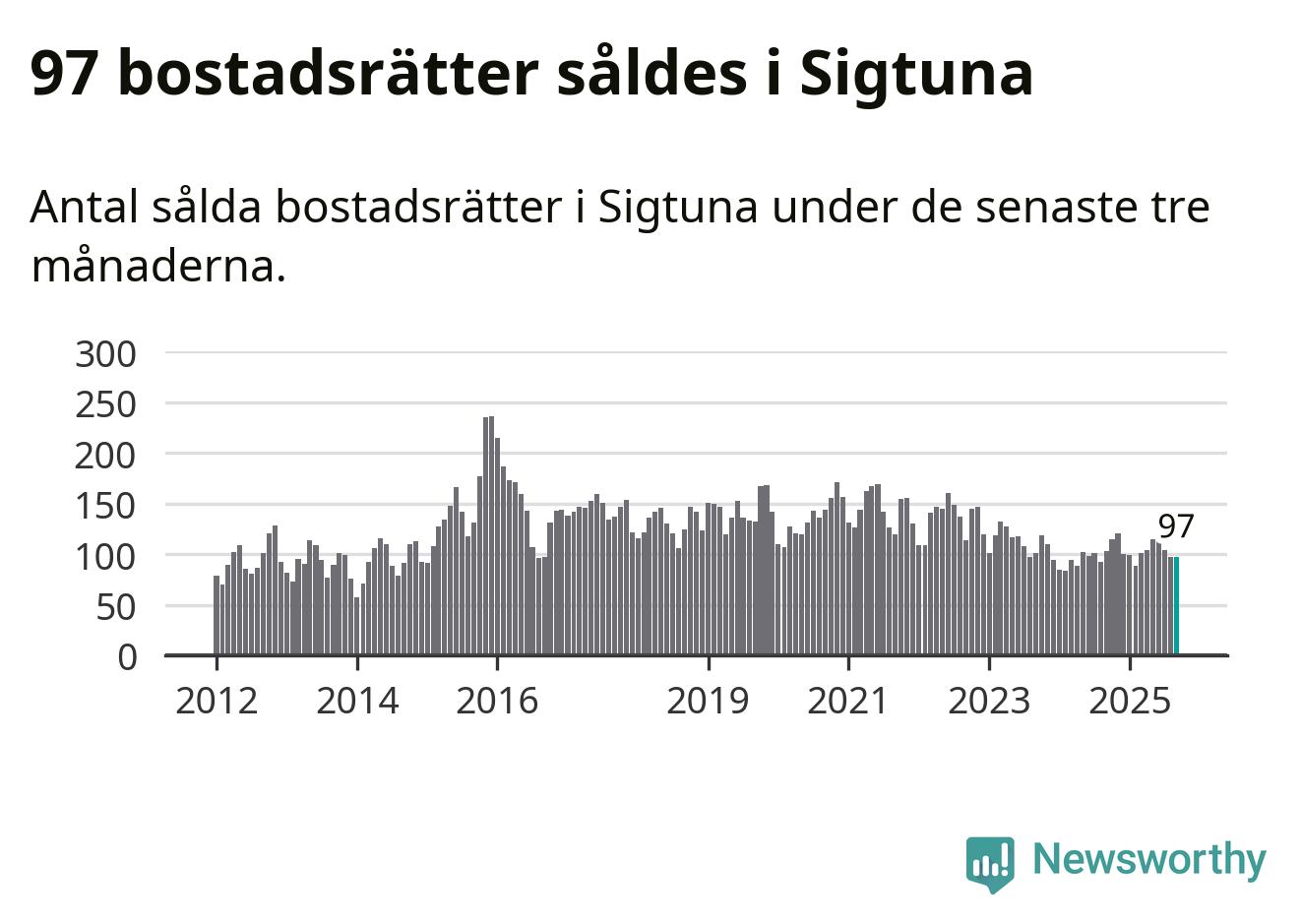 Sammanlagt såldes 97 bostadsrätter i Sigtuna kommun mellan juli och september till ett genomsnittligt pris på 2,0 miljoner kronor. I fjol gjordes 103 affärer vid den här tiden på året.