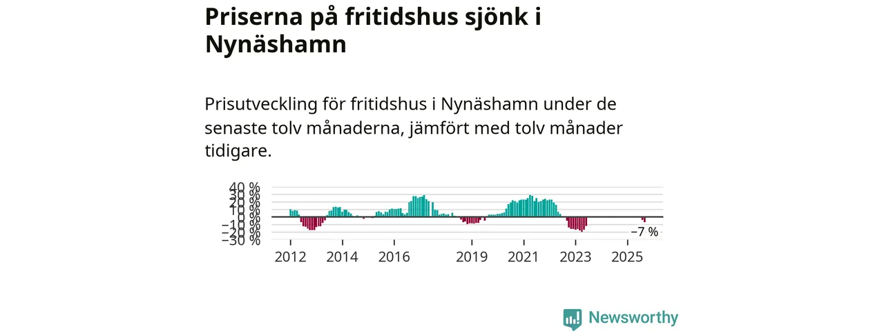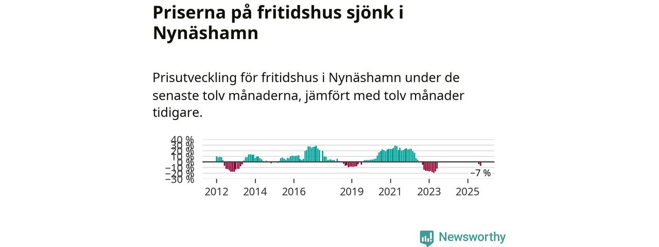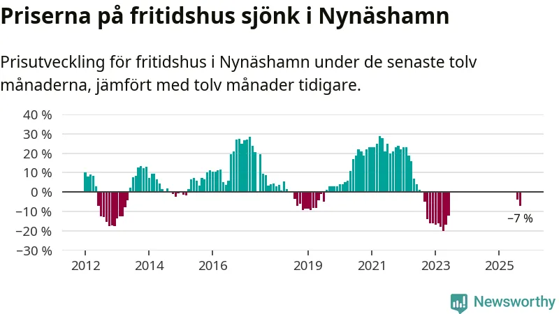 Priserna på fritidshus har gått ner i Nynäshamns kommun. Medelpriset på försäljningarna under de senaste tolv månaderna visar på en nedgång med 7 procent.