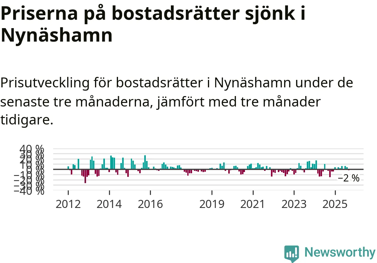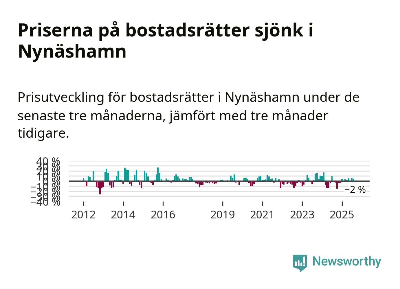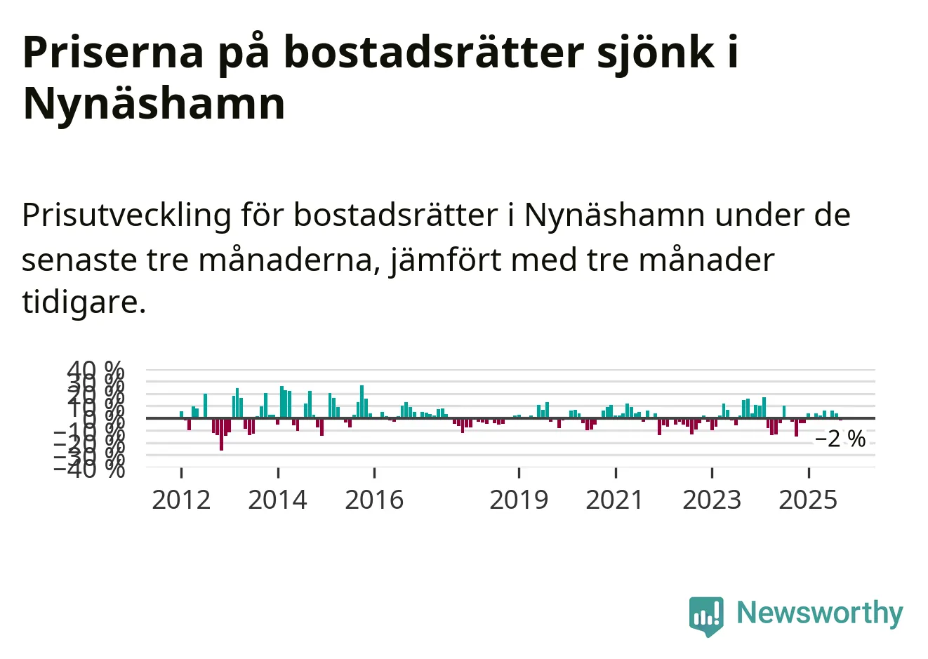 Priserna på bostadsrätter har gått ner i Nynäshamns kommun. Medelpriset på försäljningarna under de senaste tre månaderna visar på en nedgång med 2 procent.