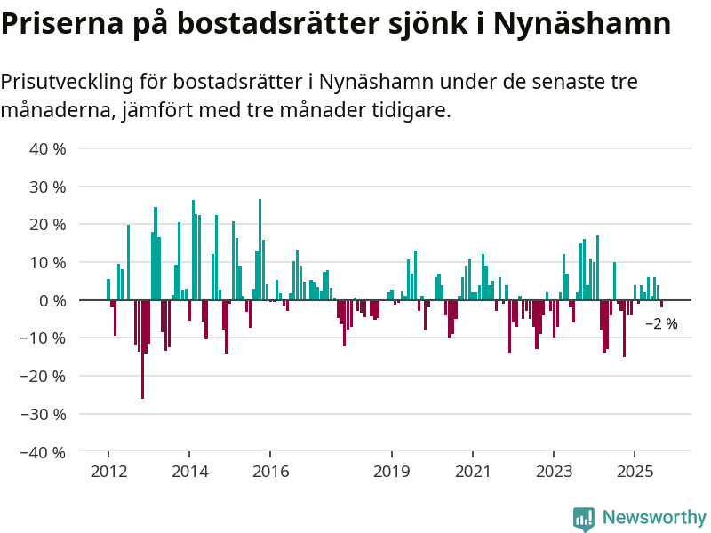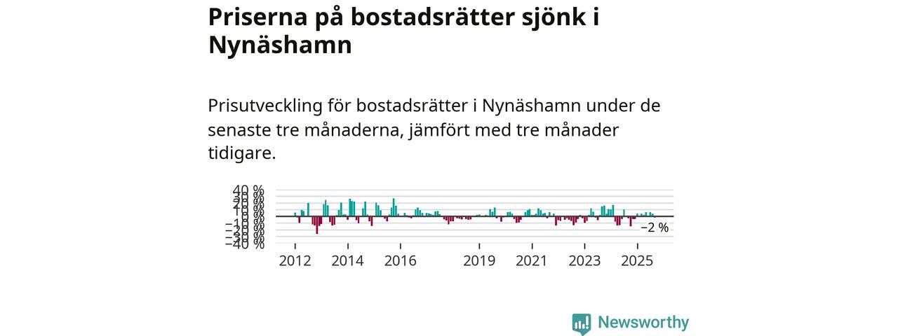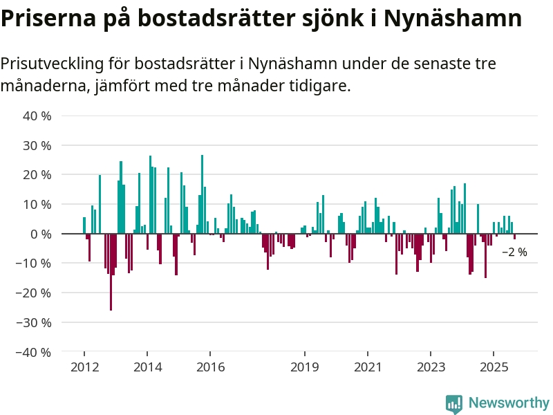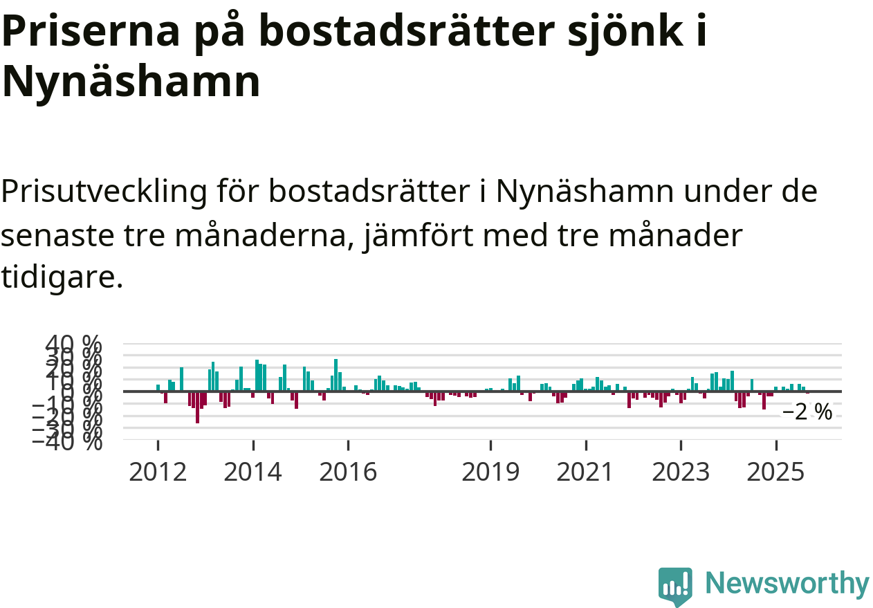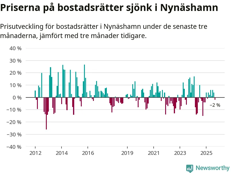Priserna på bostadsrätter har gått ner i Nynäshamns kommun. Medelpriset på försäljningarna under de senaste tre månaderna visar på en nedgång med 2 procent.