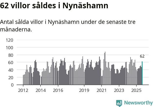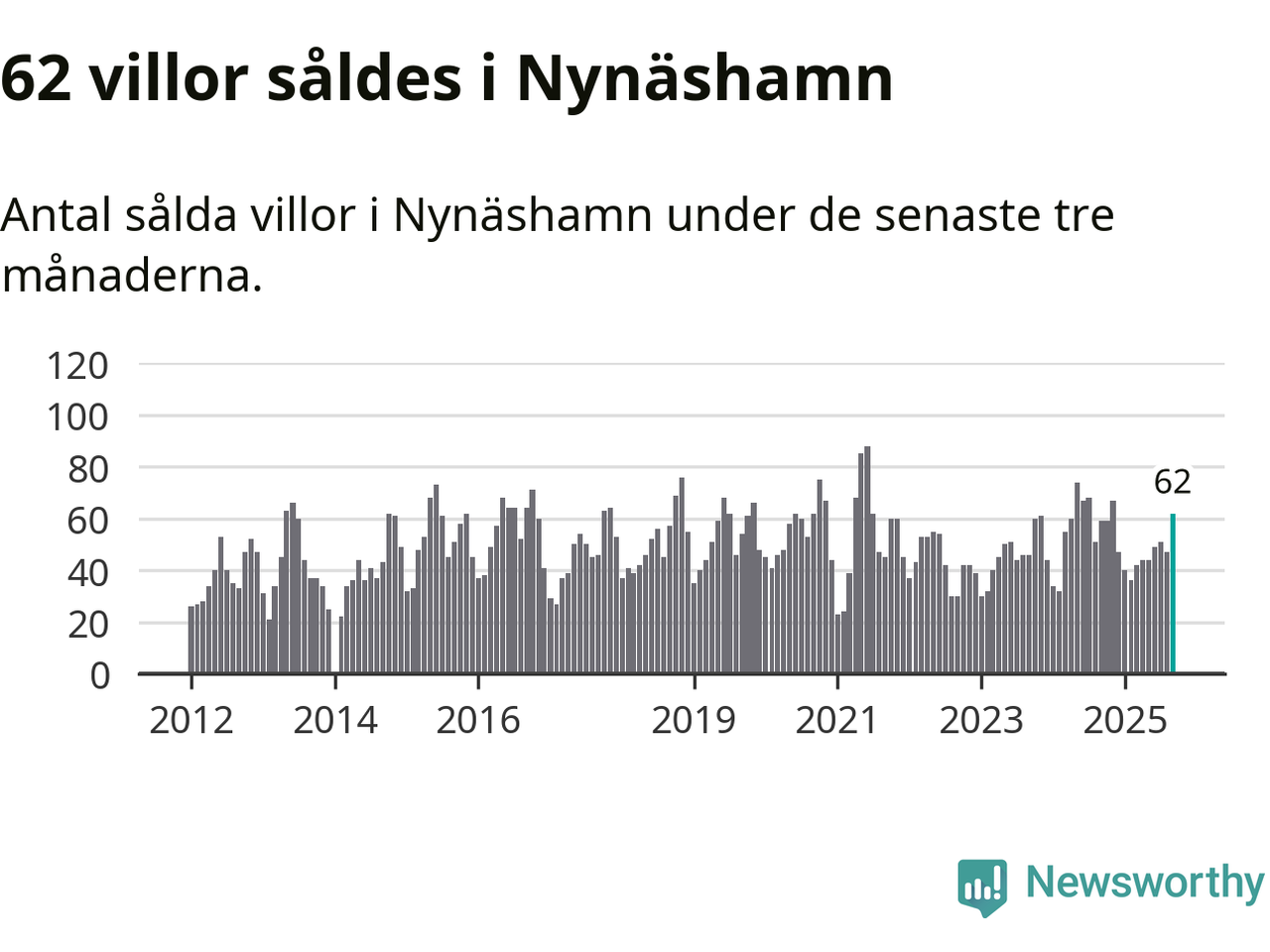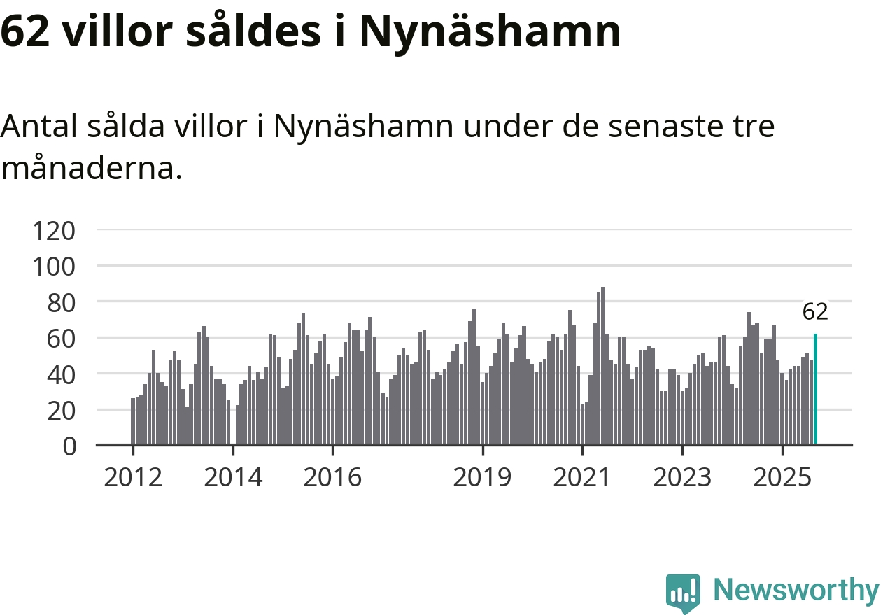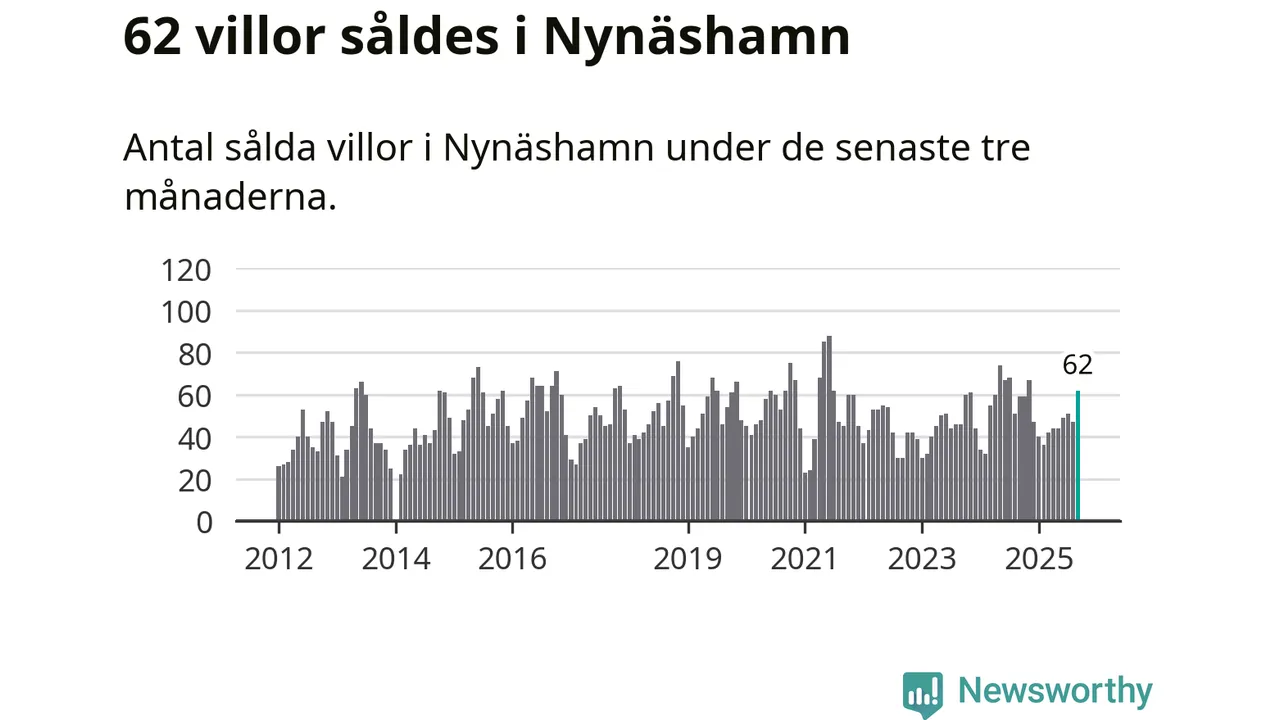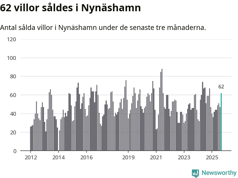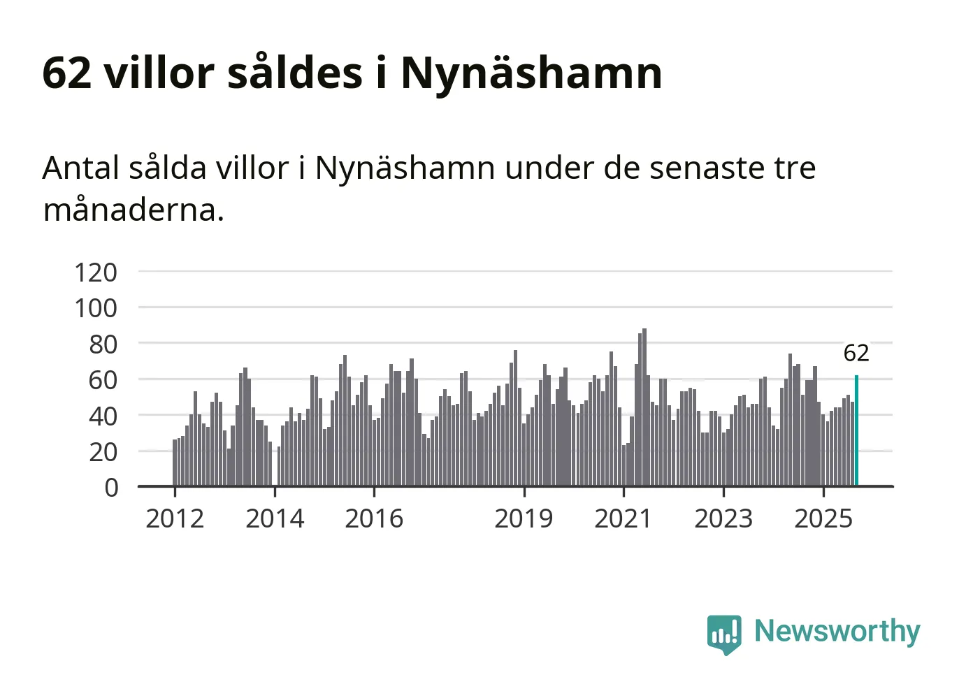 Mellan juli och september såldes 62 villor i Nynäshamns kommun. Det är relativt många sett till aktiviteten på bostadsmarknaden i kommunen under de senaste tolv månaderna, samt det historiska snittet för den här tiden på året.