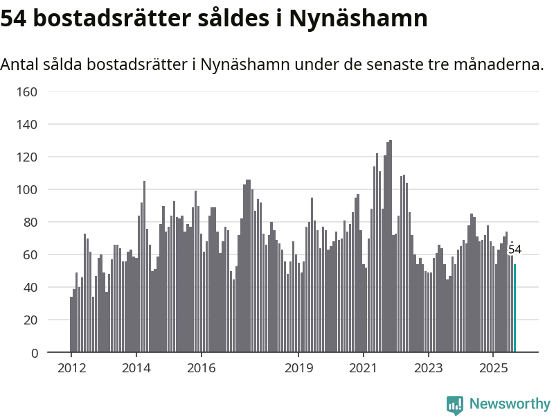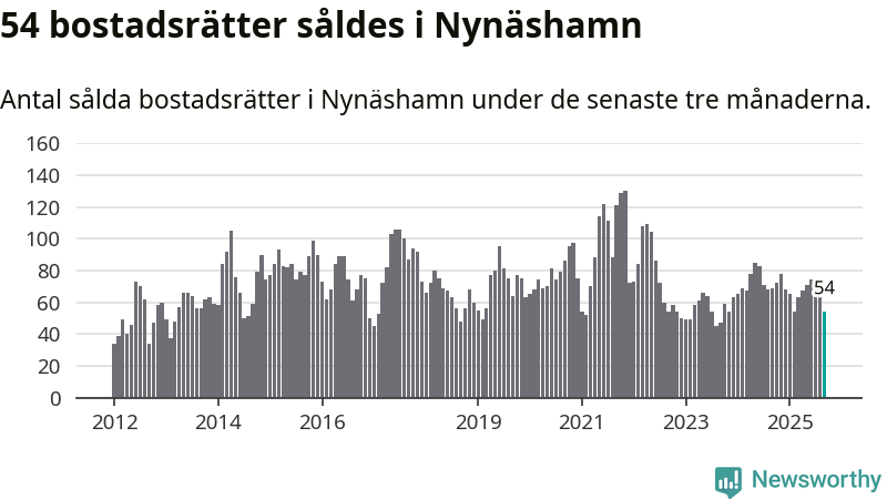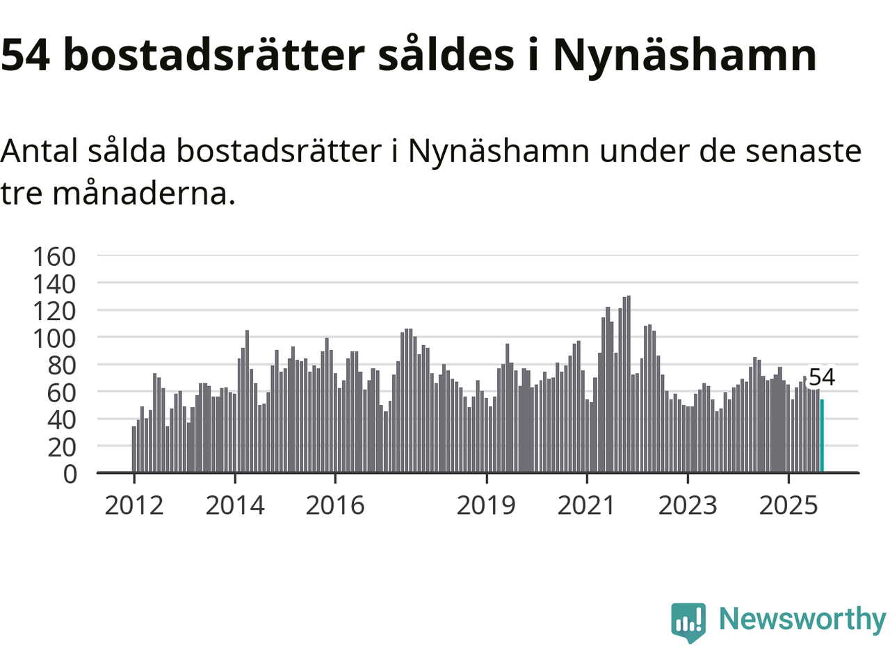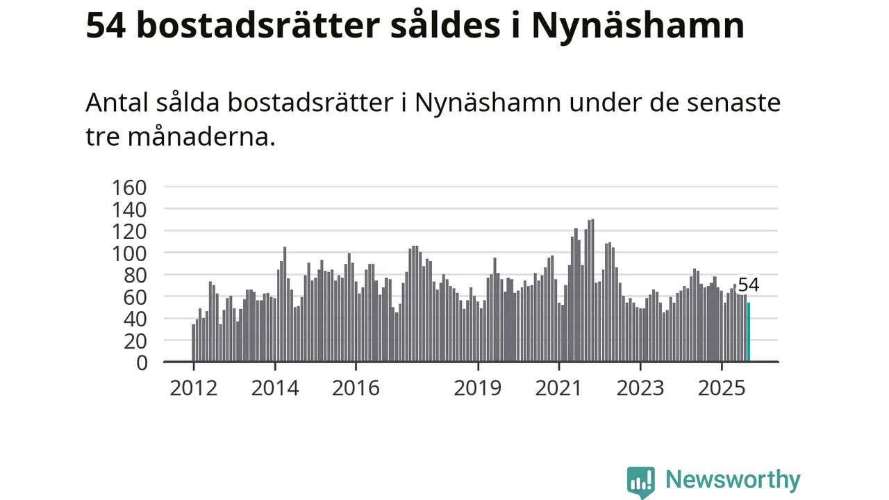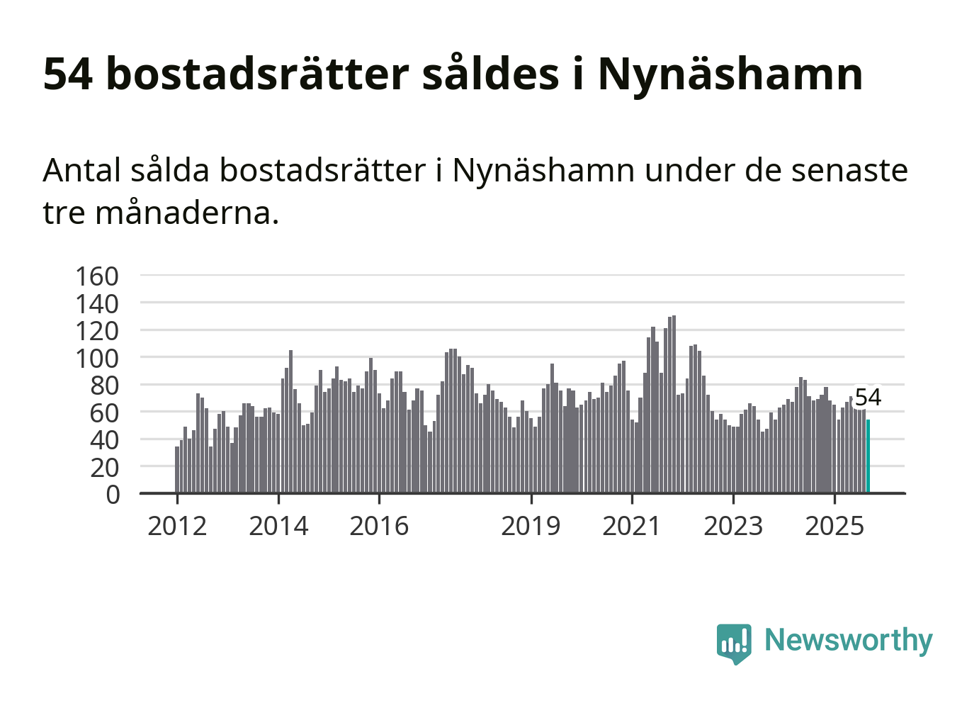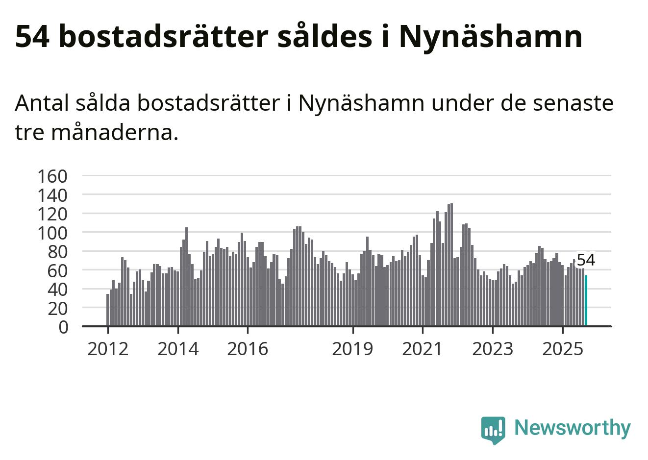 Sammanlagt såldes 54 bostadsrätter i Nynäshamns kommun mellan juli och september till ett genomsnittligt pris på 1,8 miljoner kronor. I fjol gjordes 69 affärer vid den här tiden på året.
