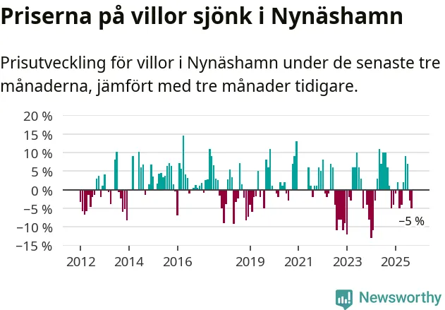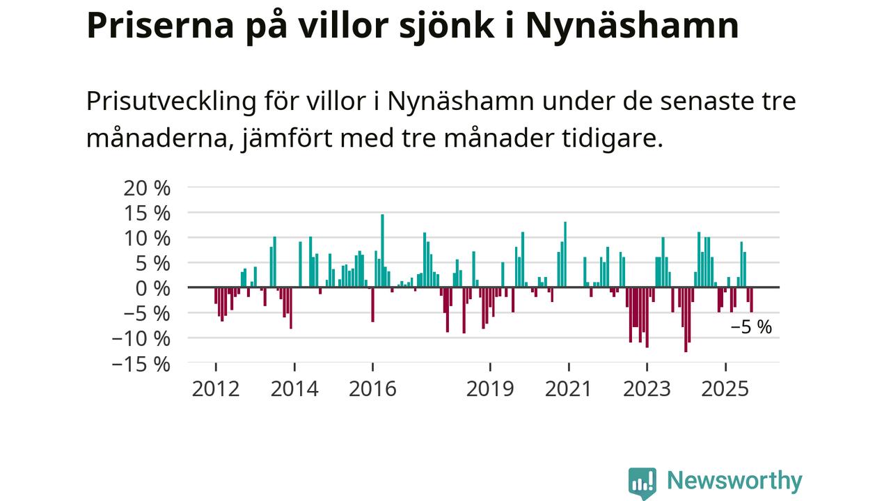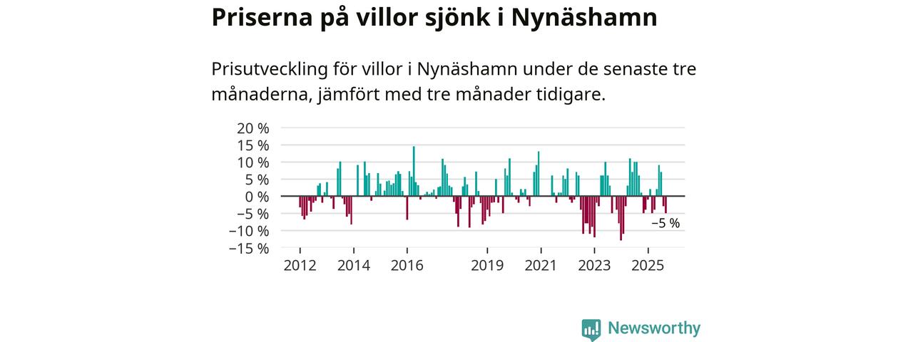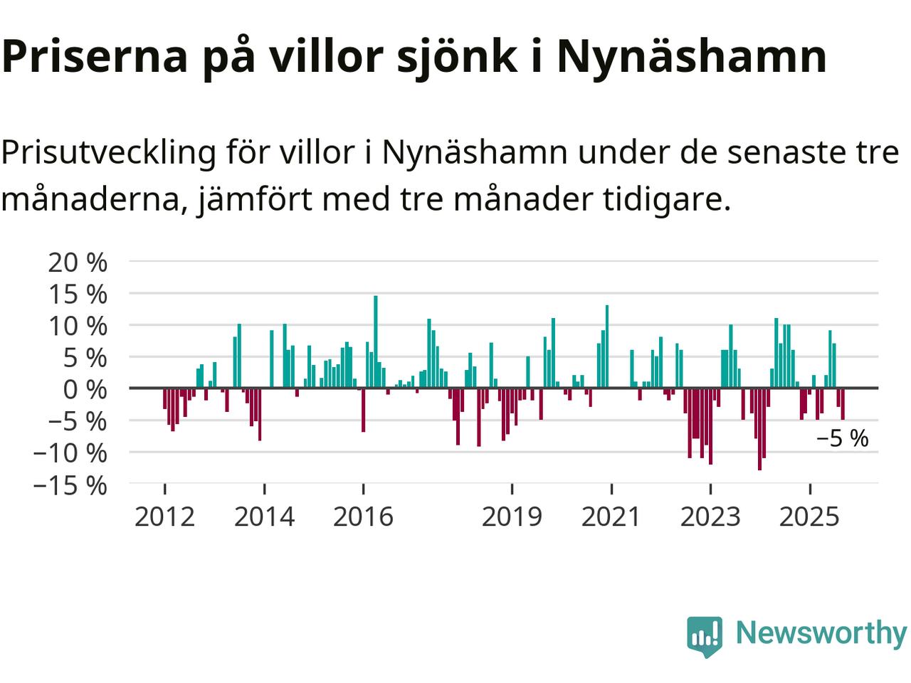 Statistiken visar även på en kännbar prisnedgång i Nynäshamns kommun. Medelpriset på försäljningarna av villor i kommunen var 5 procent lägre än för tre månader sedan. Även i hela Stockholms län sjunker villapriserna. I hela länet noterades en prisnedgång på 1 procent.