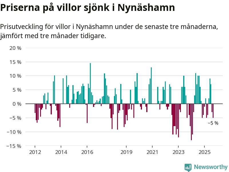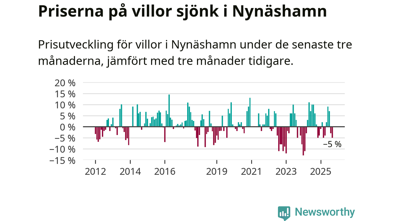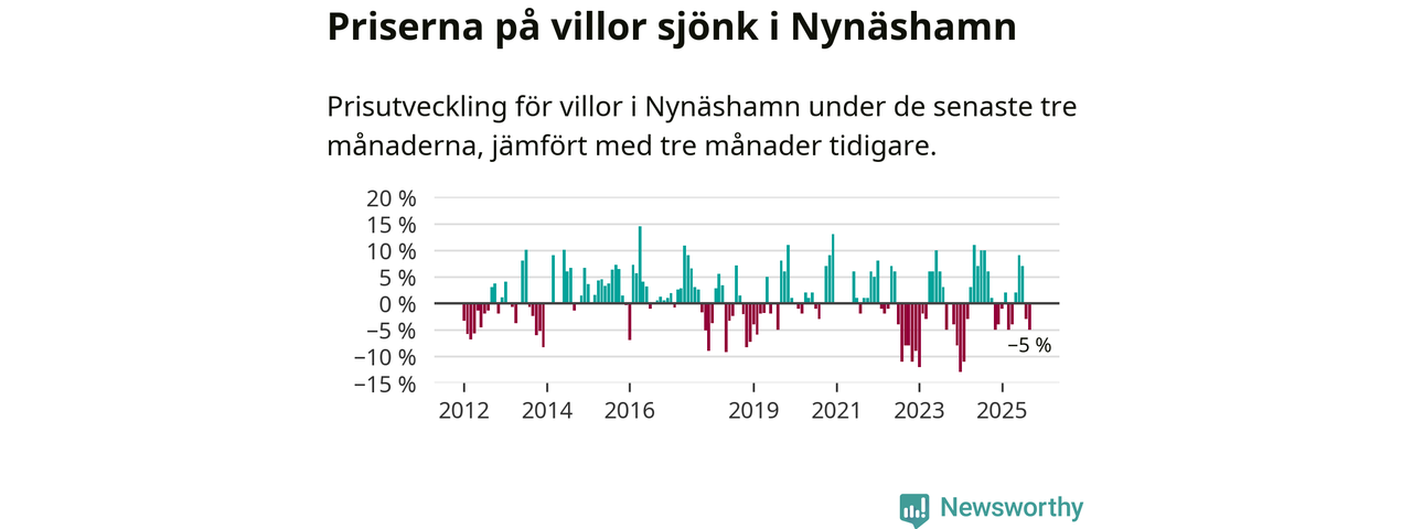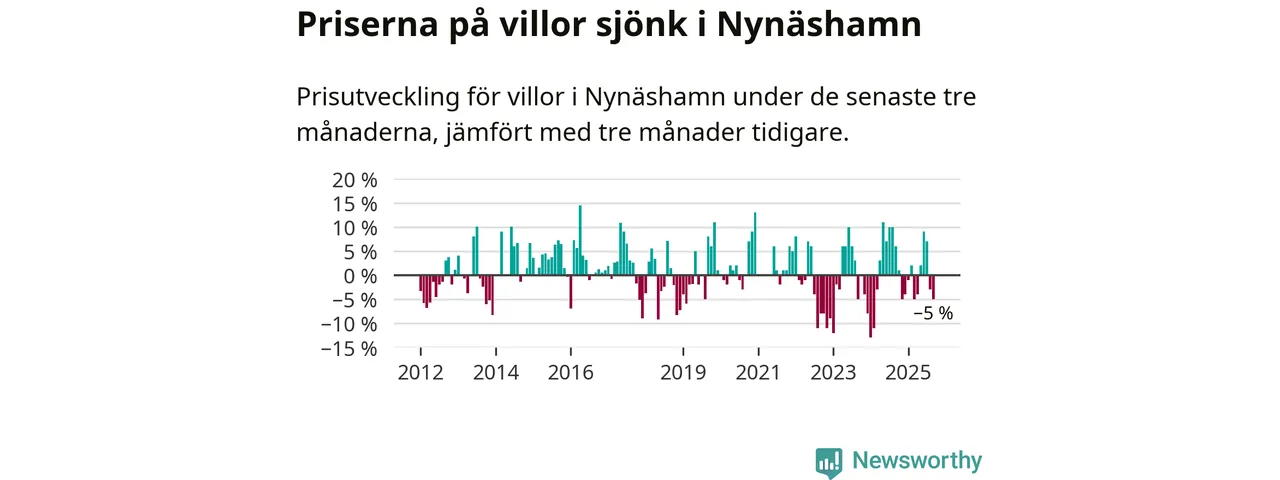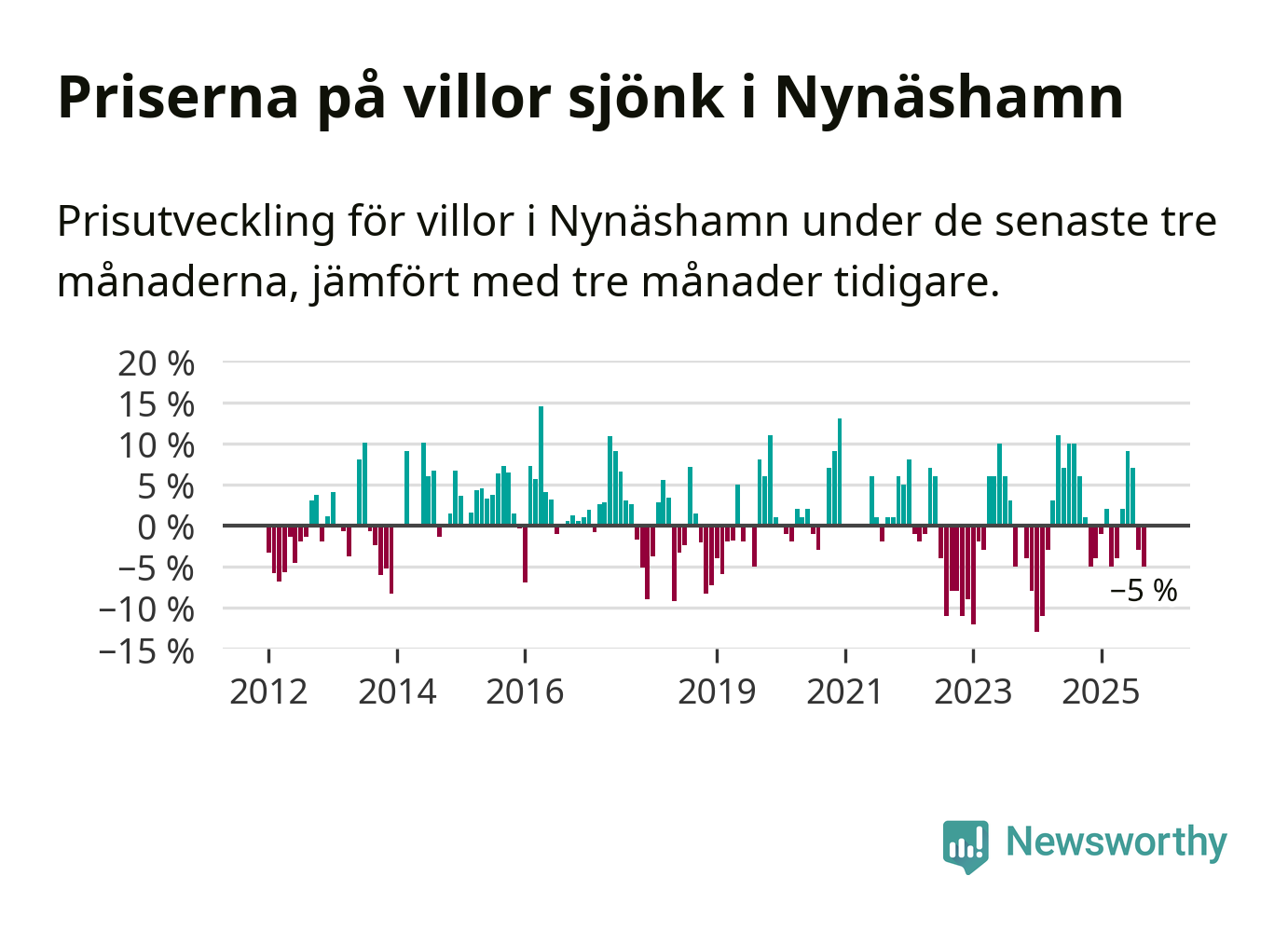 Statistiken visar även på en kännbar prisnedgång i Nynäshamns kommun. Medelpriset på försäljningarna av villor i kommunen var 5 procent lägre än för tre månader sedan. Även i hela Stockholms län sjunker villapriserna. I hela länet noterades en prisnedgång på 1 procent.
