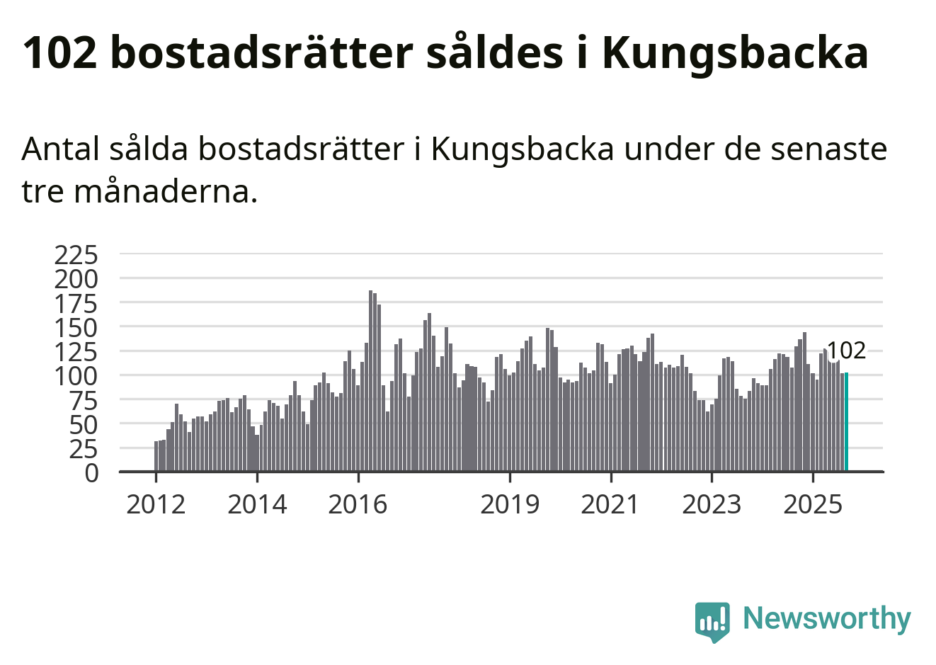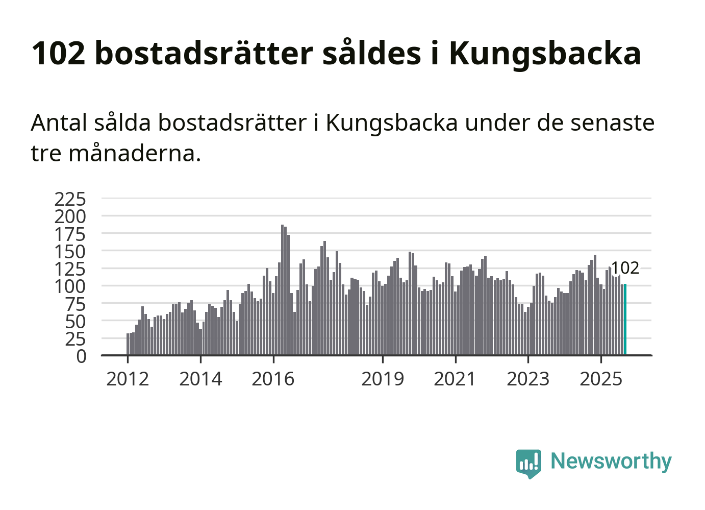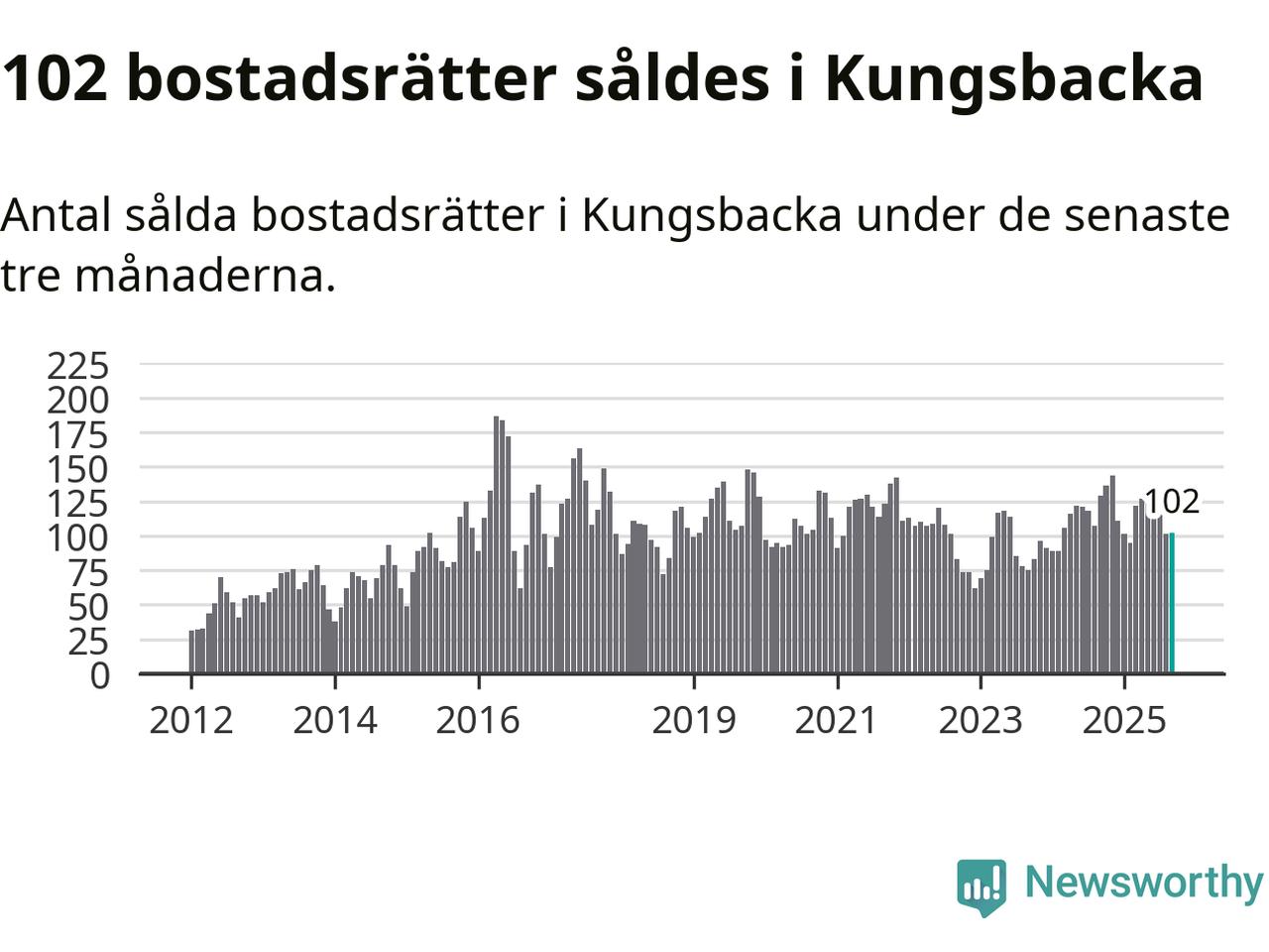 Sammanlagt såldes 102 bostadsrätter i Kungsbacka kommun mellan juli och september till ett genomsnittligt pris på 3,3 miljoner kronor. I fjol gjordes 129 affärer vid den här tiden på året.