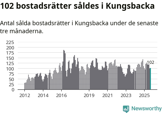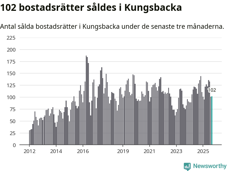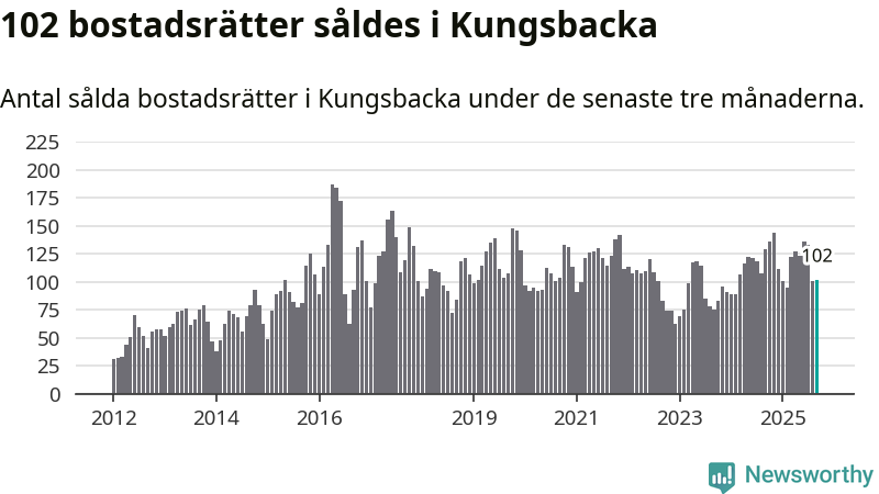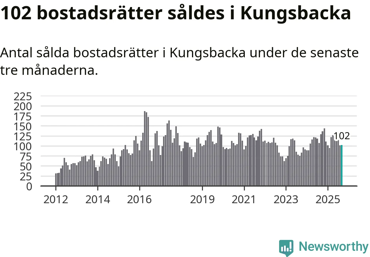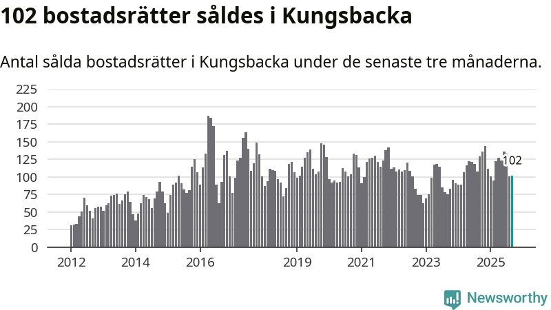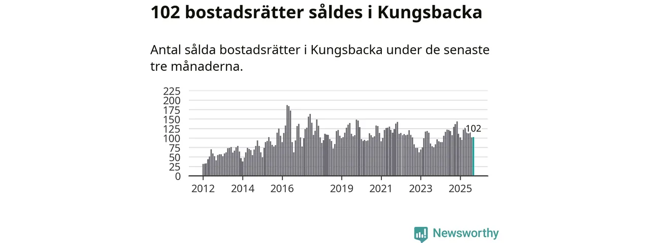 Sammanlagt såldes 102 bostadsrätter i Kungsbacka kommun mellan juli och september till ett genomsnittligt pris på 3,3 miljoner kronor. I fjol gjordes 129 affärer vid den här tiden på året.