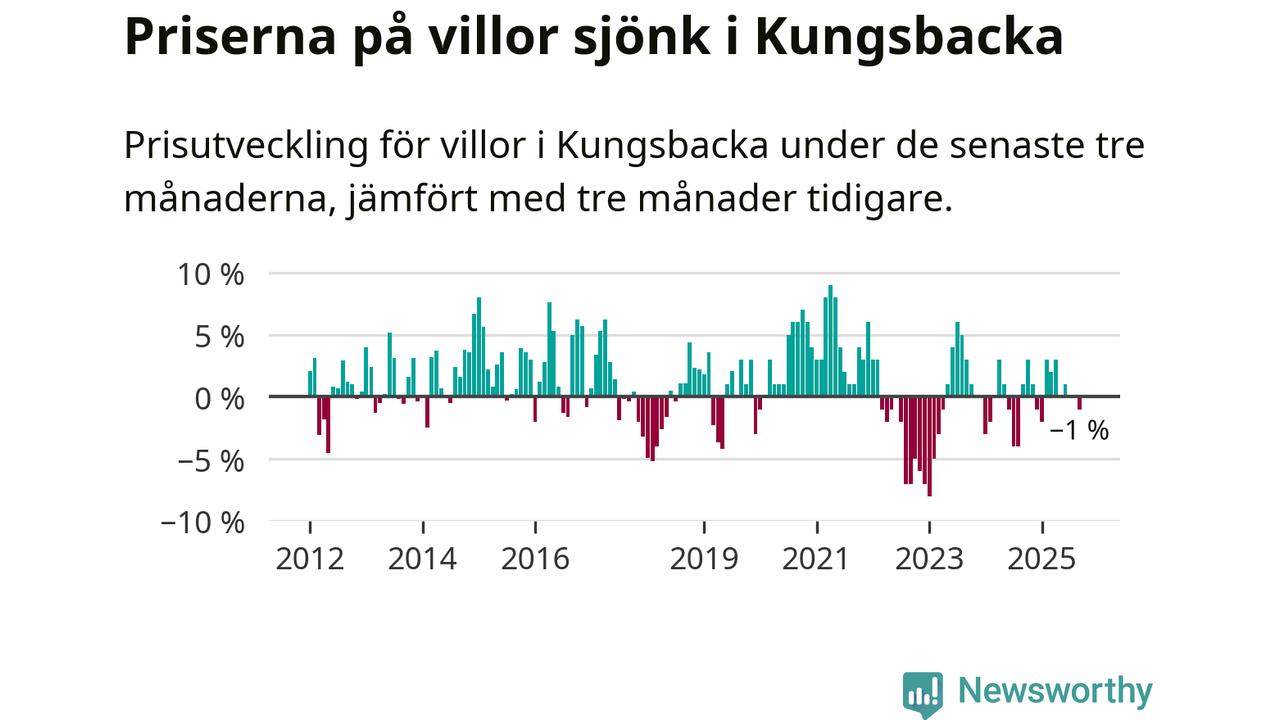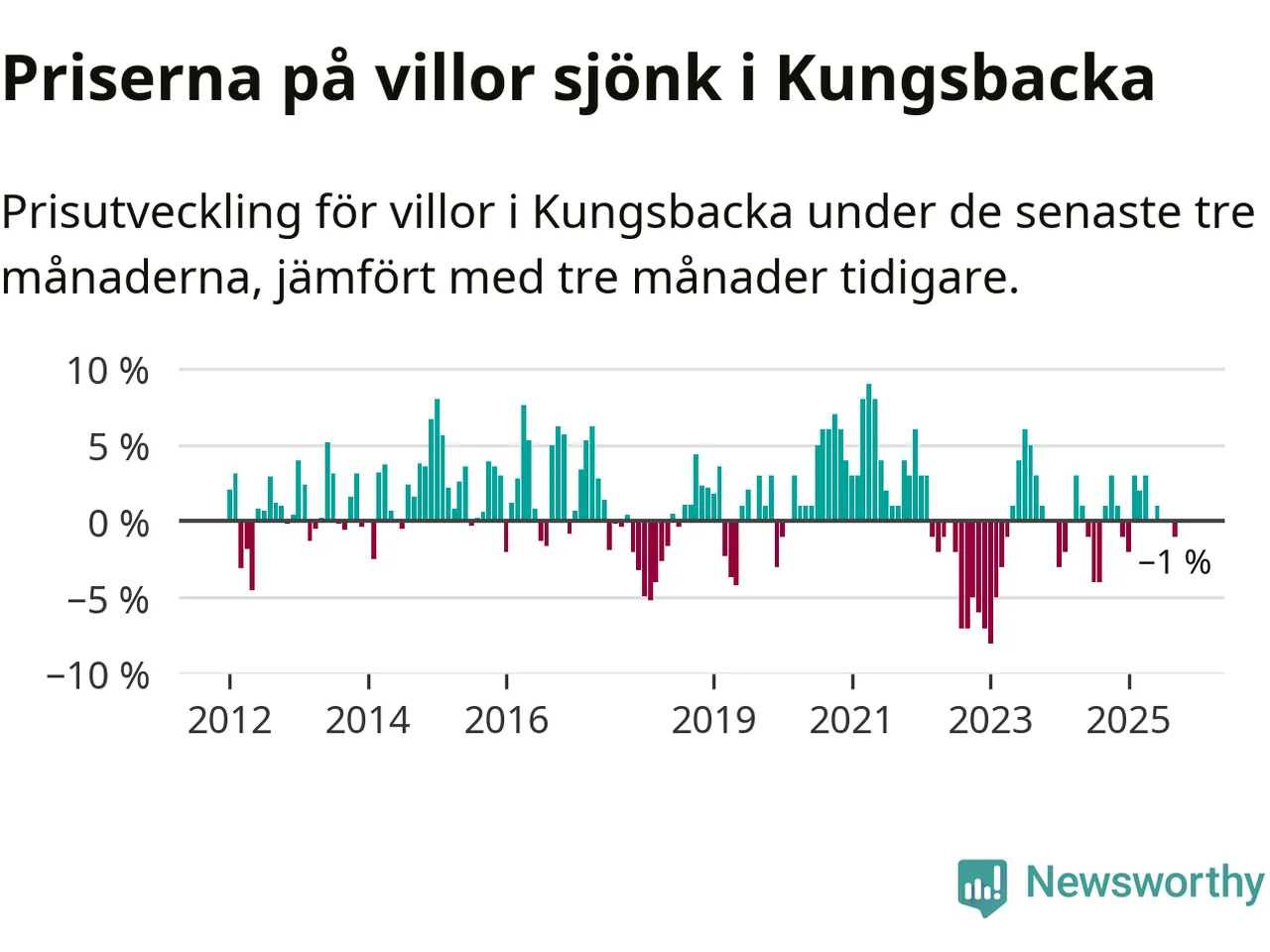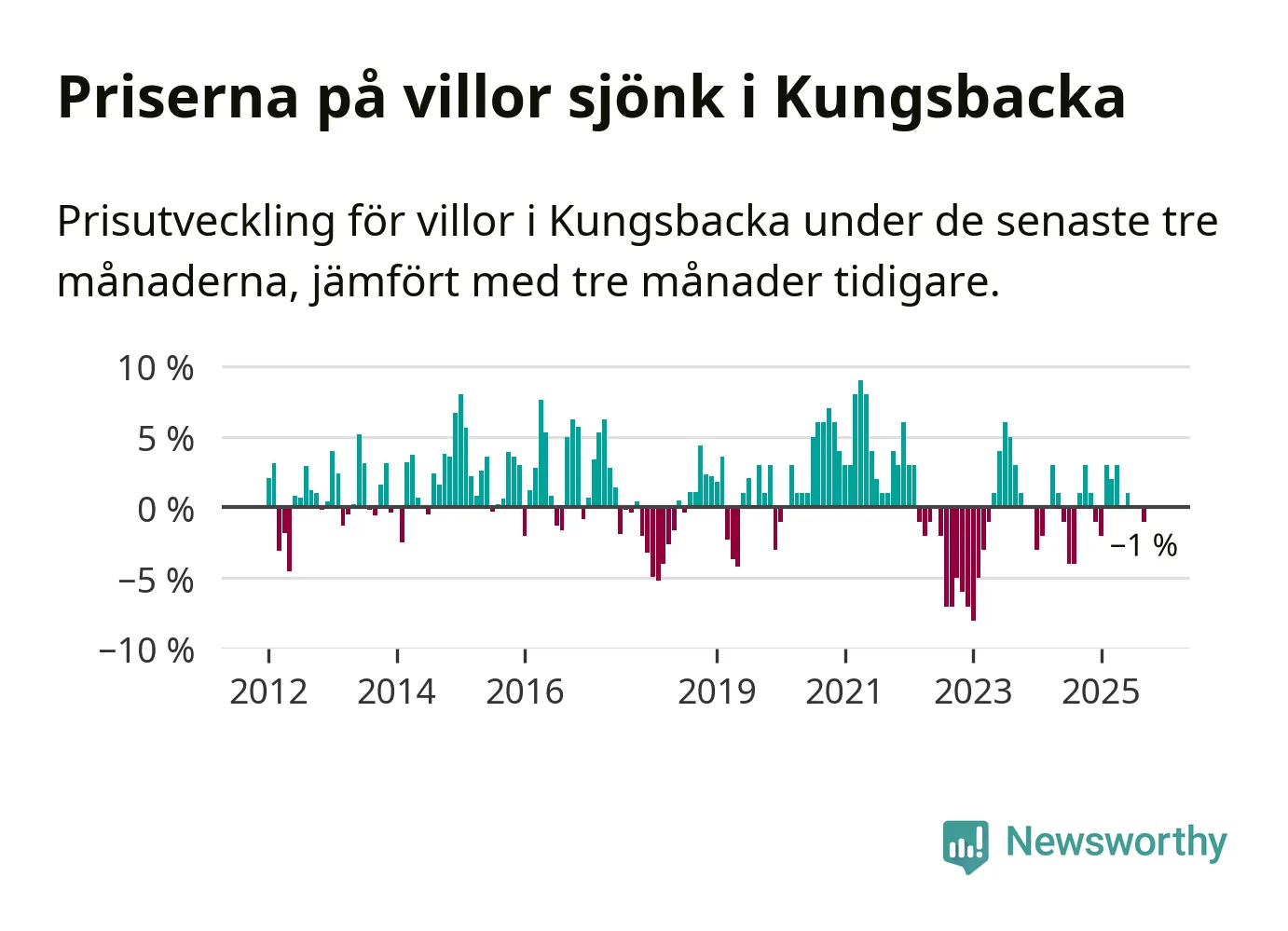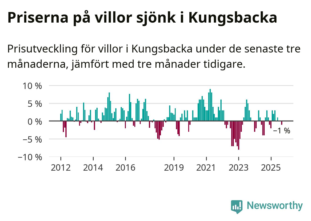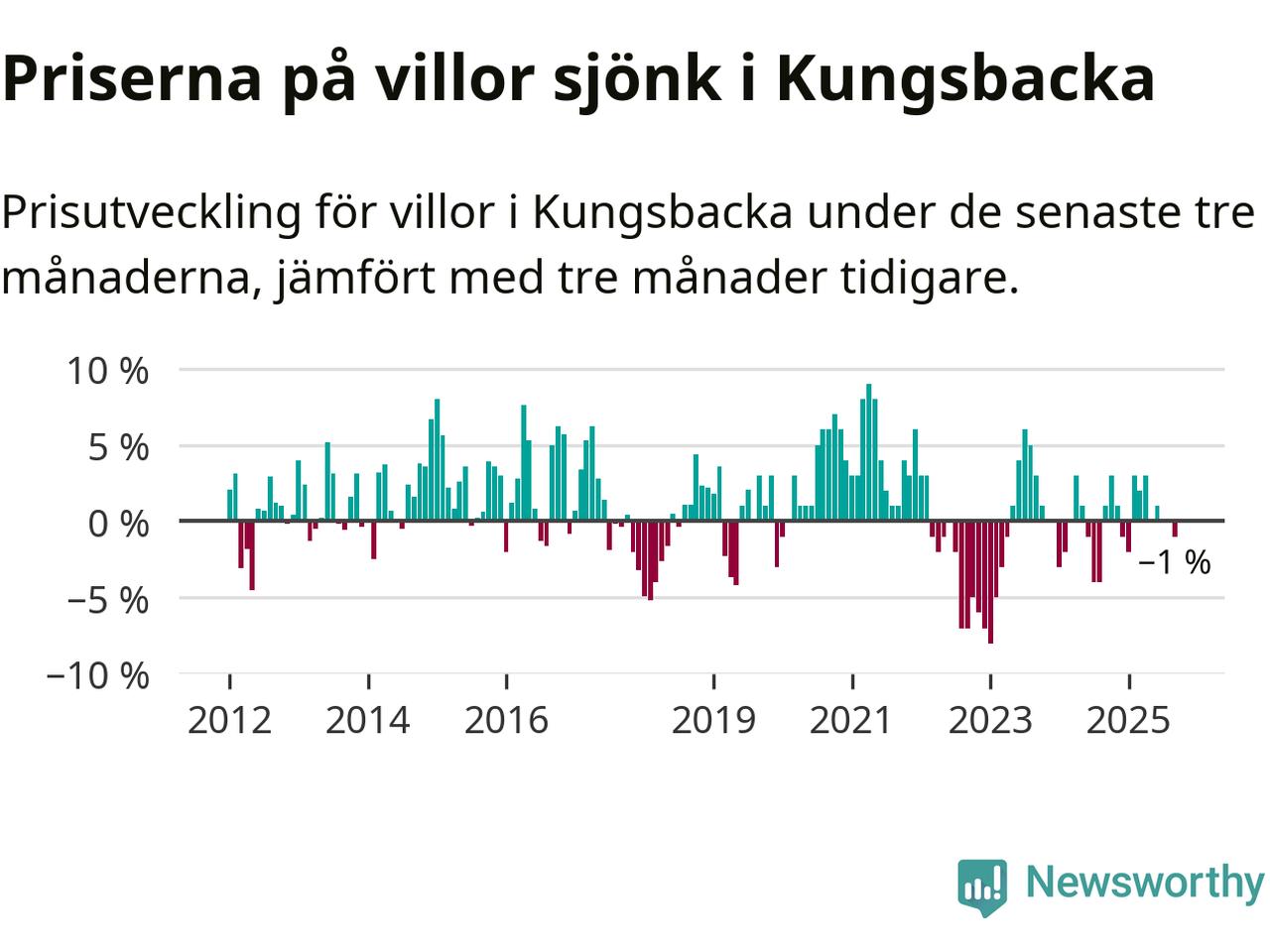 Villapriserna har gått ner i Kungsbacka kommun. Medelpriset på försäljningarna under de senaste tre månaderna visar på en nedgång med 1 procent.