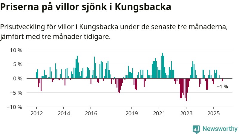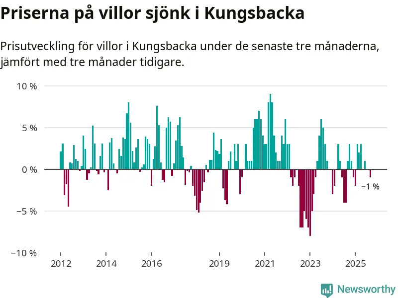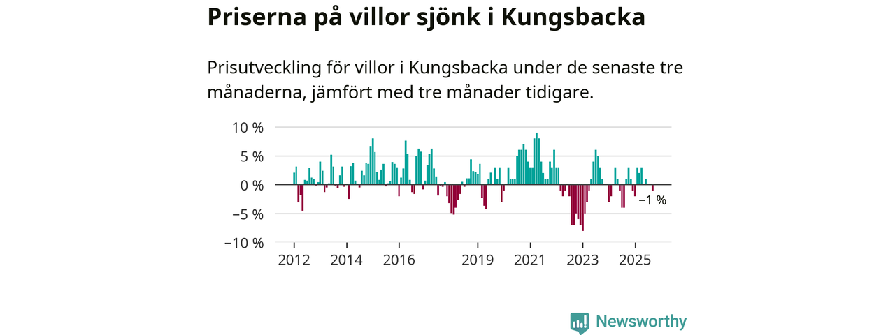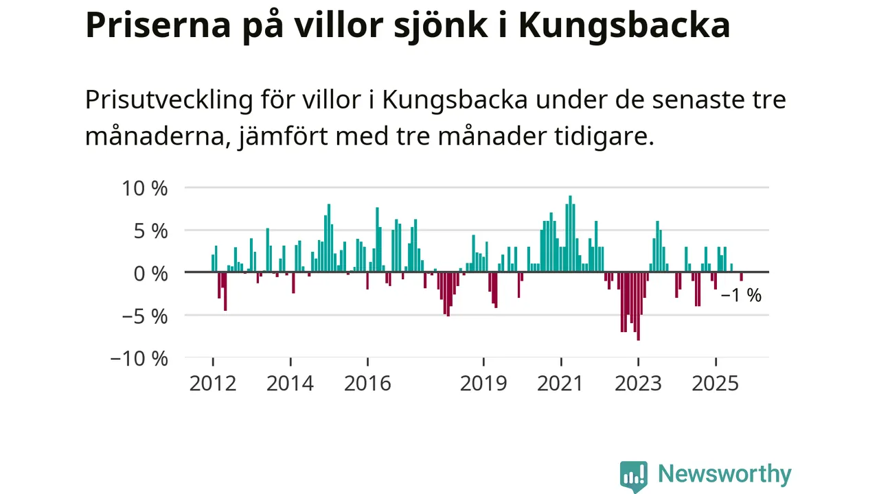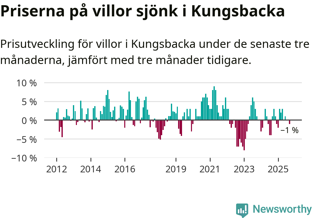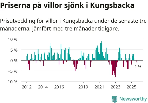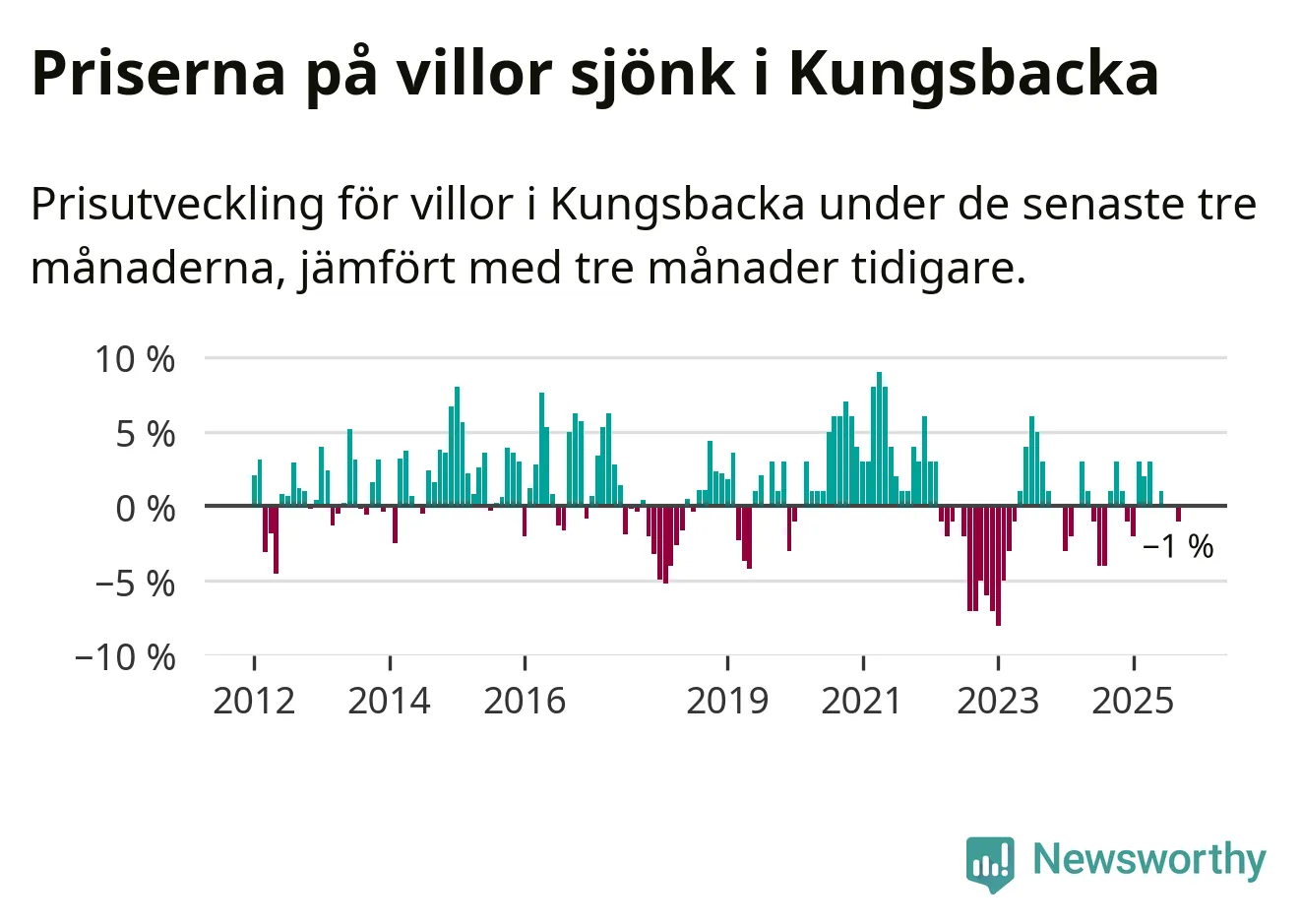 Villapriserna har gått ner i Kungsbacka kommun. Medelpriset på försäljningarna under de senaste tre månaderna visar på en nedgång med 1 procent.