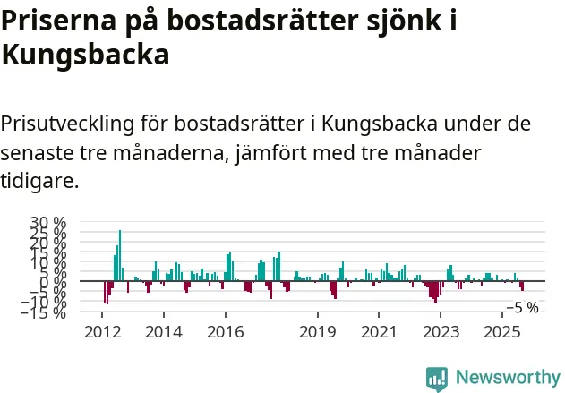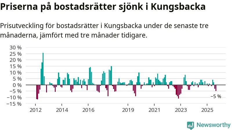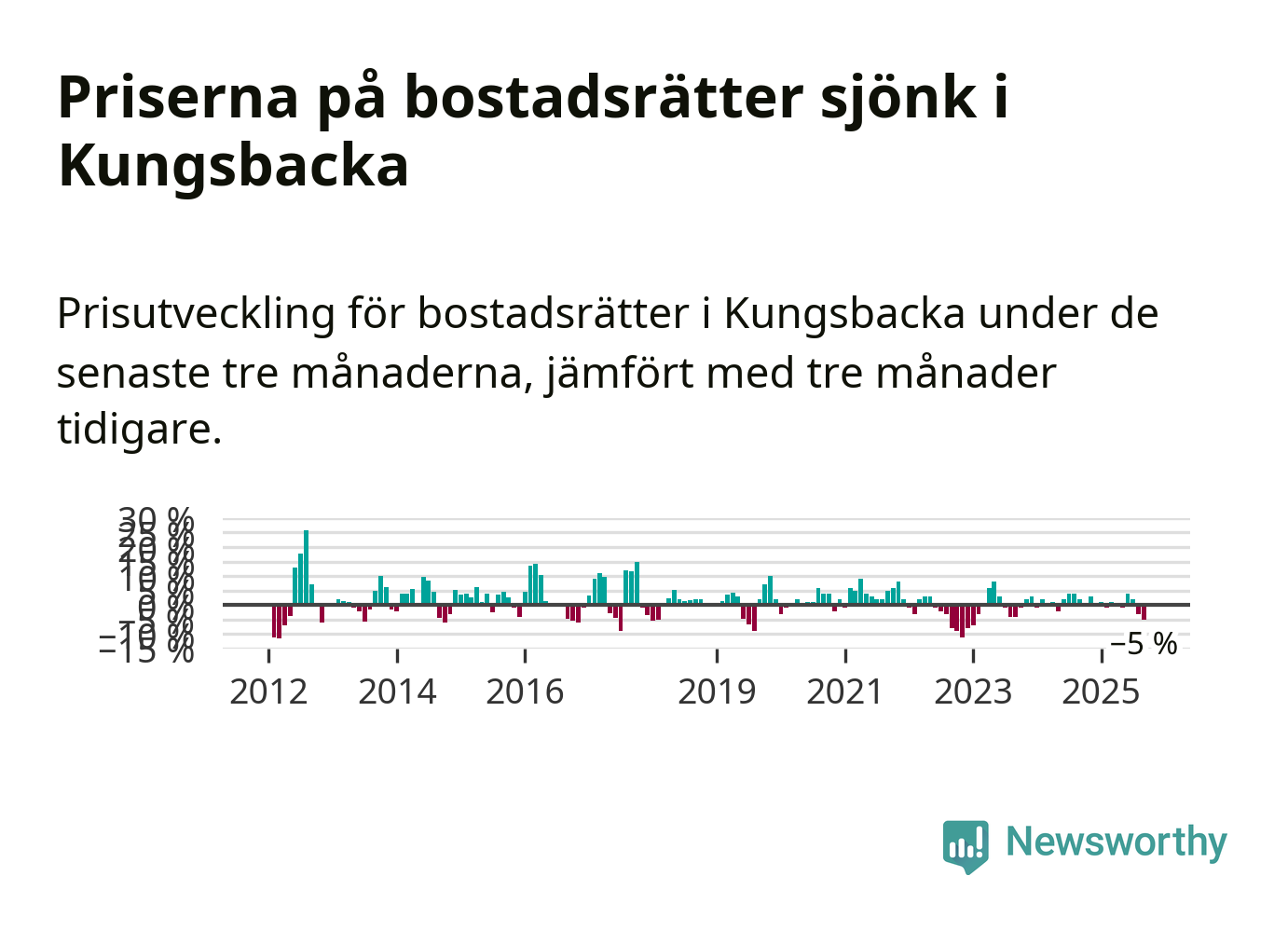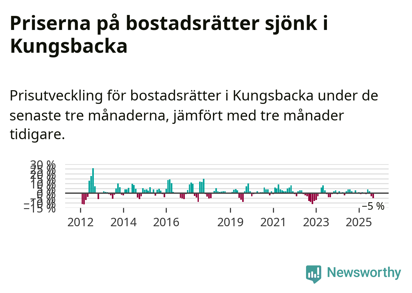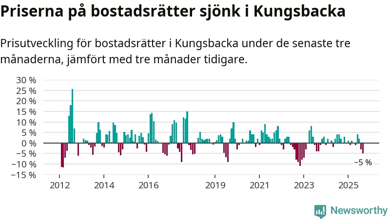 Priserna på bostadsrätter har gått ner i Kungsbacka kommun. Medelpriset på försäljningarna under de senaste tre månaderna visar på en nedgång med 5 procent.