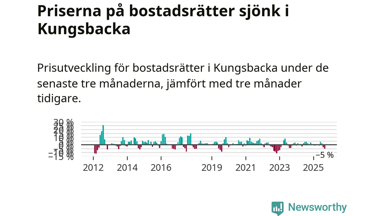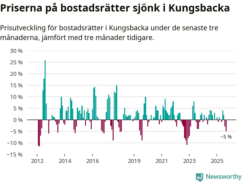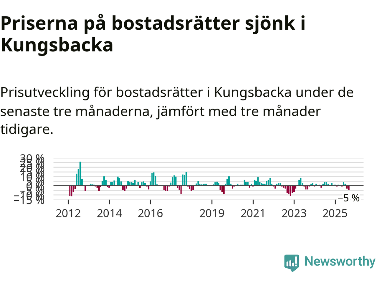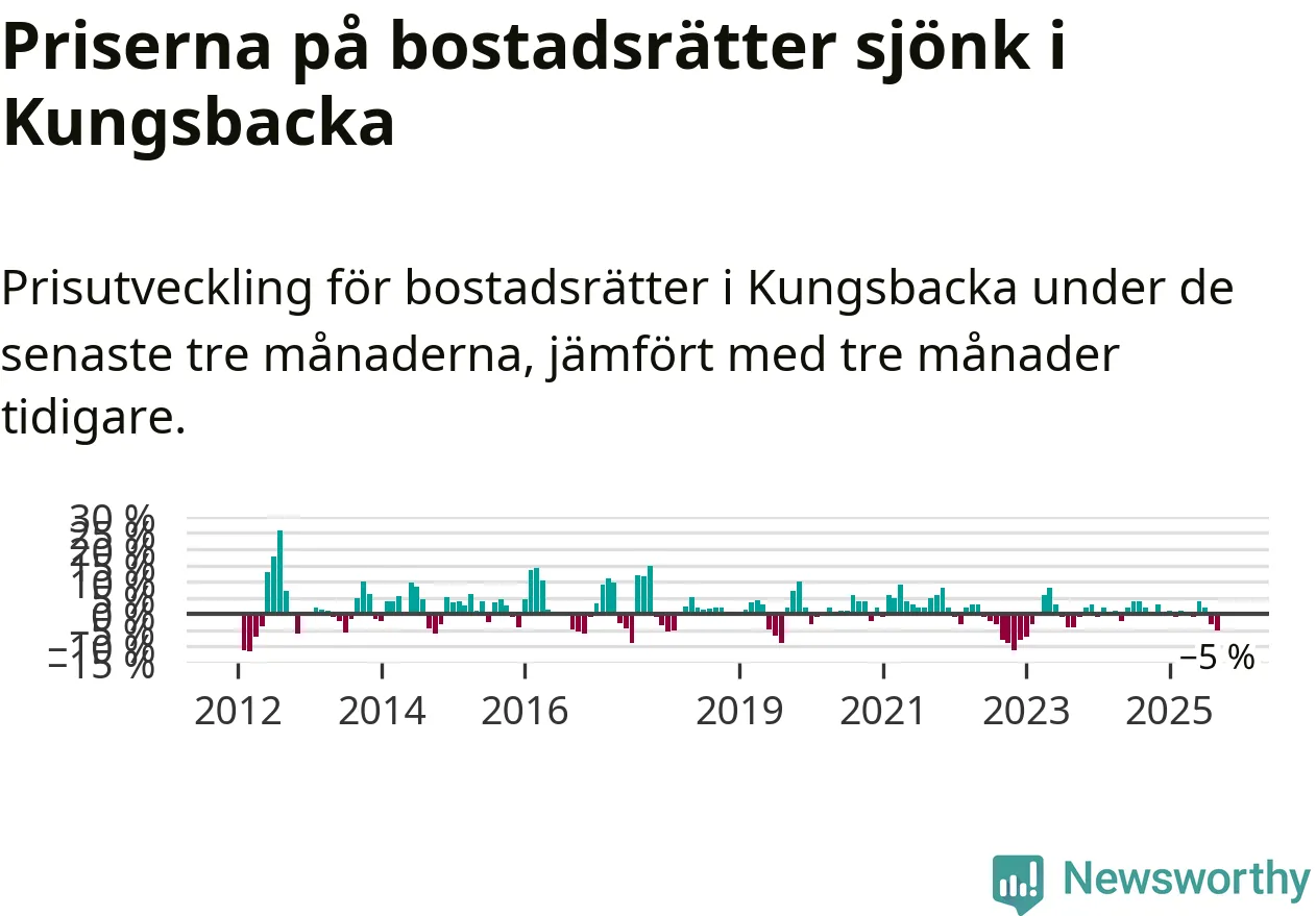 Priserna på bostadsrätter har gått ner i Kungsbacka kommun. Medelpriset på försäljningarna under de senaste tre månaderna visar på en nedgång med 5 procent.