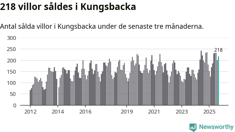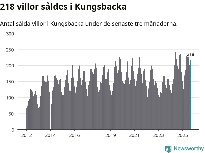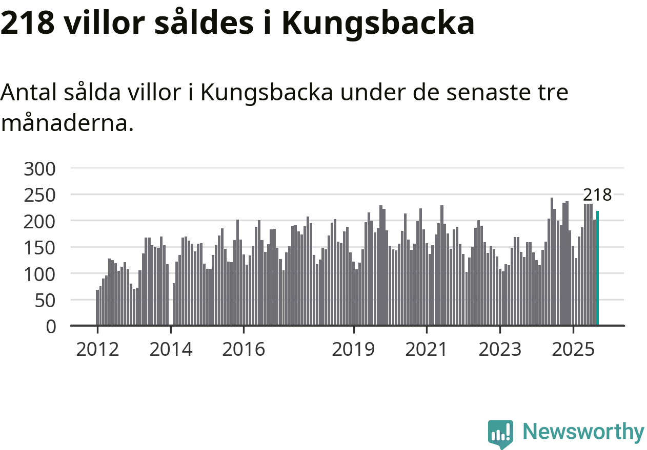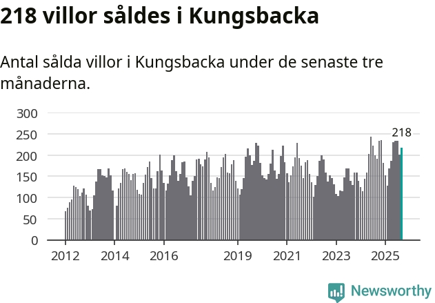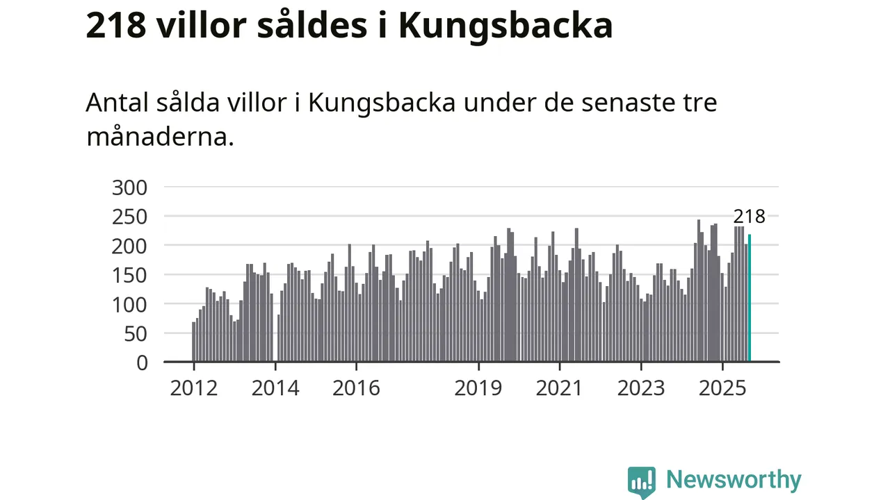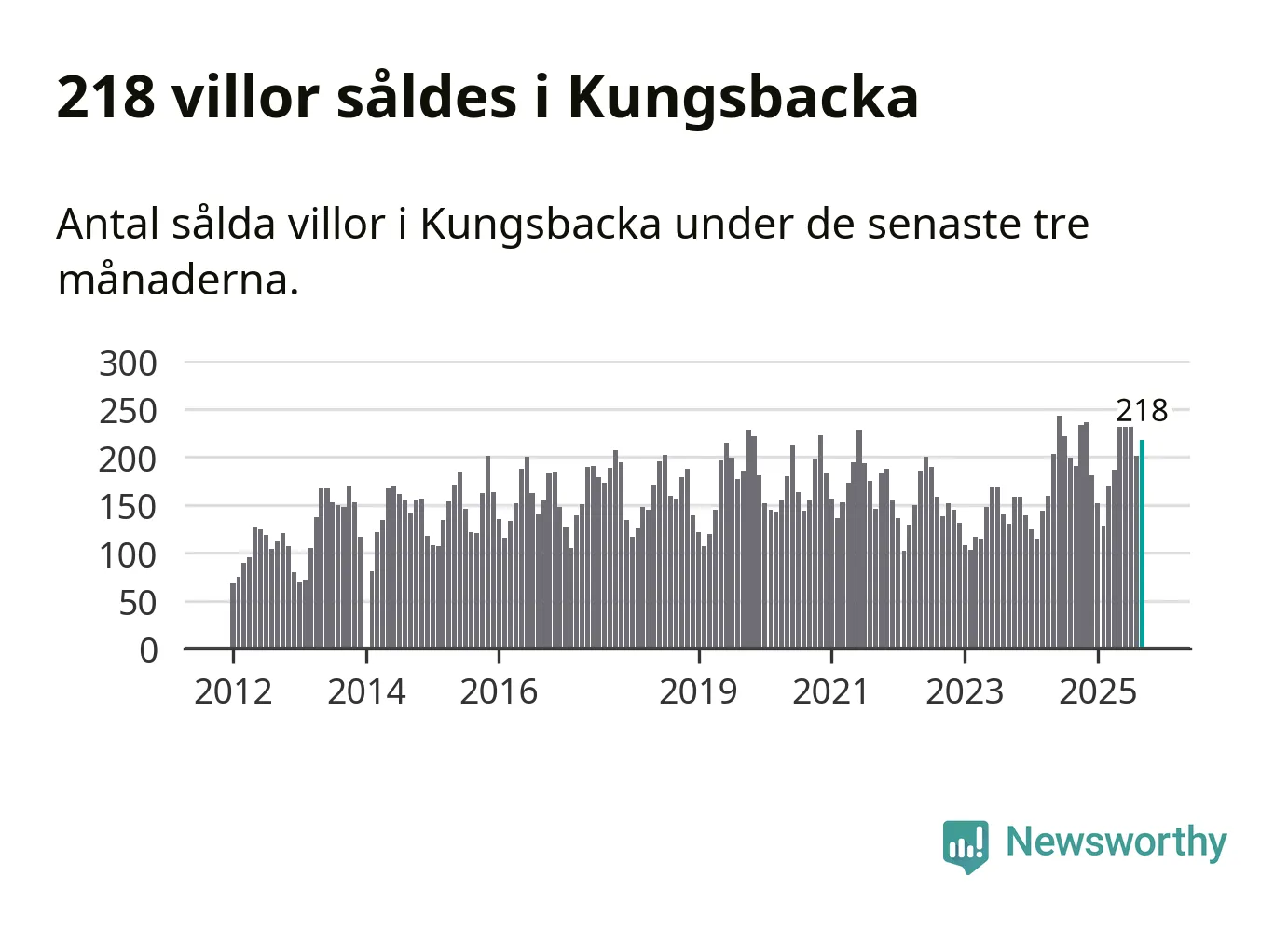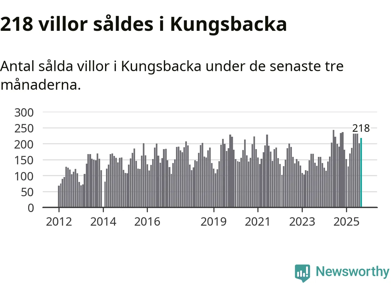 Sammanlagt såldes 218 villor i Kungsbacka kommun mellan juli och september till ett genomsnittligt pris på 5,7 miljoner kronor. I fjol gjordes 191 affärer vid den här tiden på året.