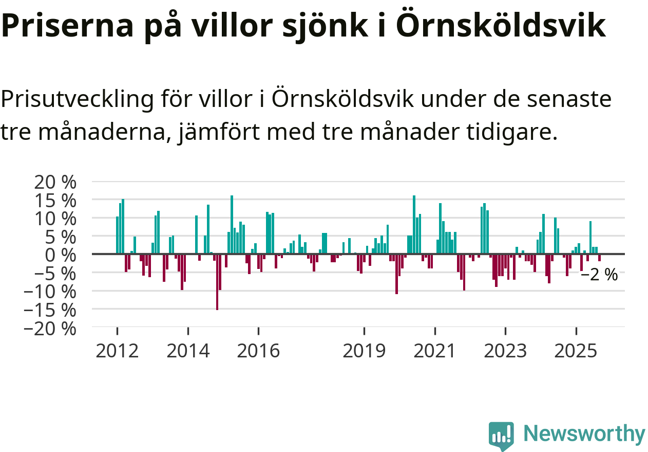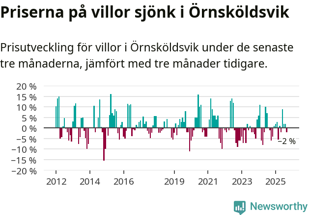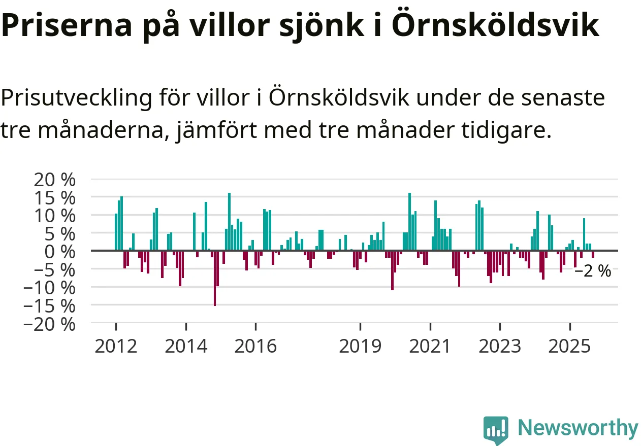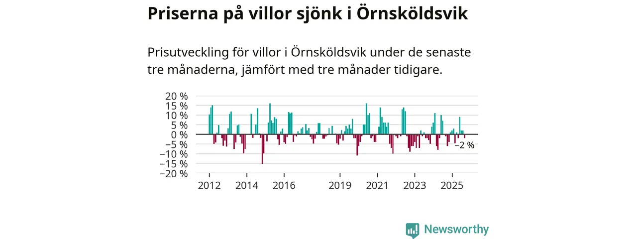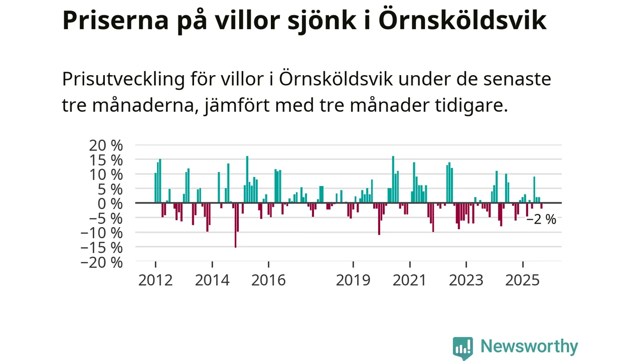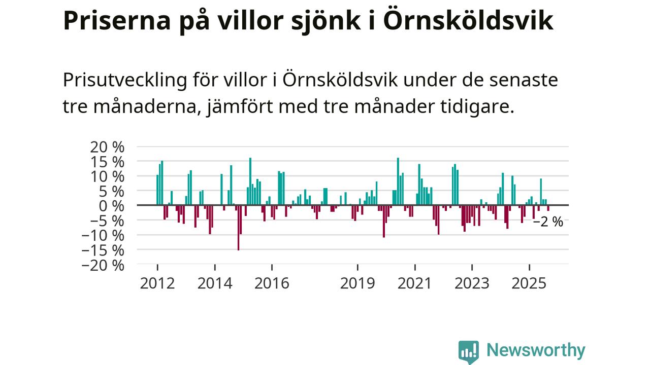 Villapriserna har gått ner i Örnsköldsviks kommun. Medelpriset på försäljningarna under de senaste tre månaderna visar på en nedgång med 2 procent.