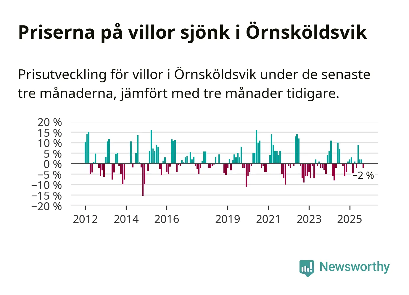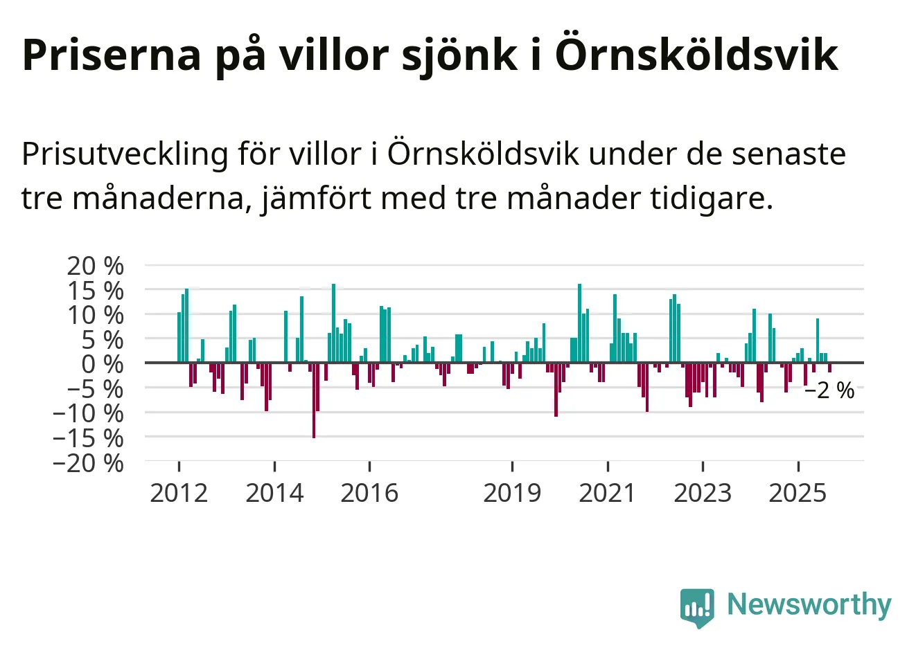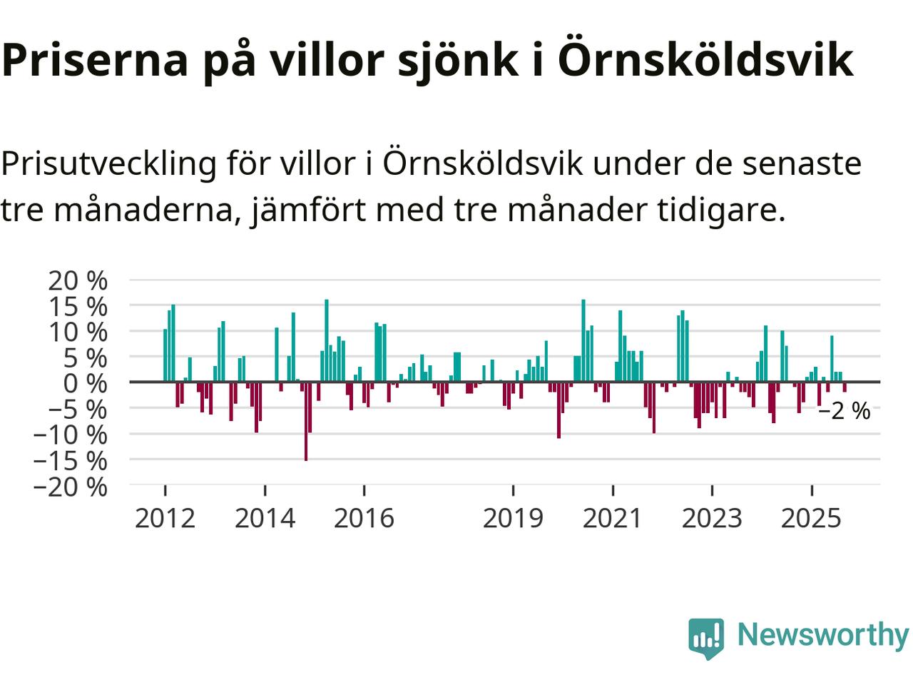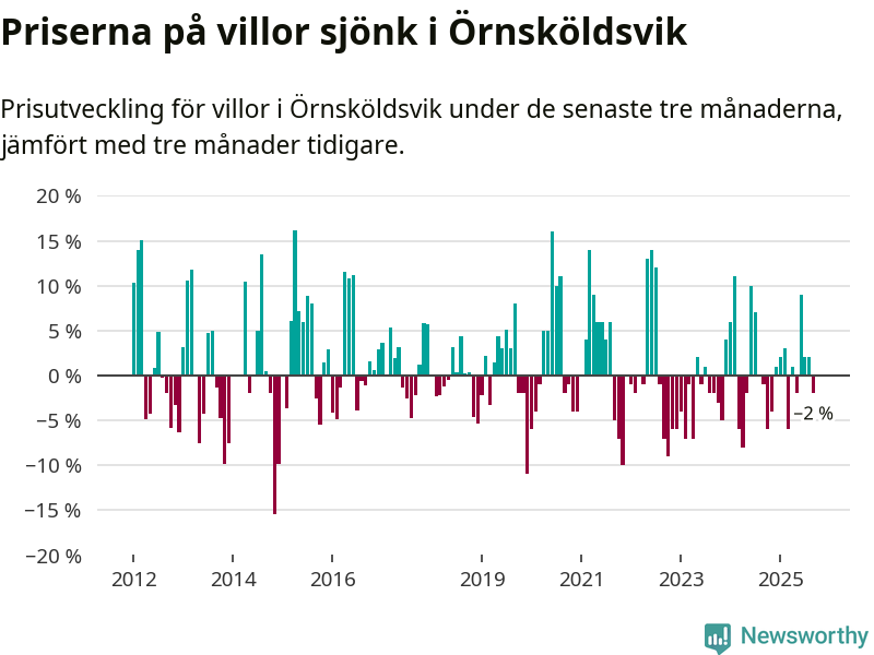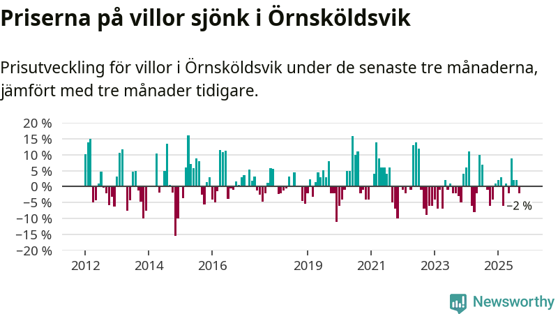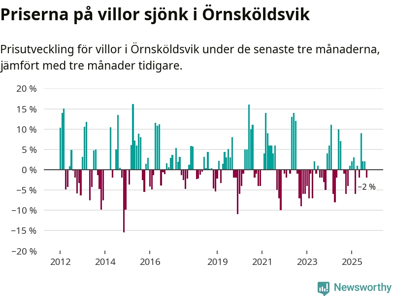 Villapriserna har gått ner i Örnsköldsviks kommun. Medelpriset på försäljningarna under de senaste tre månaderna visar på en nedgång med 2 procent.