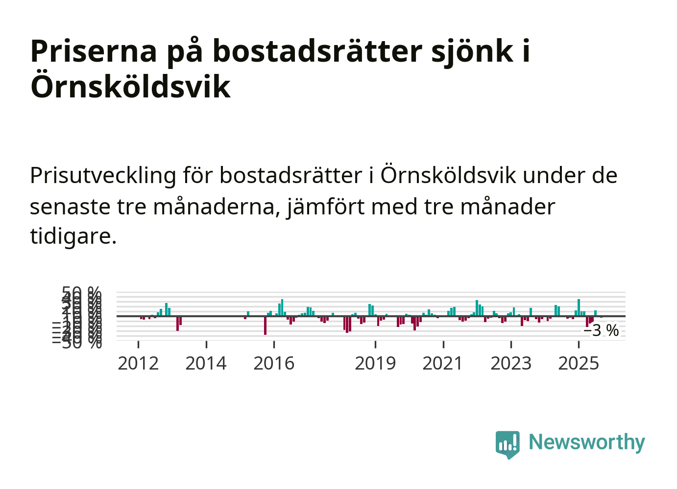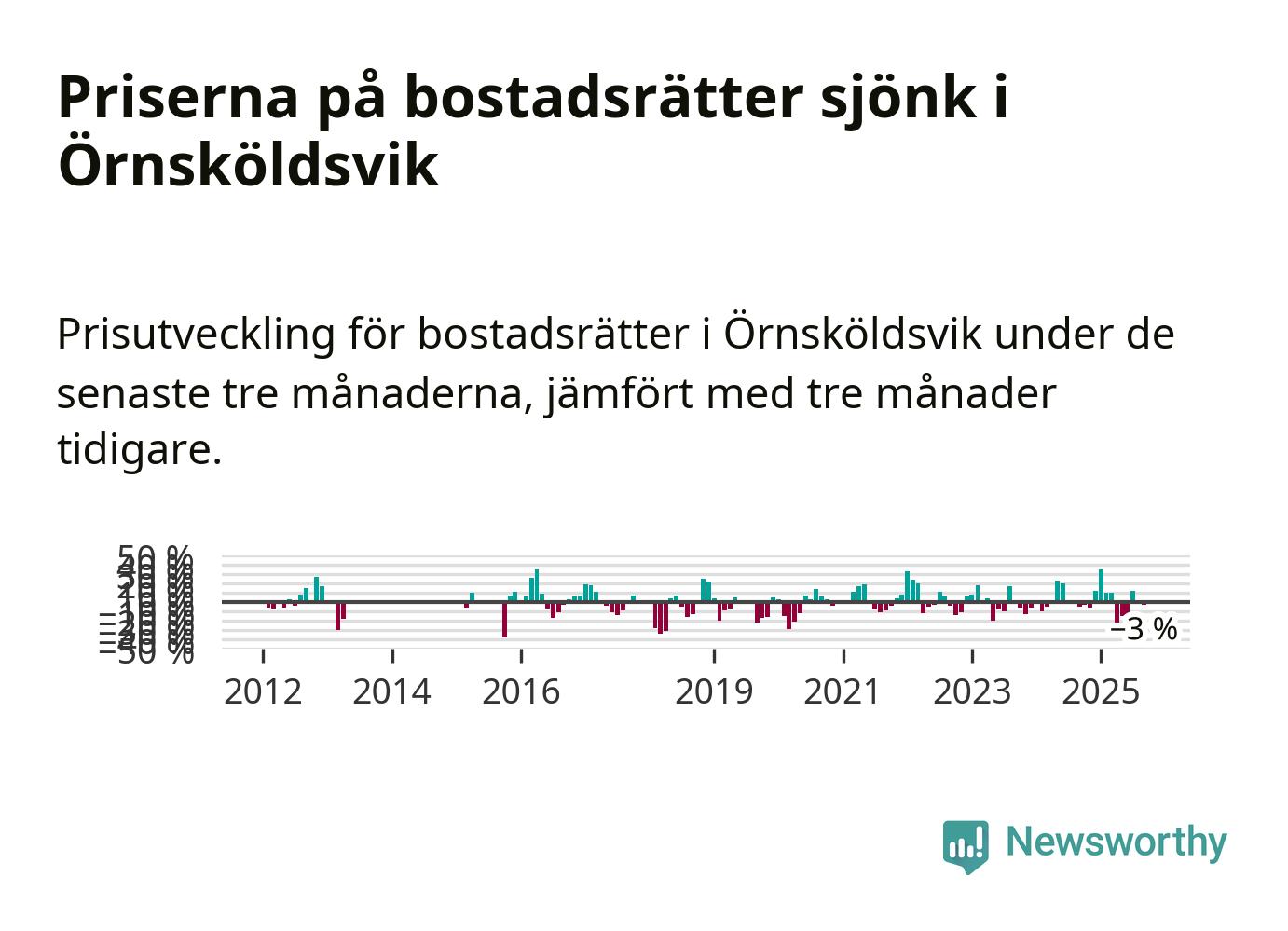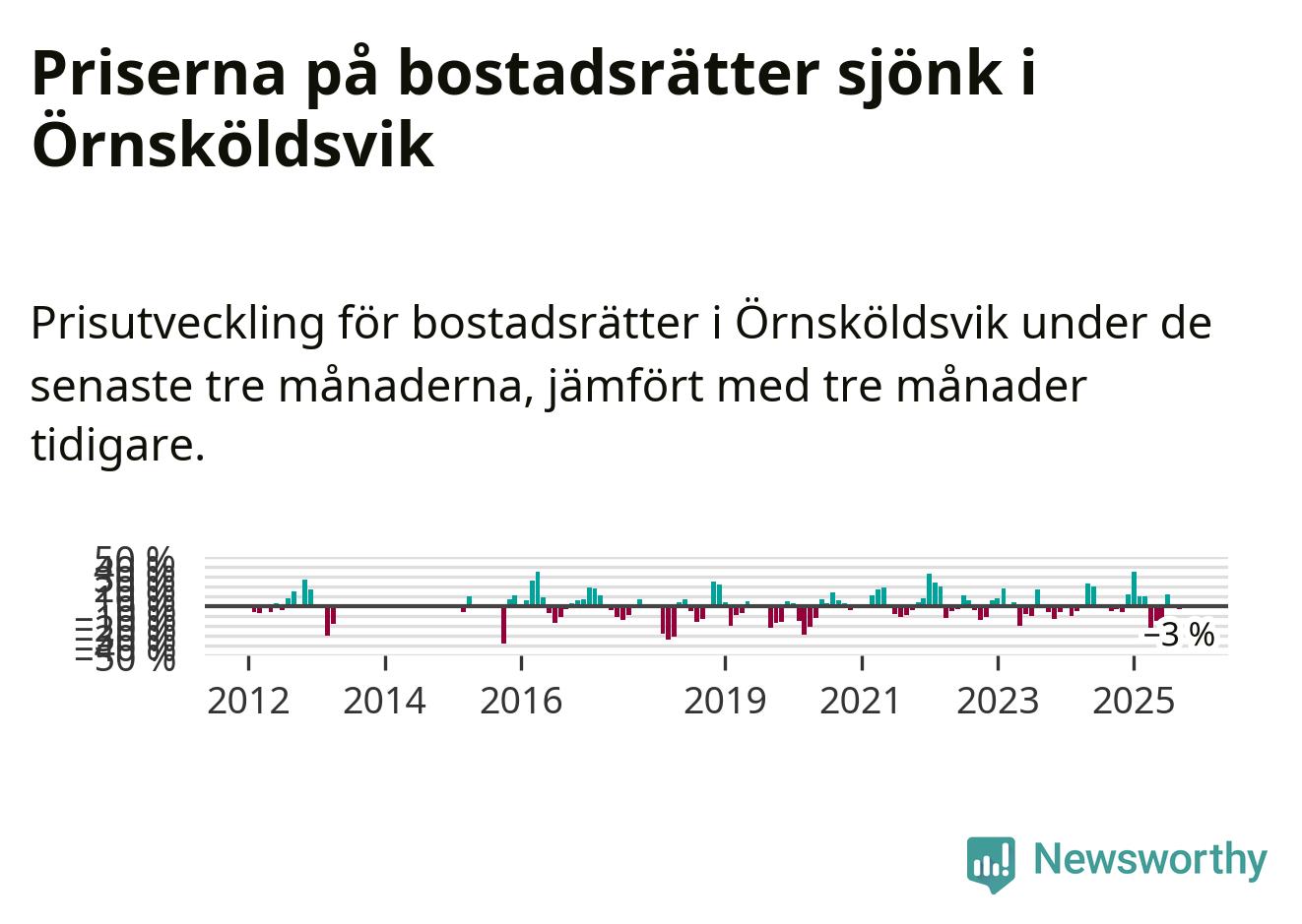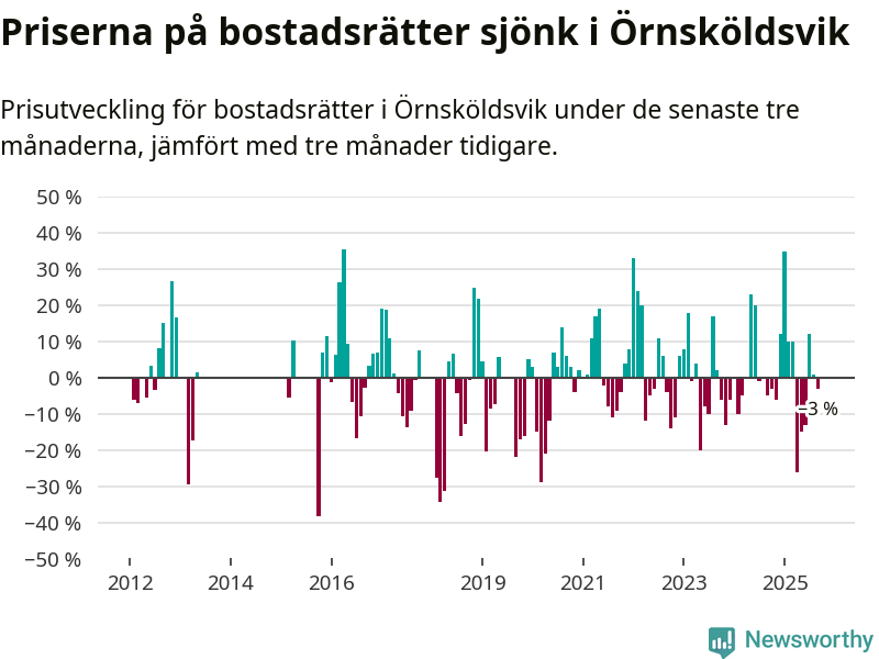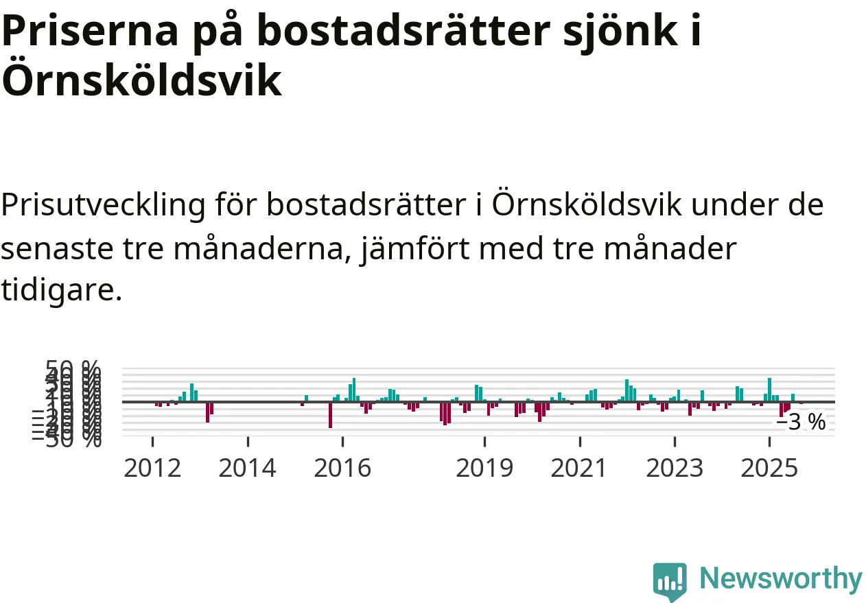 Priserna på bostadsrätter har gått ner i Örnsköldsviks kommun. Medelpriset på försäljningarna under de senaste tre månaderna visar på en nedgång med 3 procent.