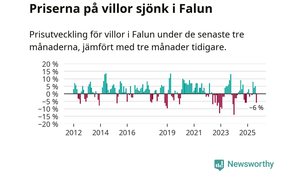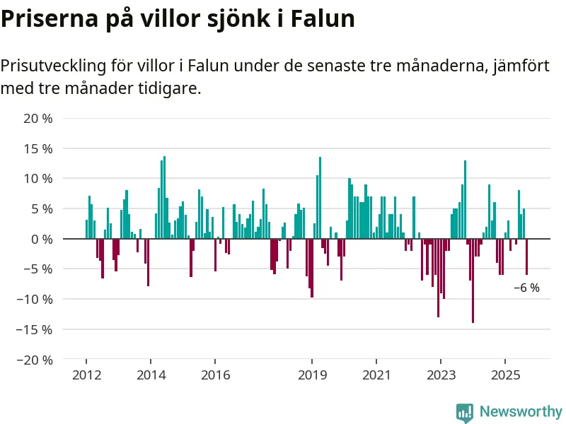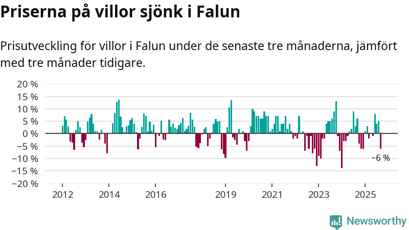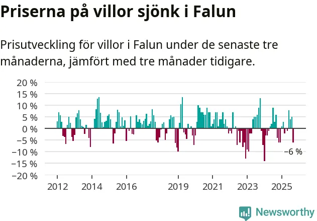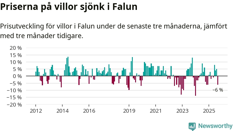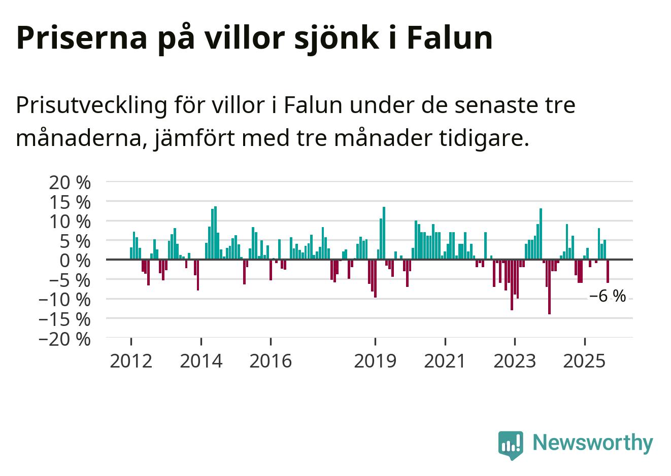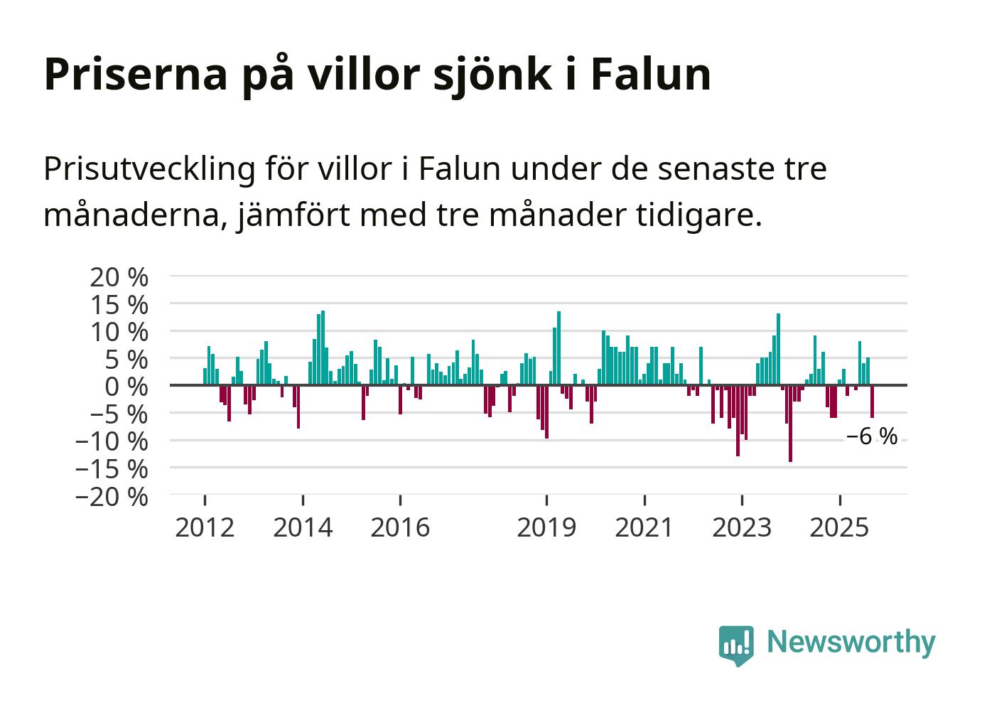 Villapriserna har gått ner i Falu kommun. Medelpriset på försäljningarna under de senaste tre månaderna visar på en nedgång med 6 procent.