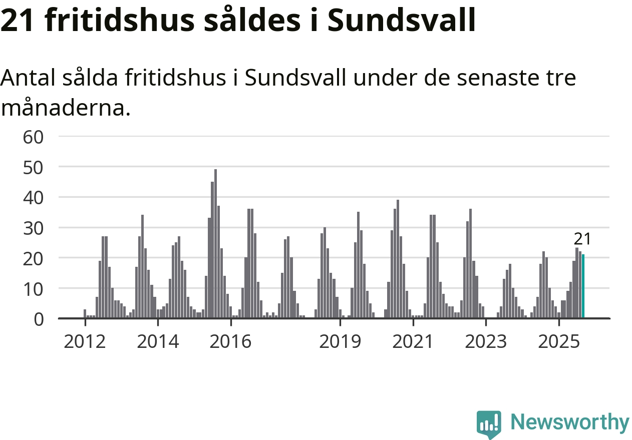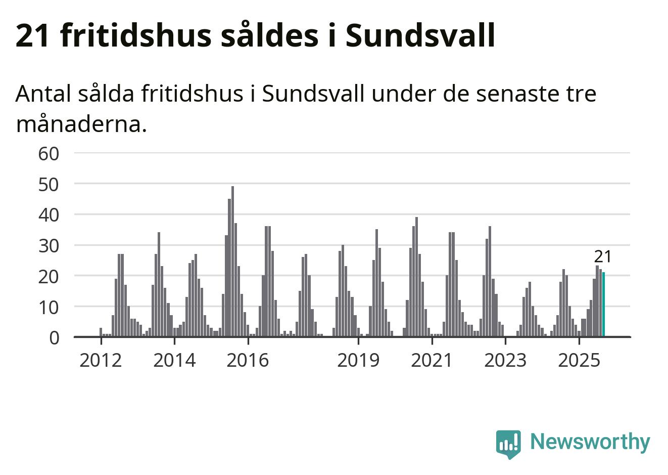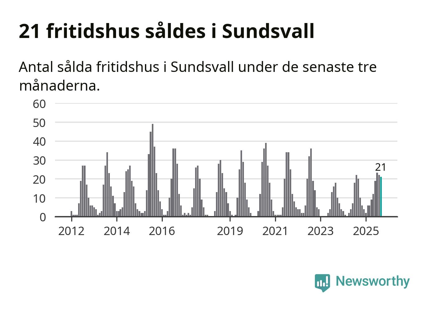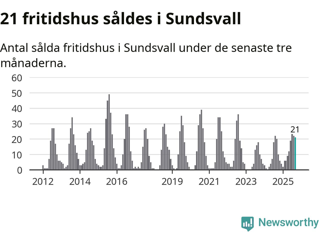 Sammanlagt såldes 21 fritidshus i Sundsvalls kommun mellan juli och september till ett genomsnittligt pris på 1,6 miljoner kronor. I fjol gjordes 20 affärer vid den här tiden på året.