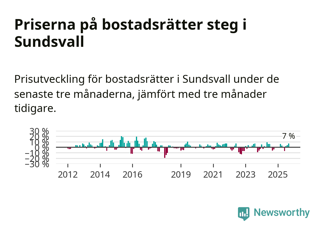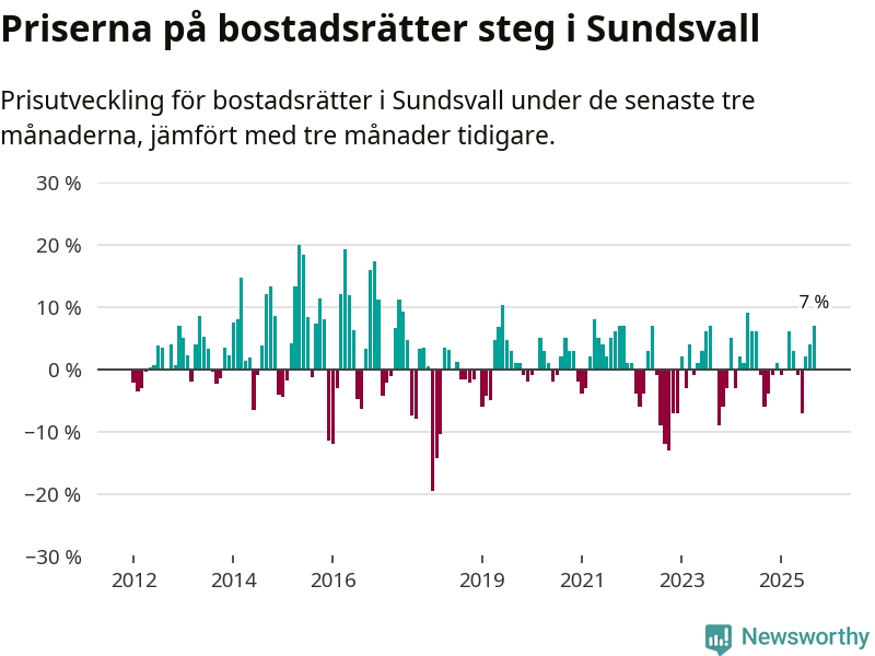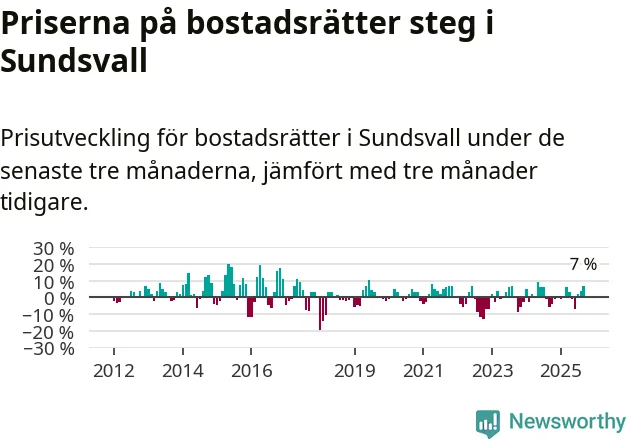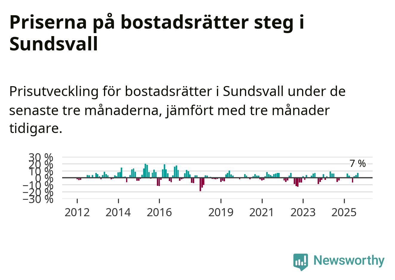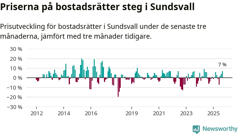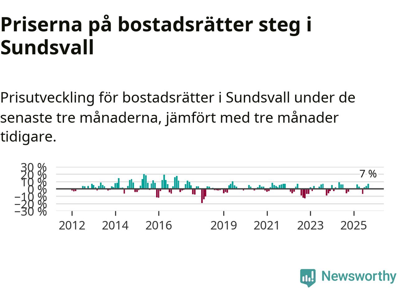Priserna på bostadsrätter har gått upp i Sundsvalls kommun. Medelpriset på försäljningarna under de senaste tre månaderna visar på en uppgång med 7 procent.