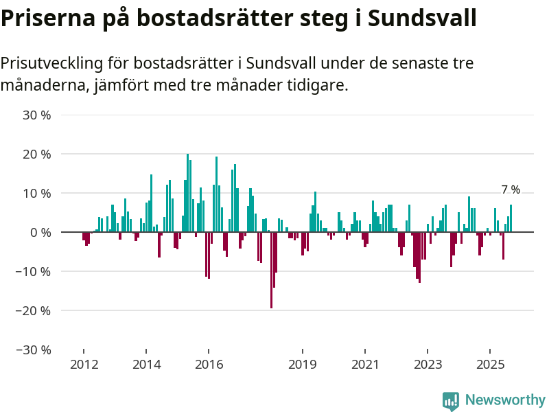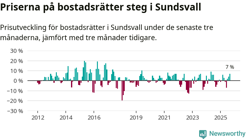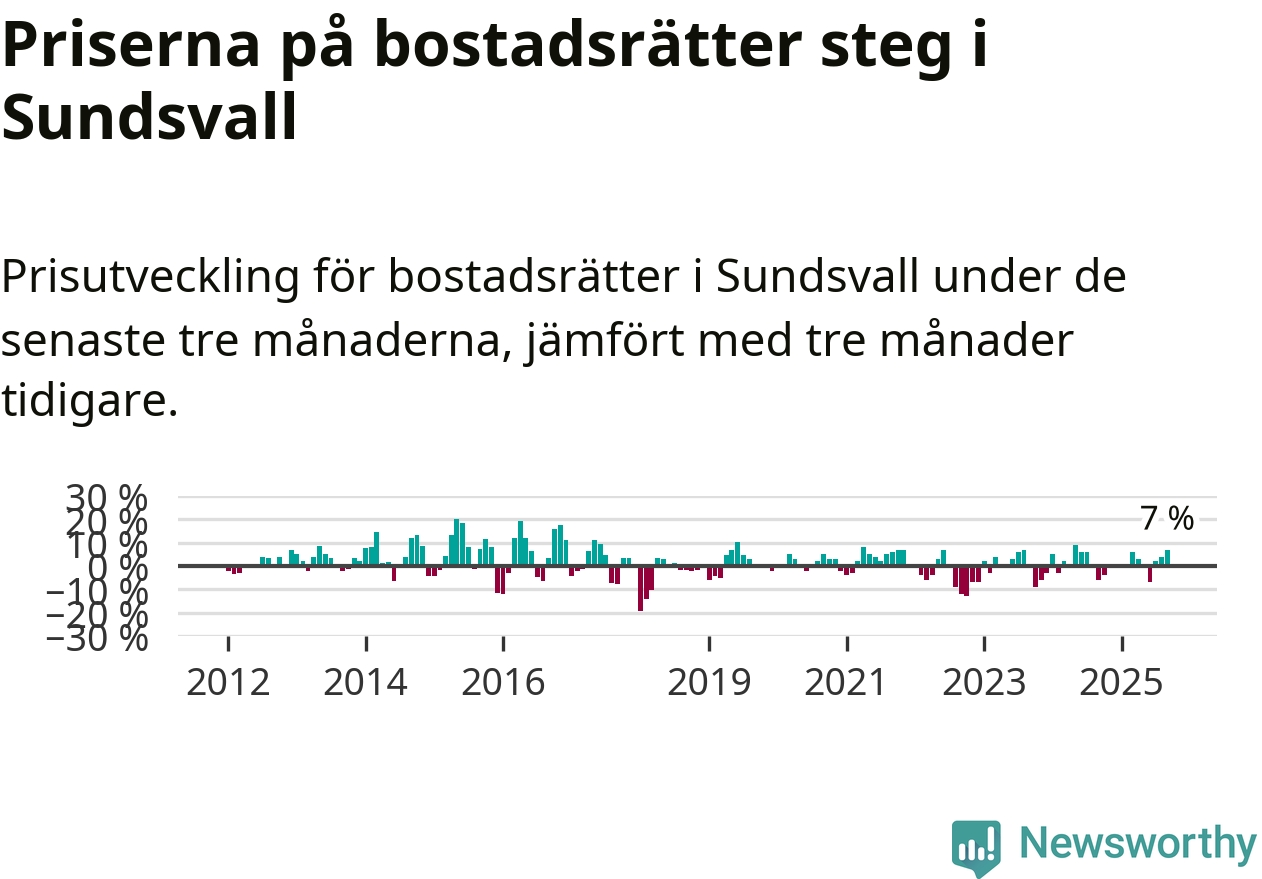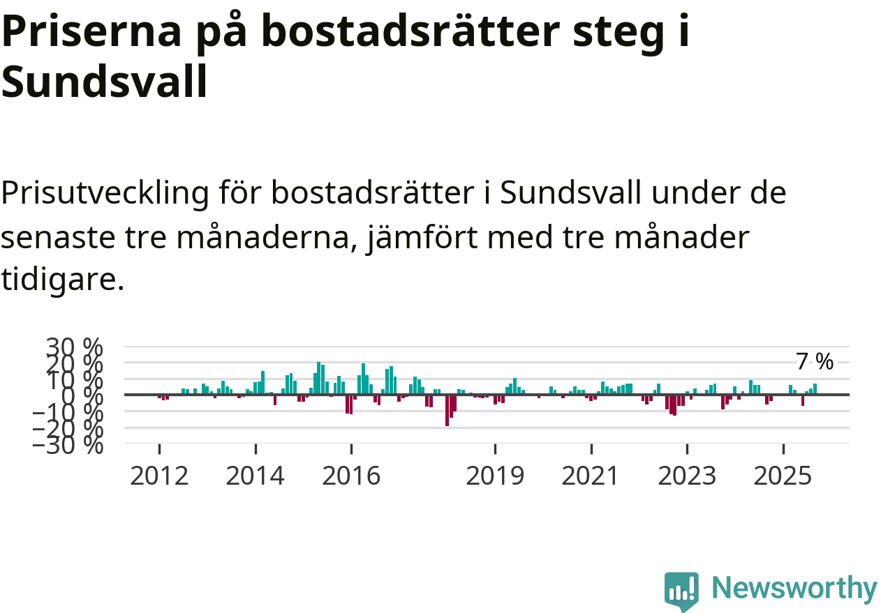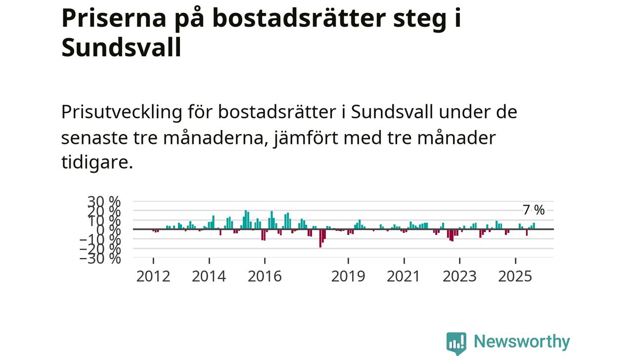 Priserna på bostadsrätter har gått upp i Sundsvalls kommun. Medelpriset på försäljningarna under de senaste tre månaderna visar på en uppgång med 7 procent.