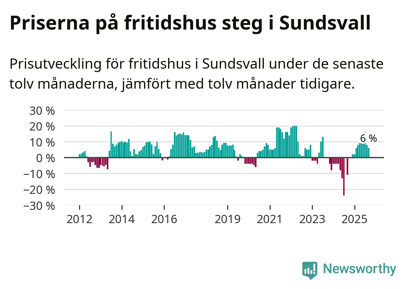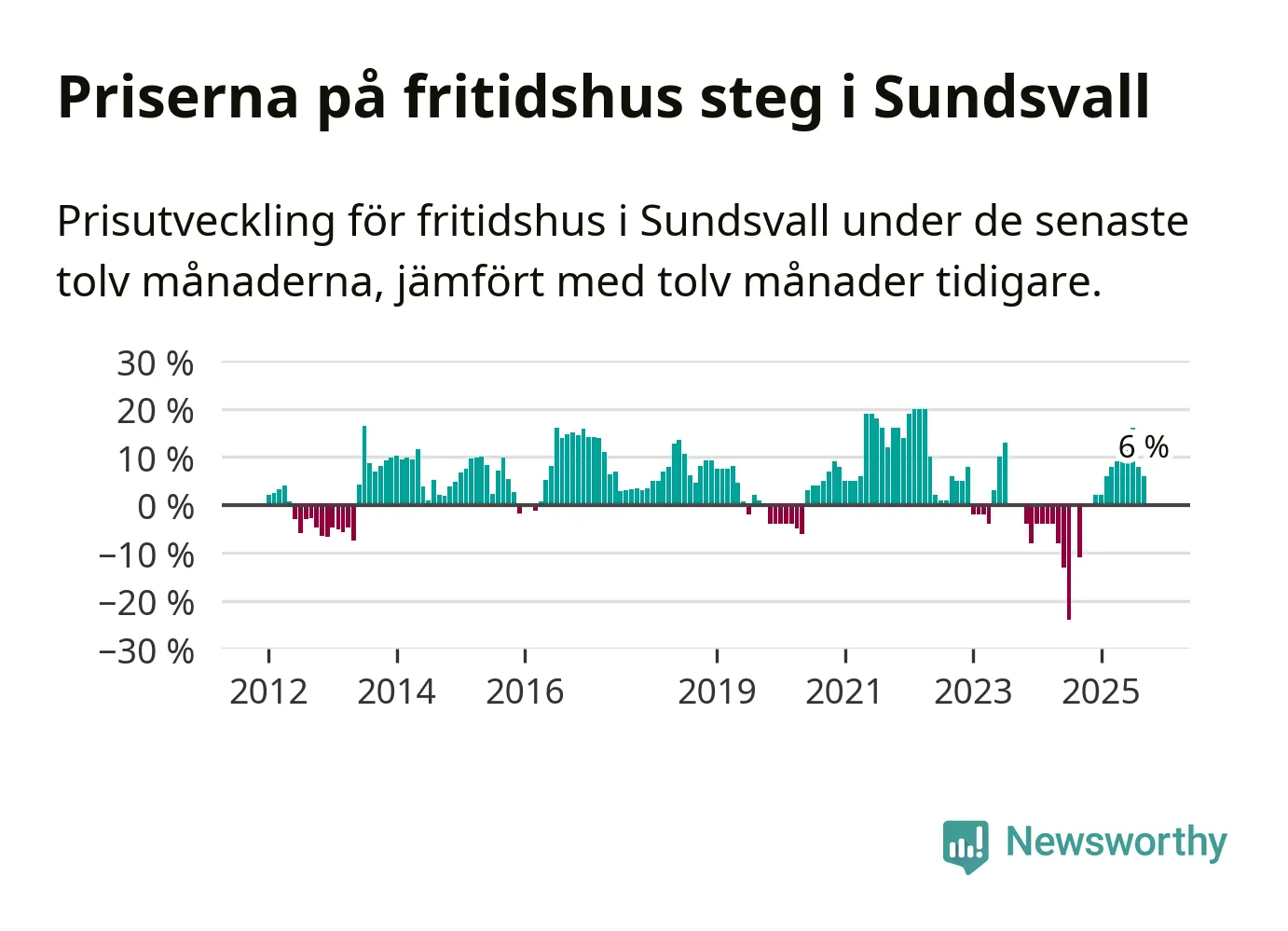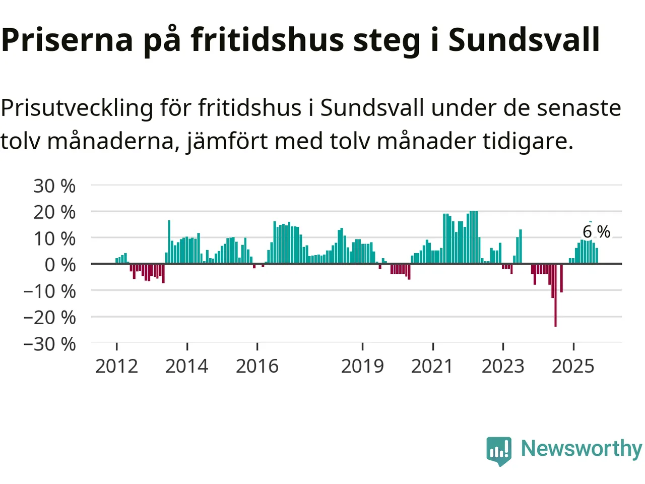 Priserna på fritidshus har gått upp i Sundsvalls kommun. Medelpriset på försäljningarna under de senaste tolv månaderna visar på en uppgång med 6 procent.