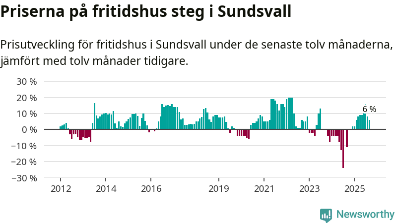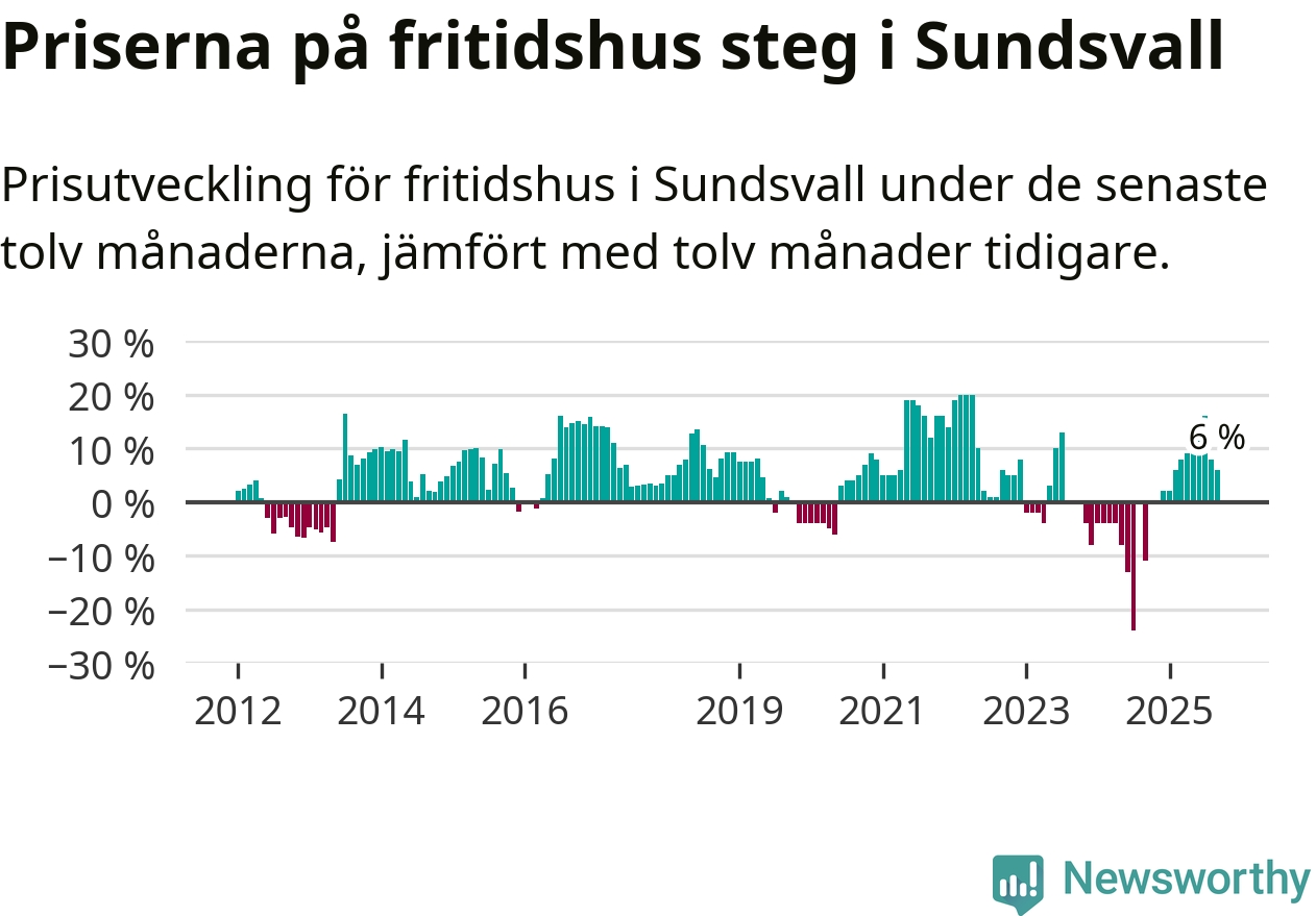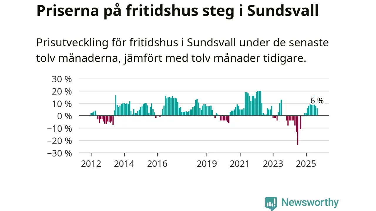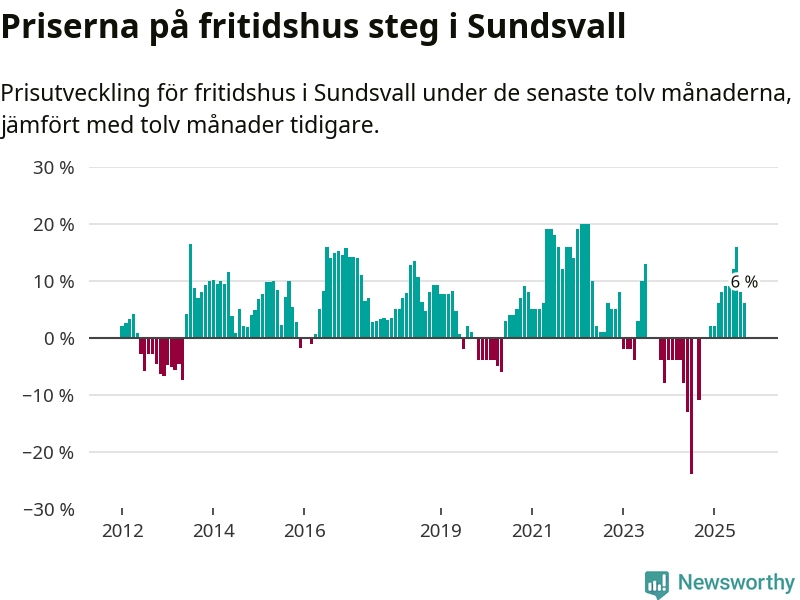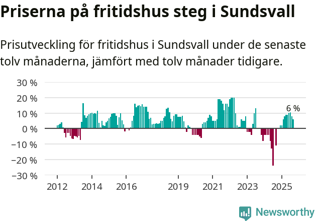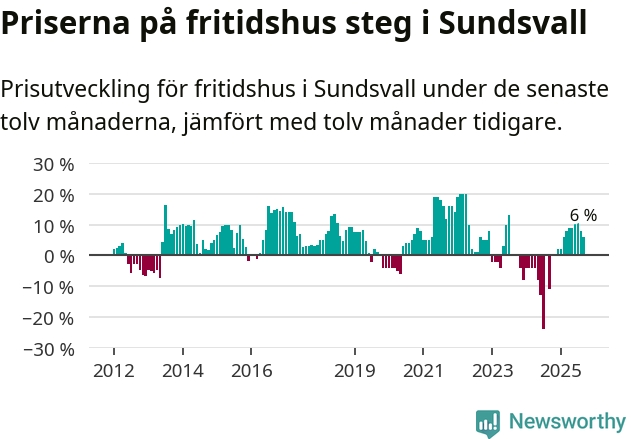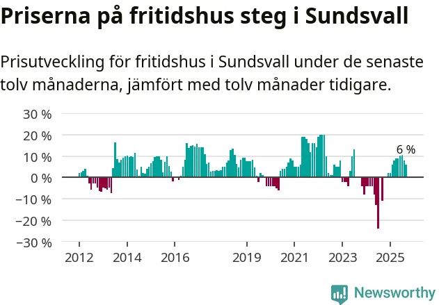 Priserna på fritidshus har gått upp i Sundsvalls kommun. Medelpriset på försäljningarna under de senaste tolv månaderna visar på en uppgång med 6 procent.