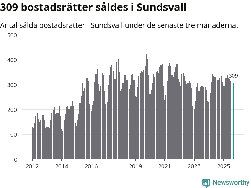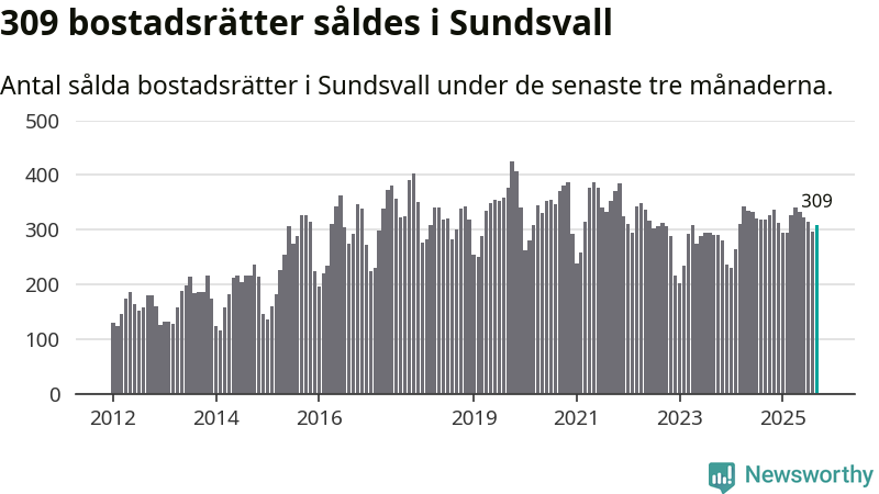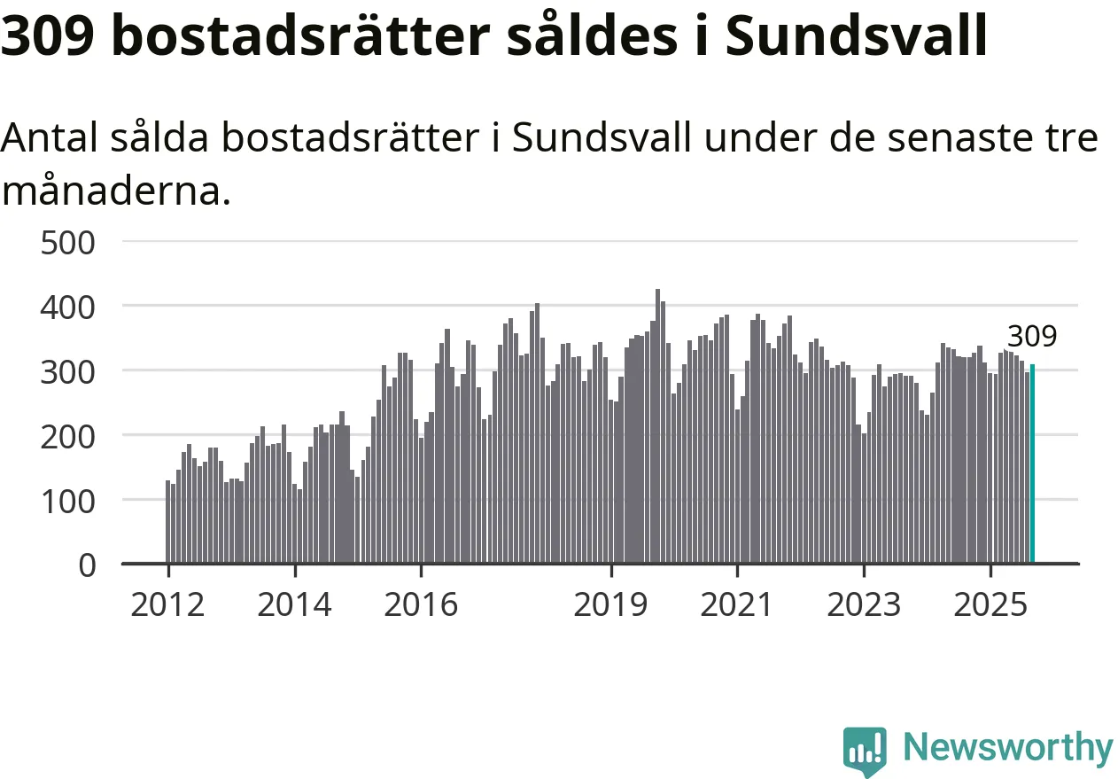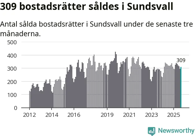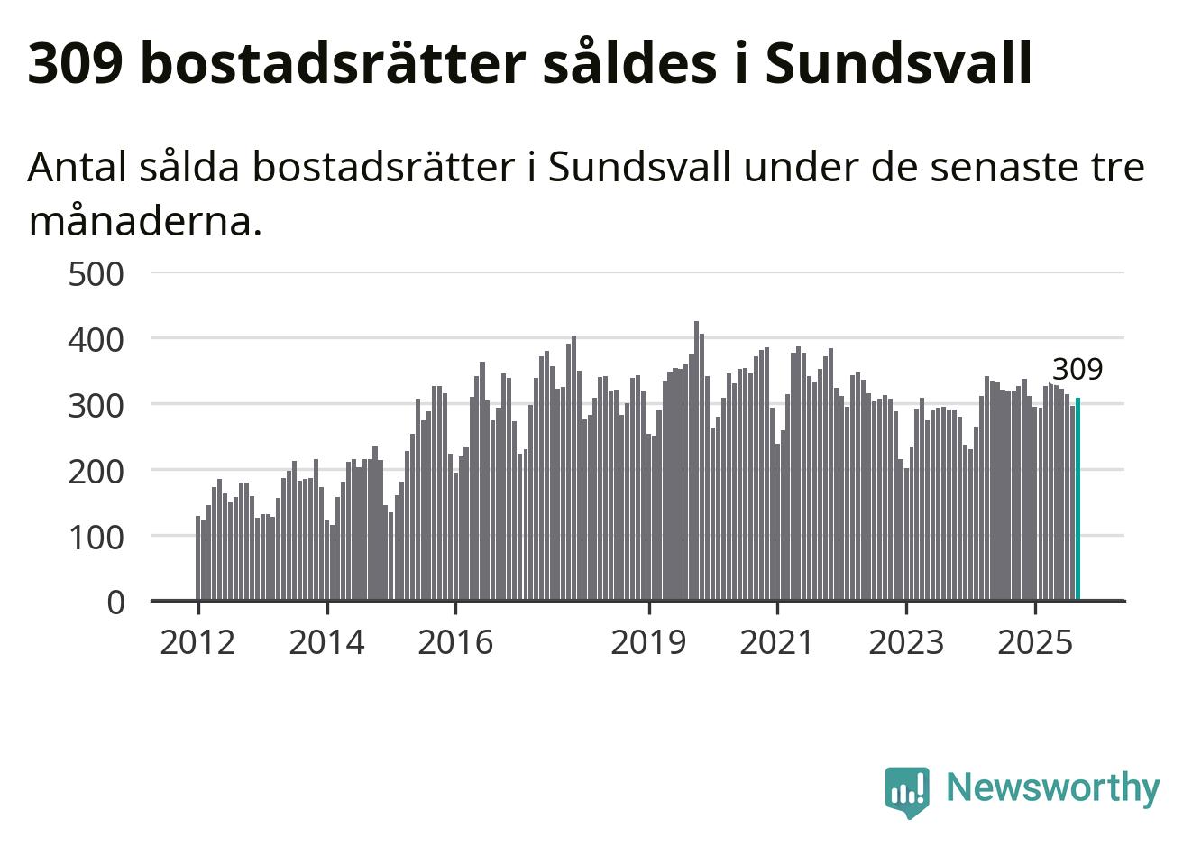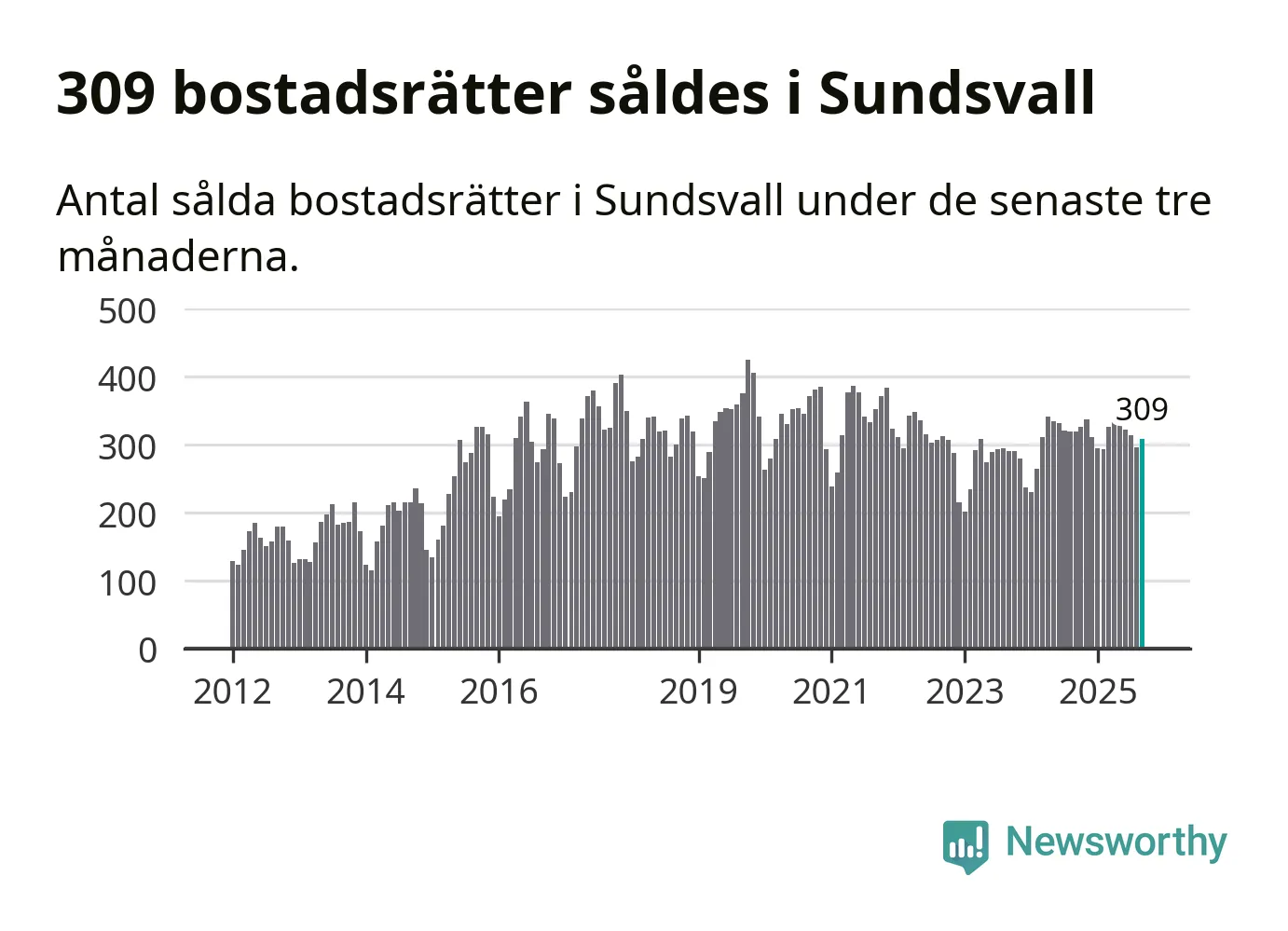 Sammanlagt såldes 309 bostadsrätter i Sundsvalls kommun mellan juli och september till ett genomsnittligt pris på 1,2 miljoner kronor. I fjol gjordes 319 affärer vid den här tiden på året.