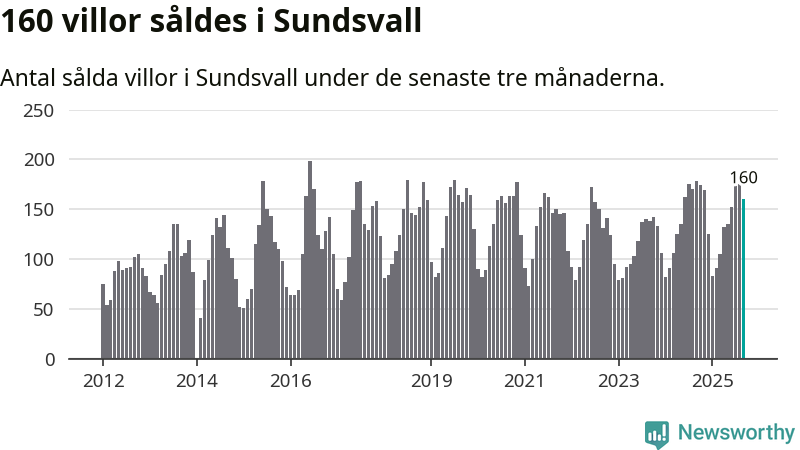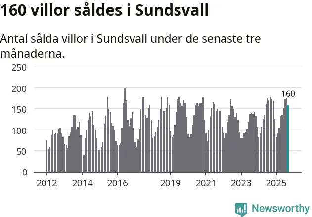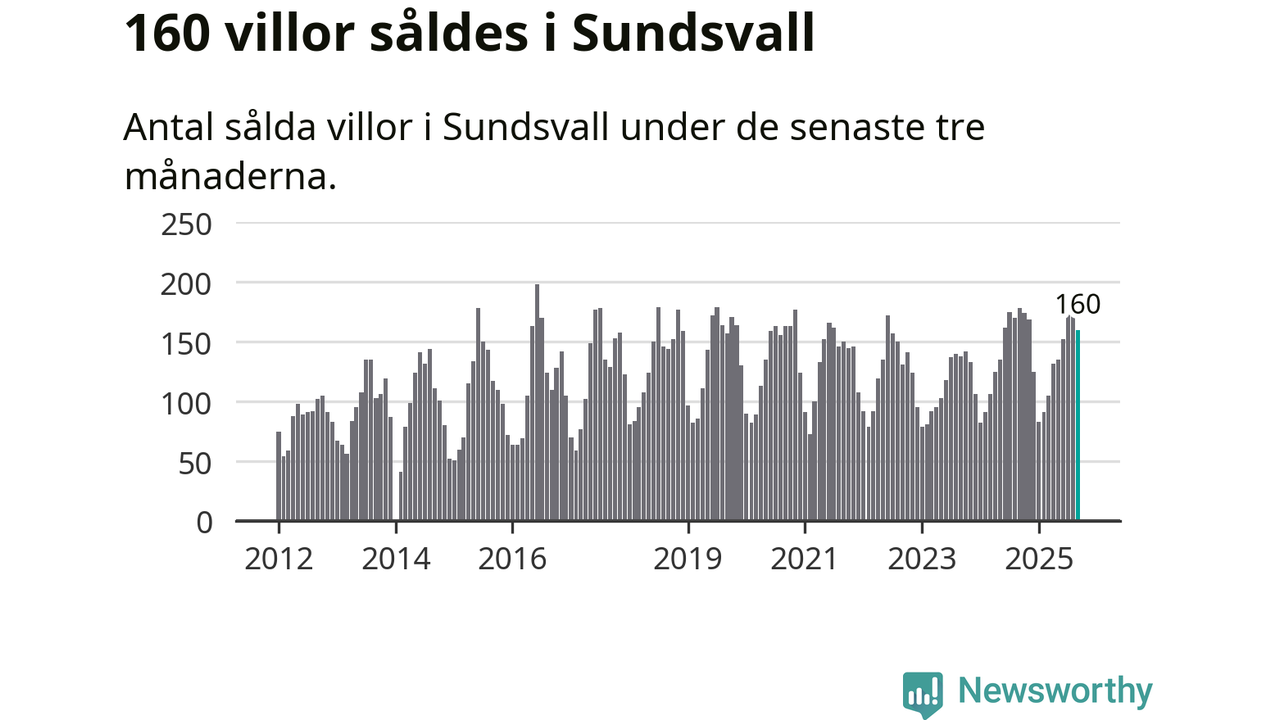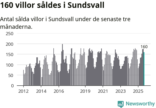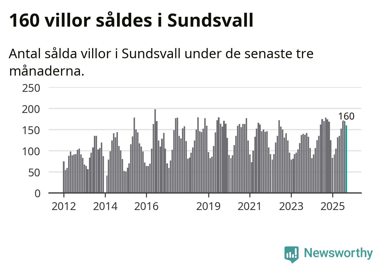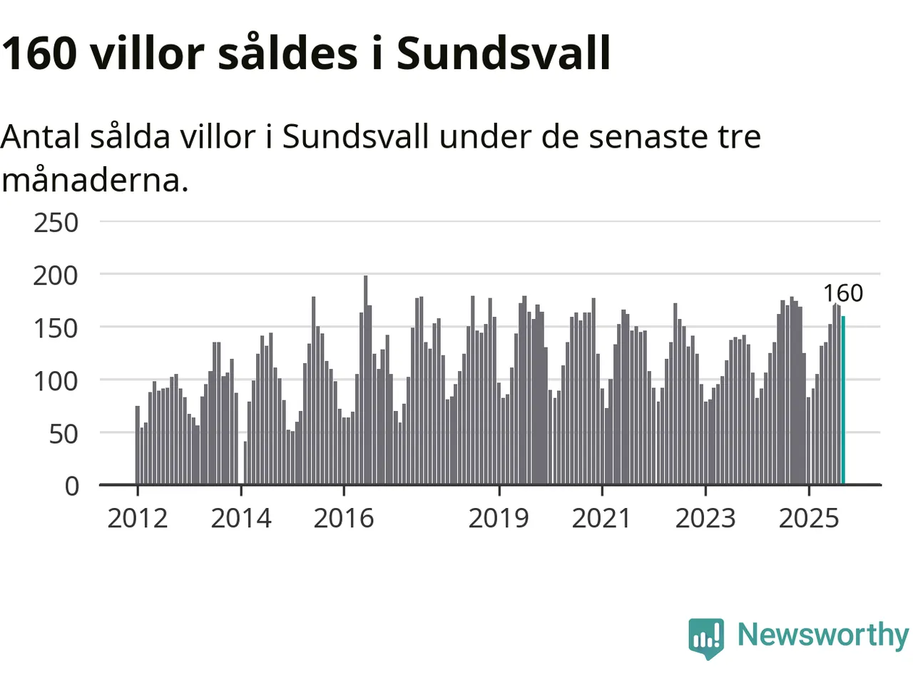 Sammanlagt såldes 160 villor i Sundsvalls kommun mellan juli och september till ett genomsnittligt pris på 2,8 miljoner kronor. I fjol gjordes 178 affärer vid den här tiden på året.