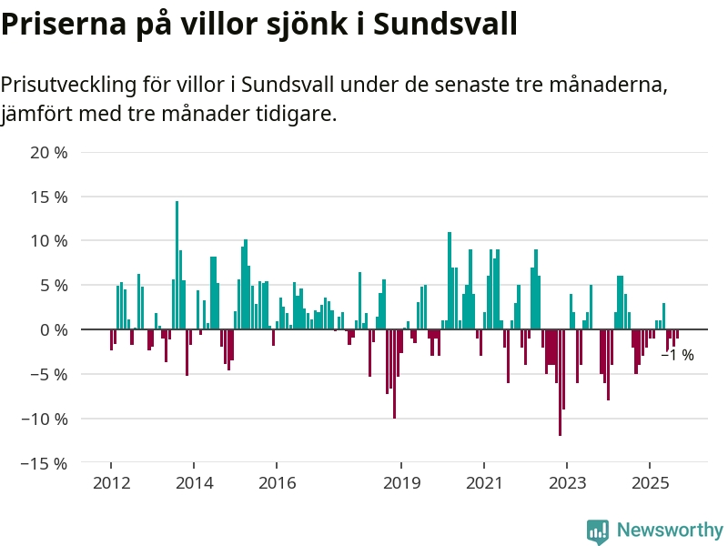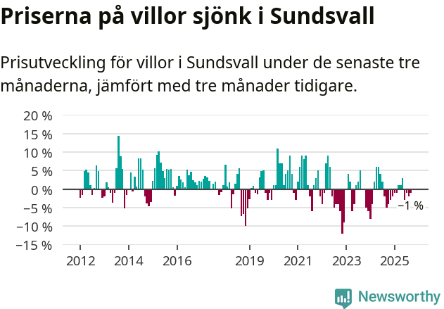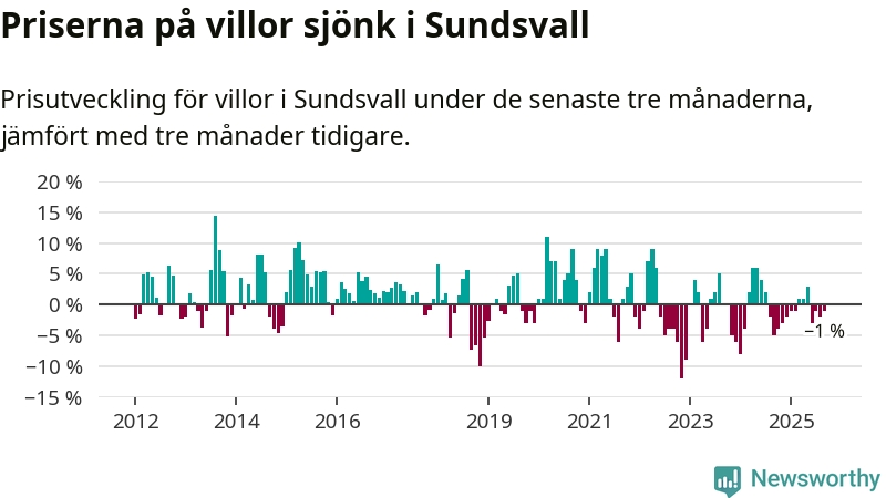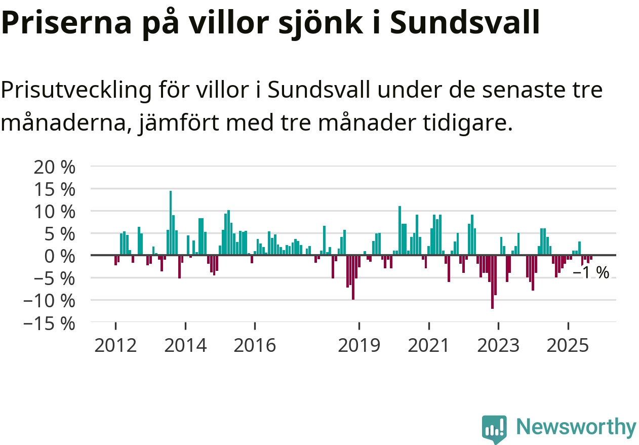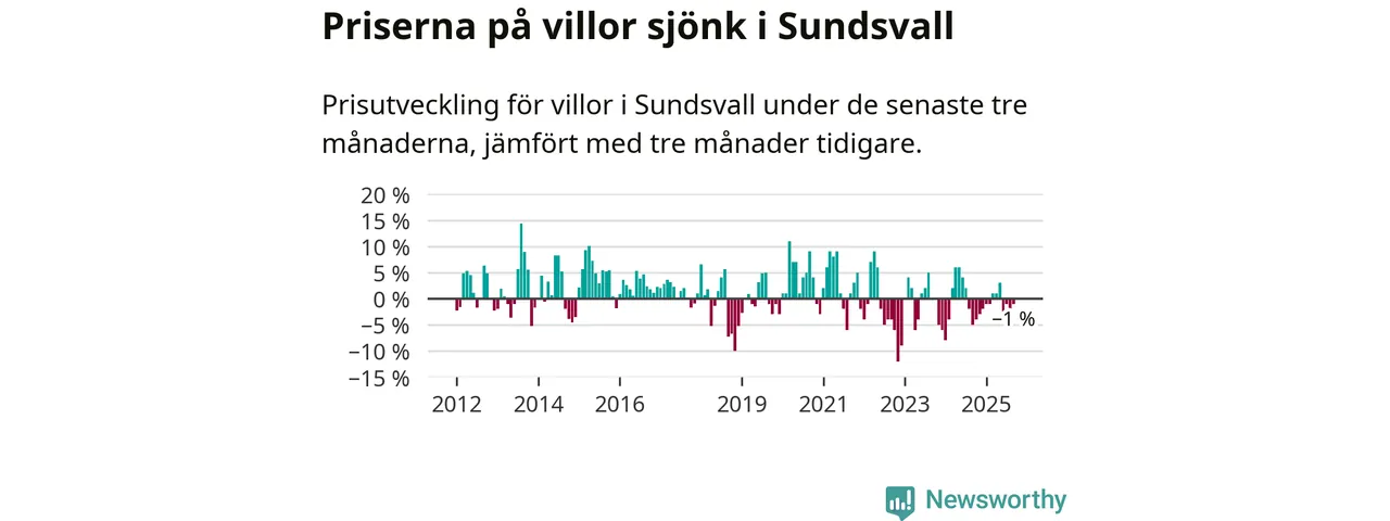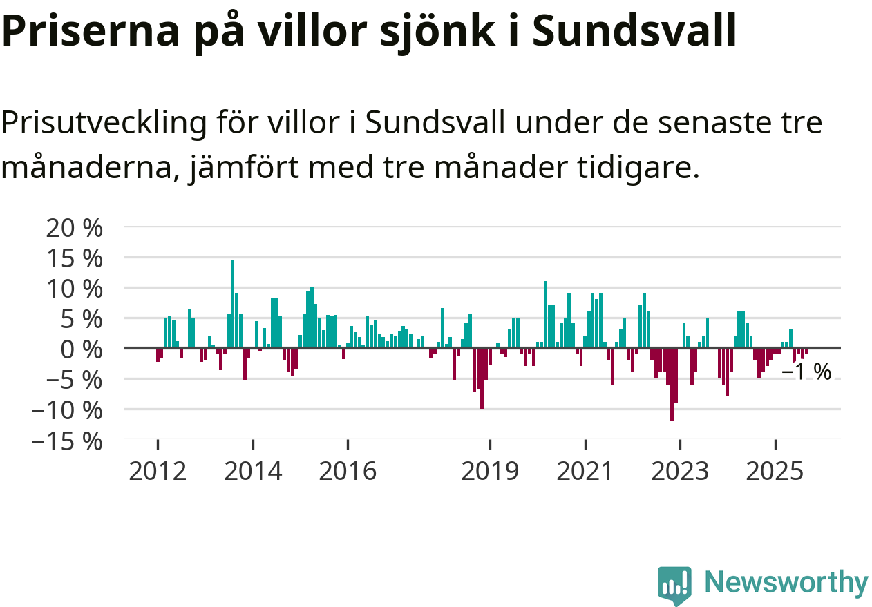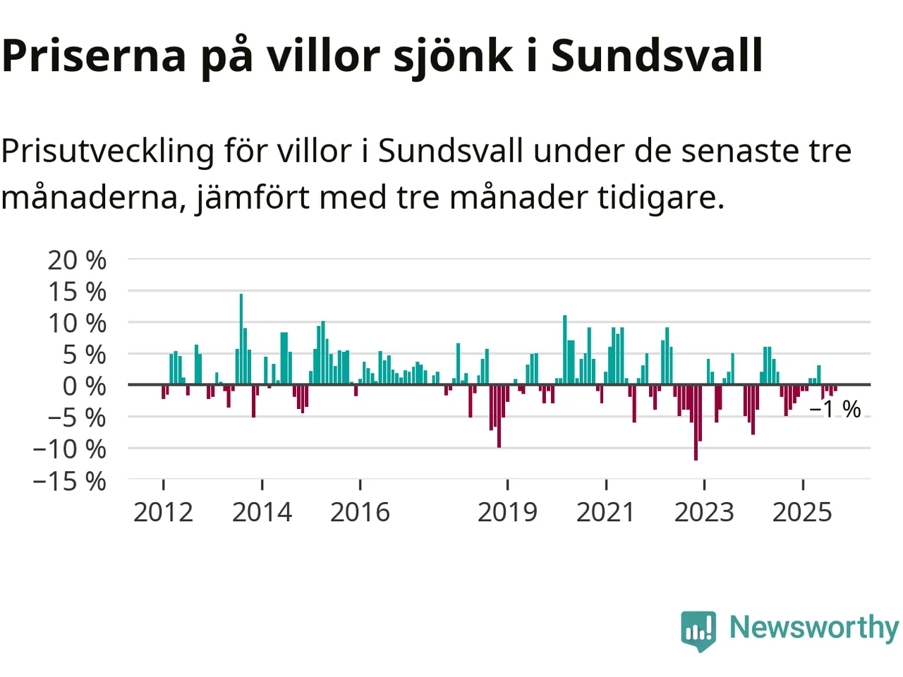 Villapriserna har gått ner i Sundsvalls kommun. Medelpriset på försäljningarna under de senaste tre månaderna visar på en nedgång med 1 procent.