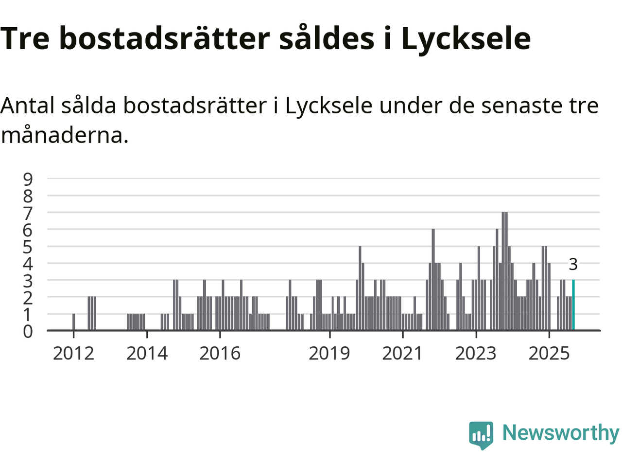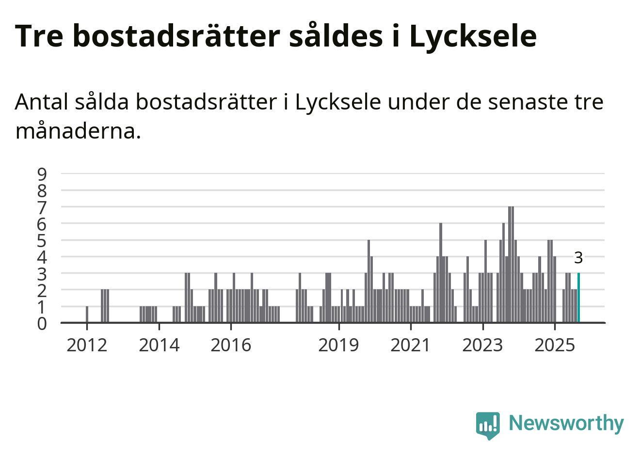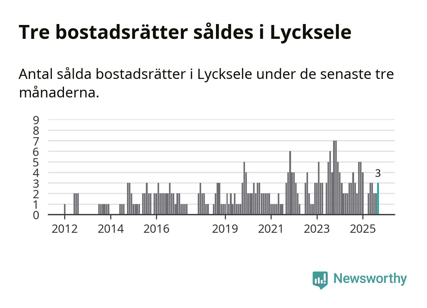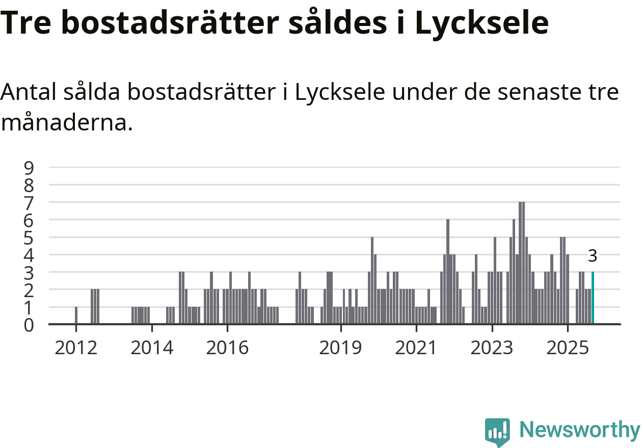 Mellan juli och september gjordes sammanlagt tre affärer med bostadsrätter i Lycksele kommun. Det är lika många affärer som vid motsvarande tid i fjol.