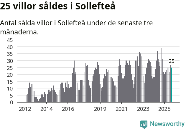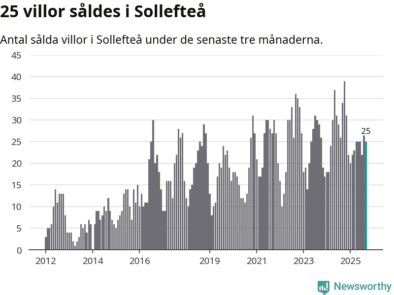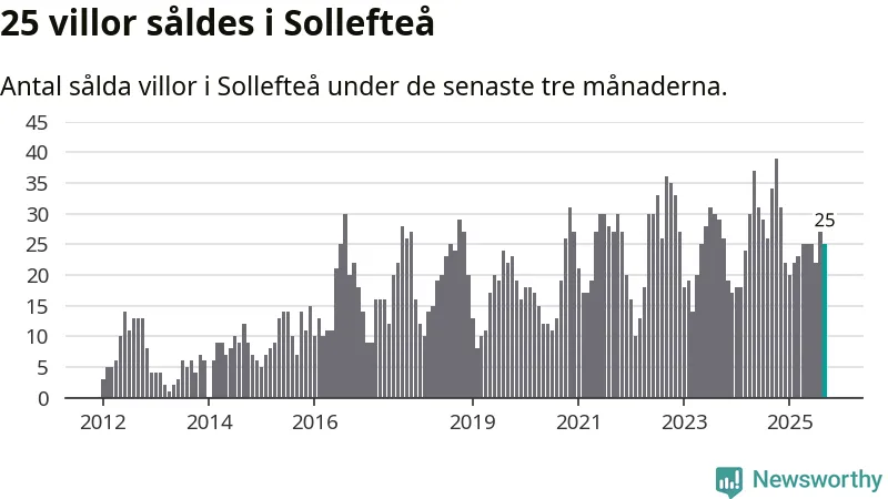 Mellan juli och september såldes 25 villor i Sollefteå kommun. Det är relativt få sett till aktiviteten på bostadsmarknaden i kommunen under de senaste tolv månaderna, samt det historiska snittet för den här tiden på året.