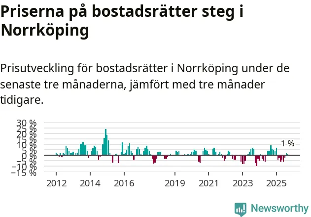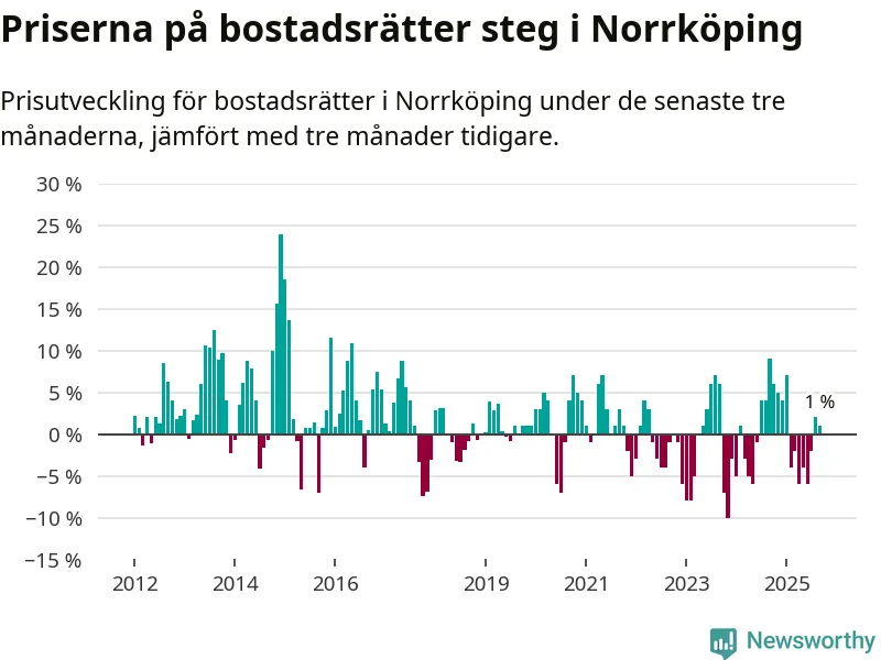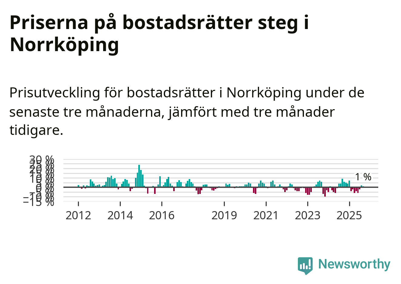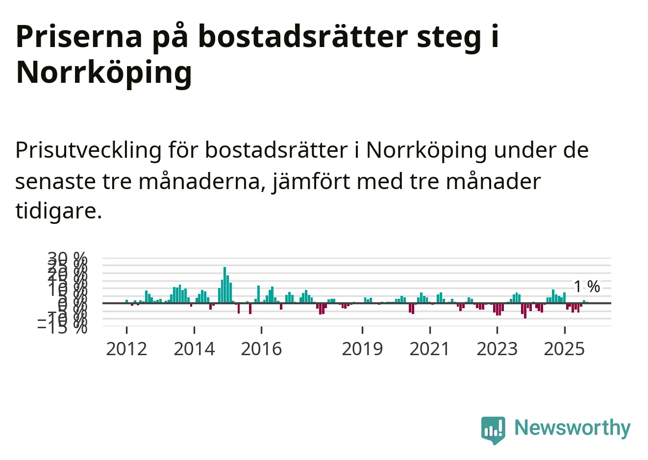 Priserna på bostadsrätter har gått upp i Norrköpings kommun. Medelpriset på försäljningarna under de senaste tre månaderna visar på en uppgång med 1 procent.