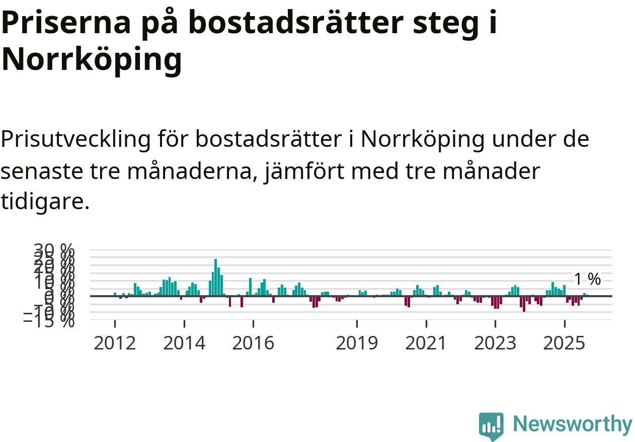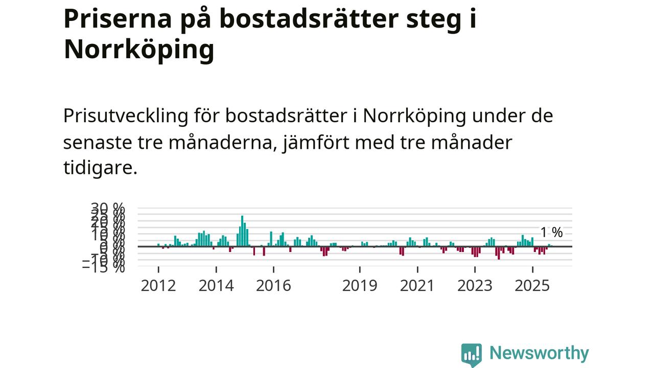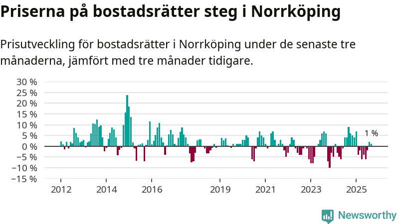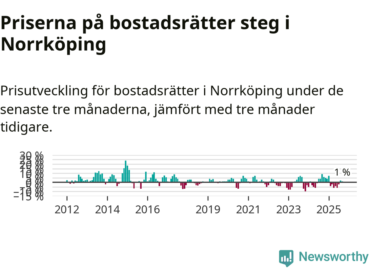 Priserna på bostadsrätter har gått upp i Norrköpings kommun. Medelpriset på försäljningarna under de senaste tre månaderna visar på en uppgång med 1 procent.