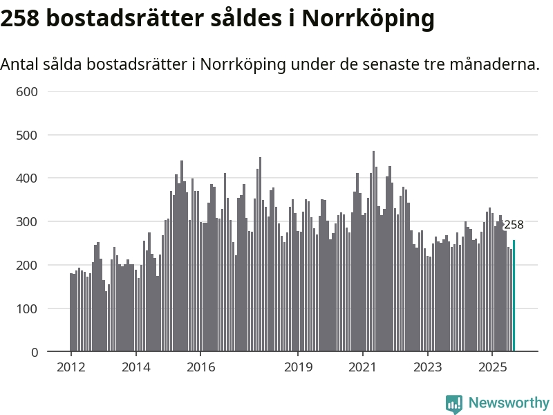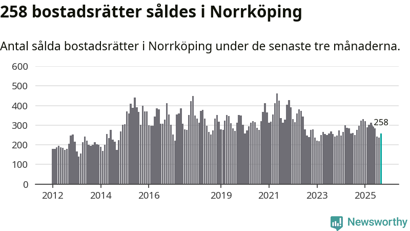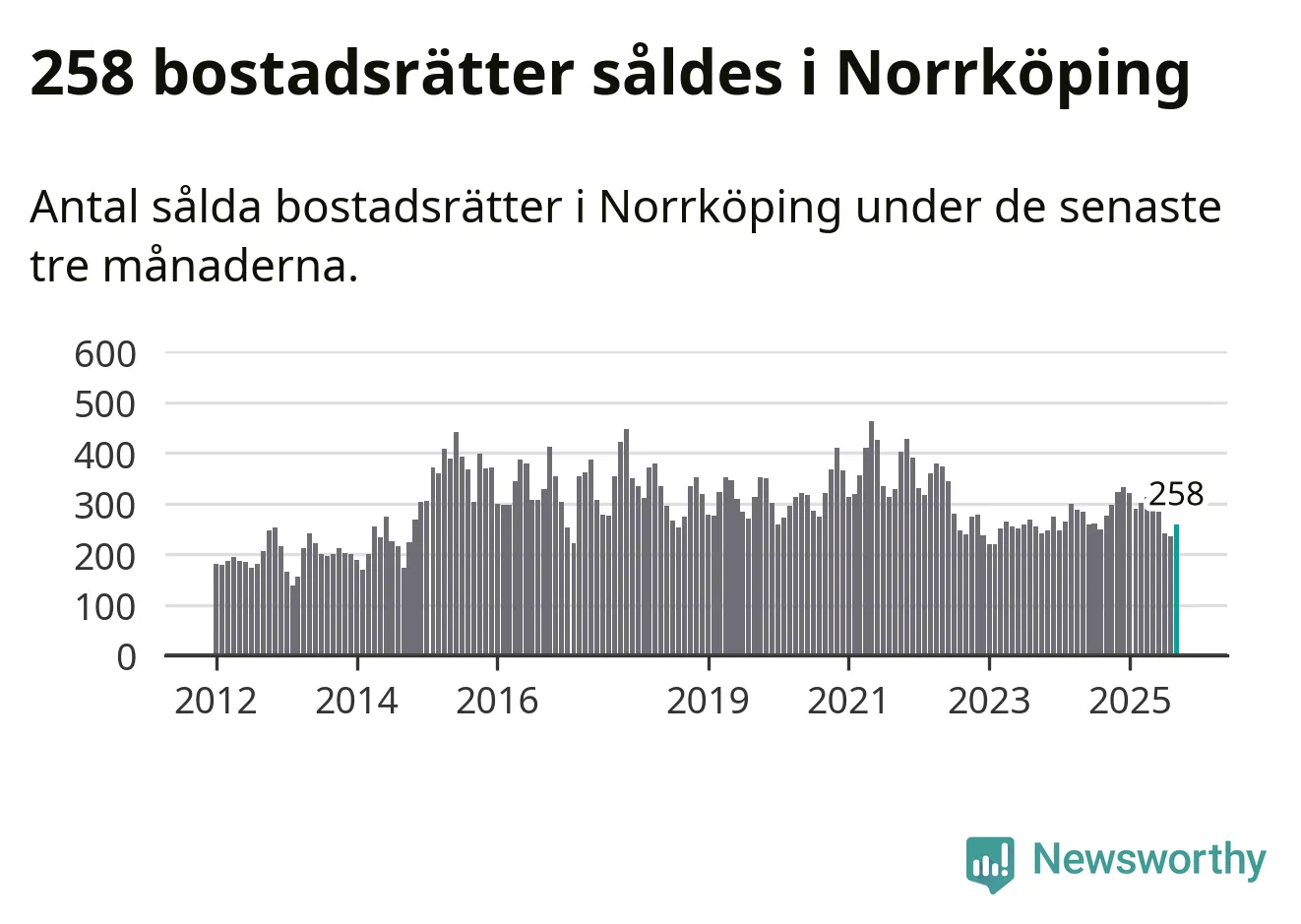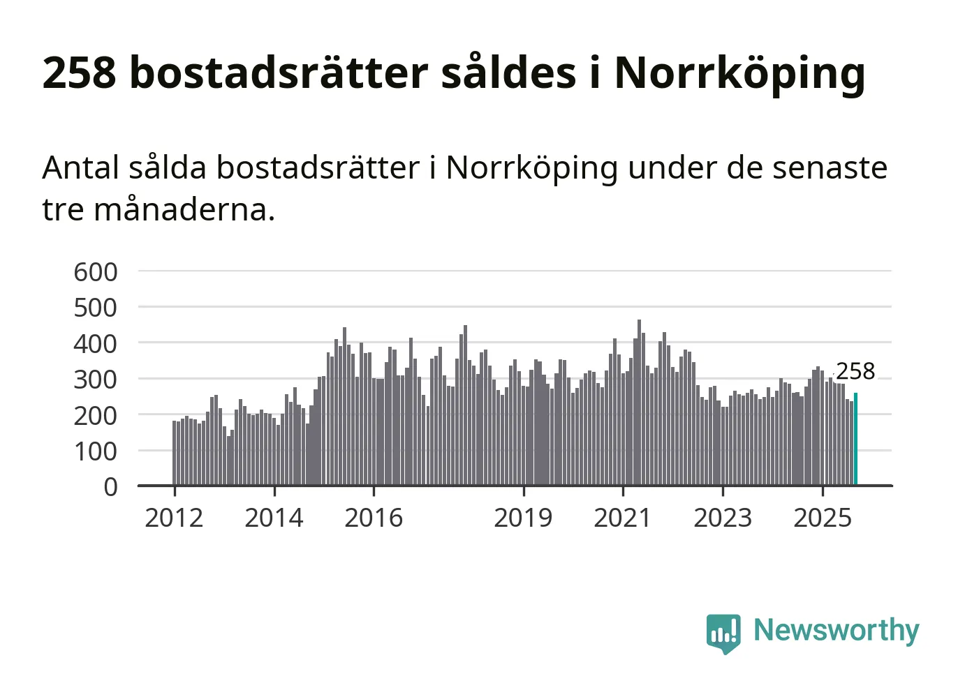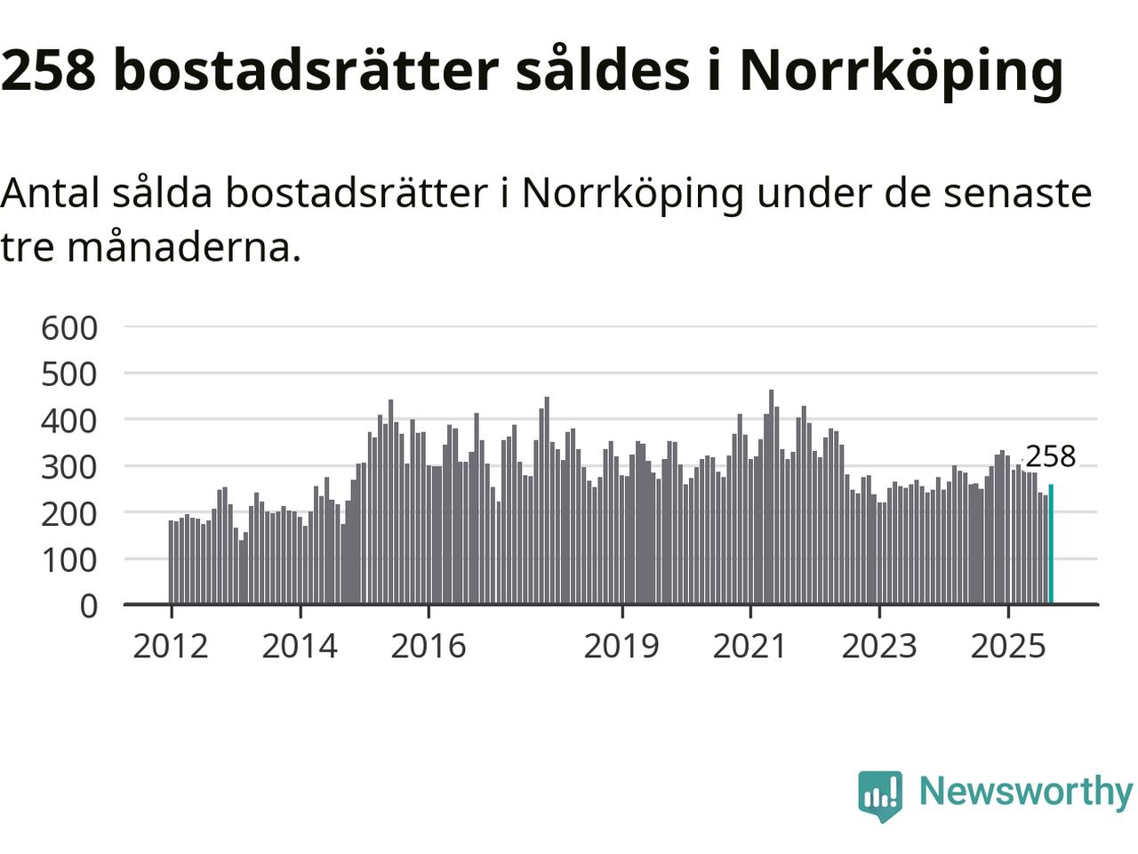 Sammanlagt såldes 258 bostadsrätter i Norrköpings kommun mellan juli och september till ett genomsnittligt pris på 1,7 miljoner kronor. I fjol gjordes 277 affärer vid den här tiden på året.