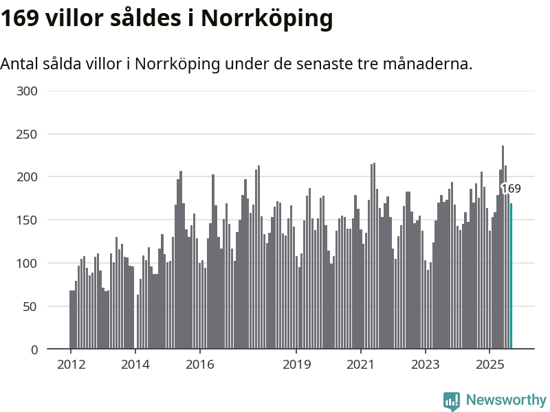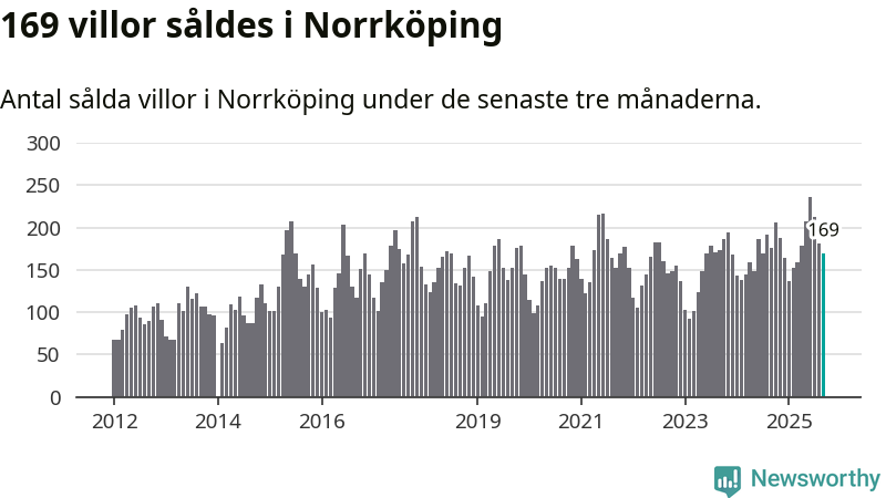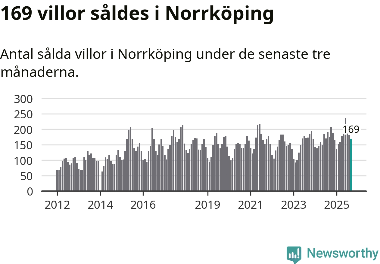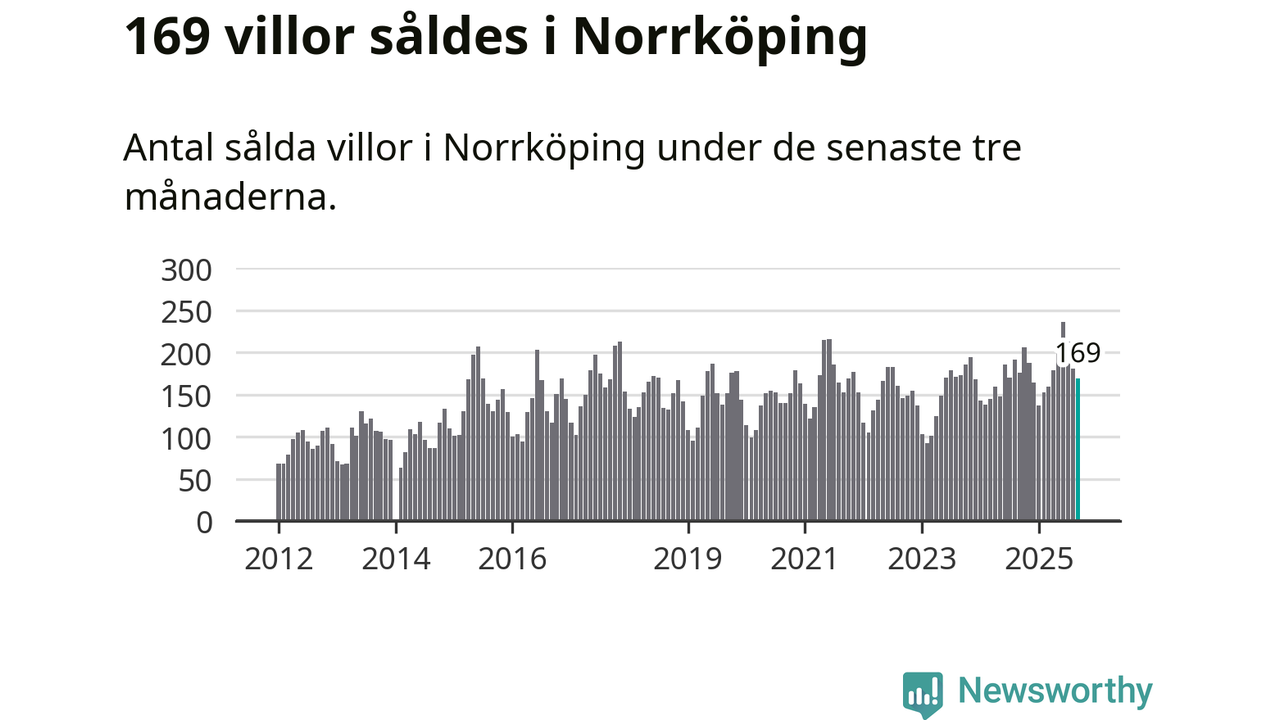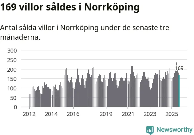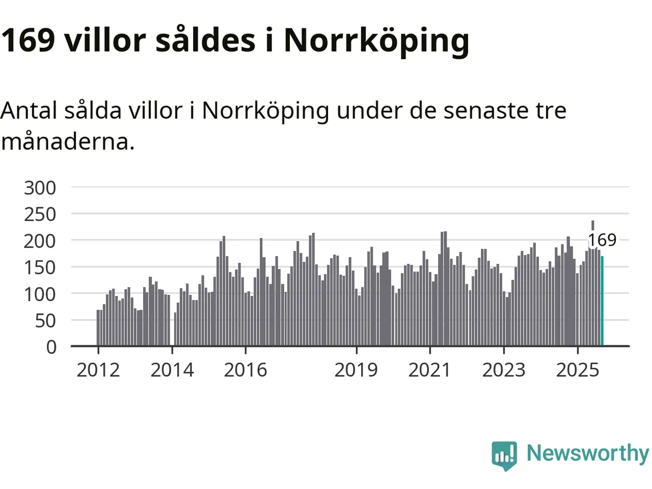 Sammanlagt såldes 169 villor i Norrköpings kommun mellan juli och september till ett genomsnittligt pris på 3,7 miljoner kronor. I fjol gjordes 176 affärer vid den här tiden på året.
